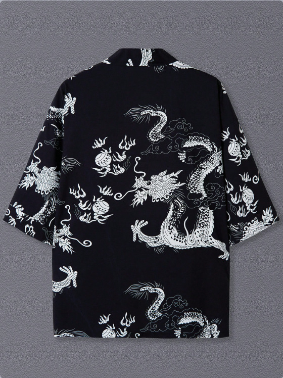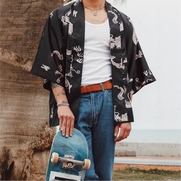 Кимоно хаори, кардиган, уличная мода, японский стиль, с принтом, рукав три четверти, пара, драпировка, тонкое пальто, шаль