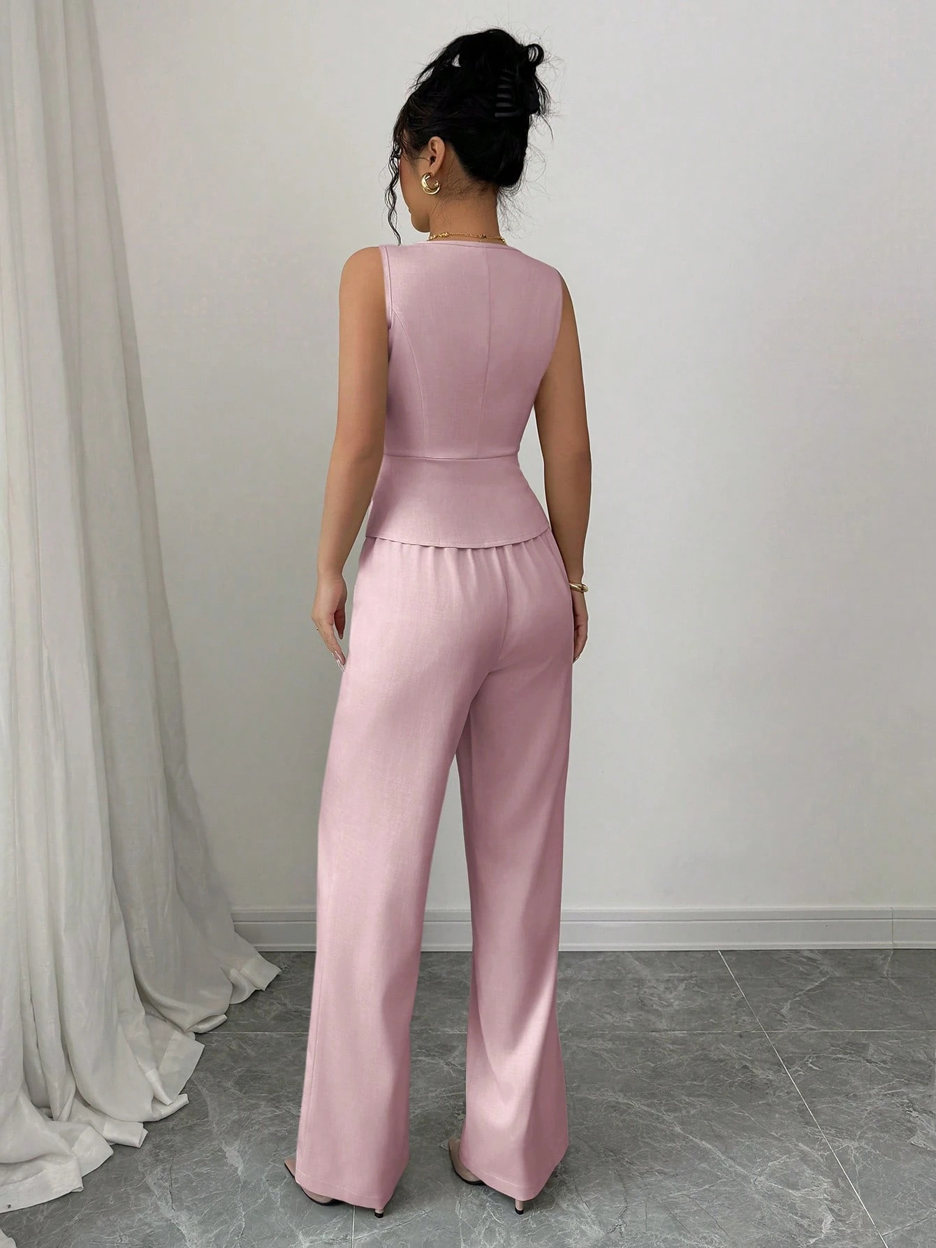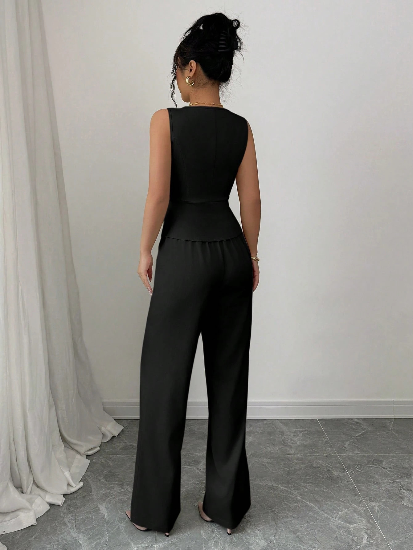 Летний комплект 2025 года: новый европейский и американский женский топ без рукавов и брюки с высокой талией, однотонный, облегающий, двухсоставной набор для женщин.