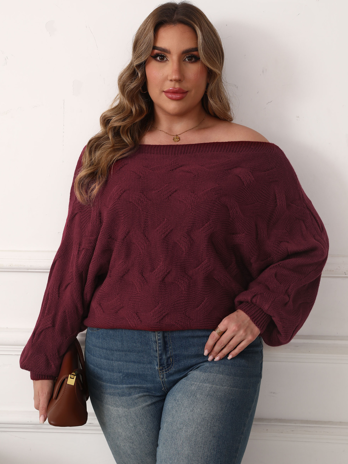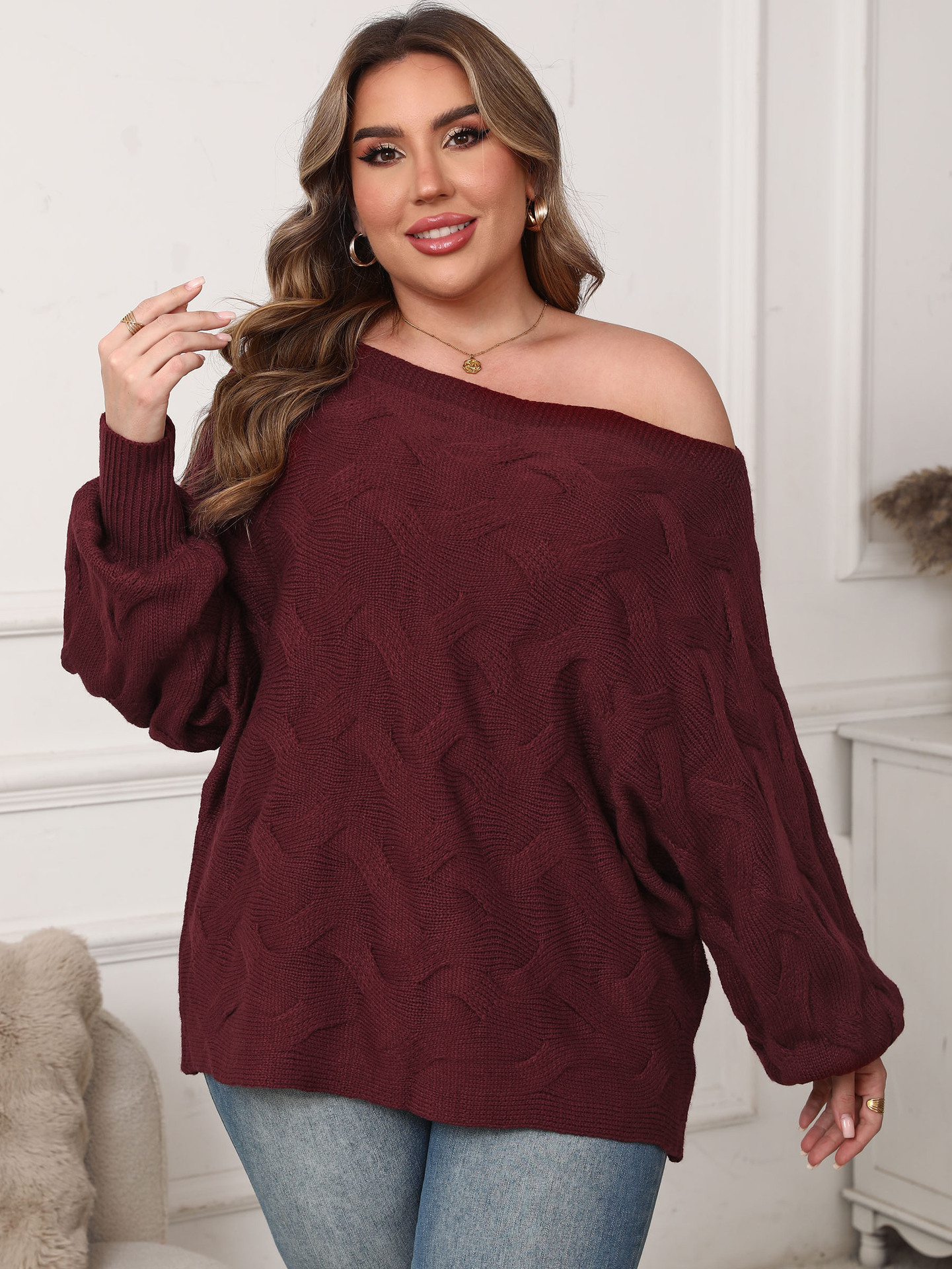 Женская одежда больших размеров, трансграничный европейский и американский сексуальный однотонный воротник с открытыми плечами, нерегулярный топ с рукавами «летучая мышь», свободный пуловер, свитер для женщин