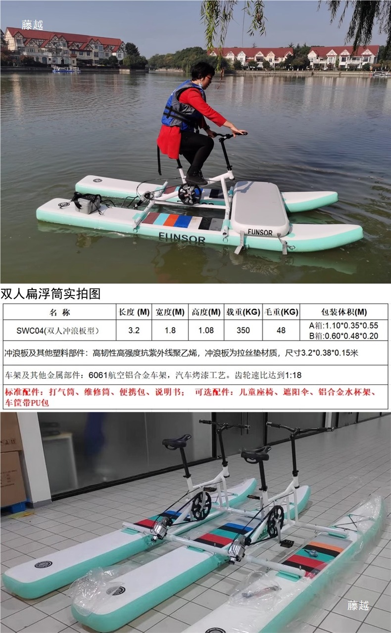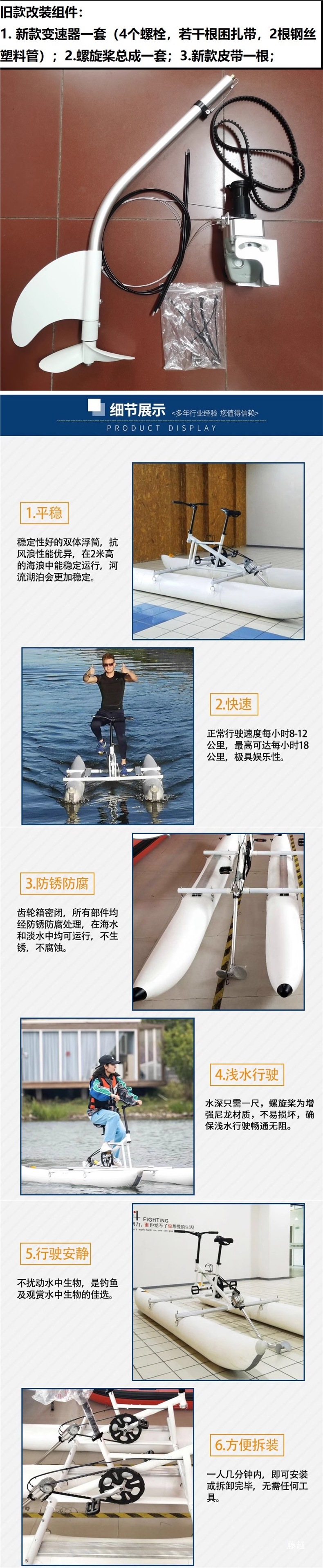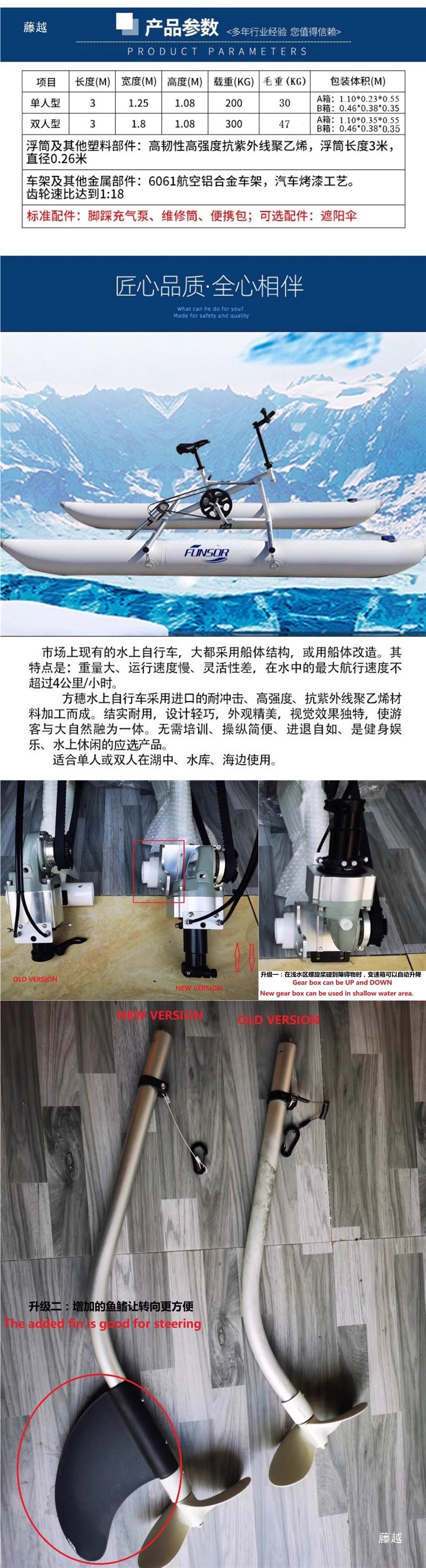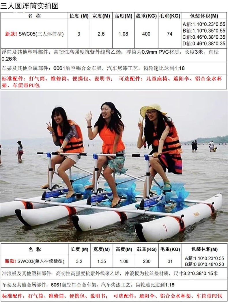 Круглый понтонный водный велосипед (один человек); Круглый понтонный водный велосипед (одинарная синяя рама); Круглый понтонный водный велосипед (двойной); Круглый понтонный водный велосипед (три человека); Водный велосипед в стиле доски для серфинга (одиночный); Водный велосипед на доске для серфинга (двойной); Водный велосипед в стиле доски для серфинга (три человека); Электрический водный велосипед (одиночный); Компоненты гибридной модификации (подходят только для досок для серфинга); Пропеллер в сборе; Трансмиссия в сборе; ремень; Надувной понтон 1 шт.; Поплавок в стиле доски для серфинга, 1 шт.; Одинарная воздушная подушка 125*50*10см.; Двойной надувной матрас 185*50*10см.; Сборка модификации старой модели