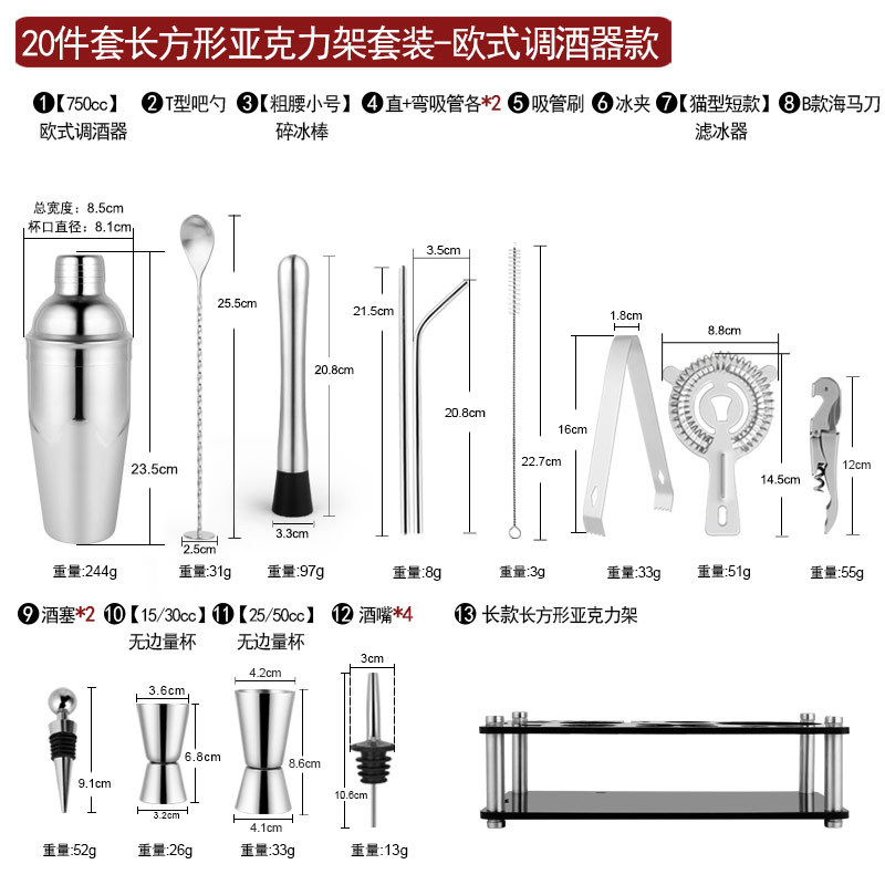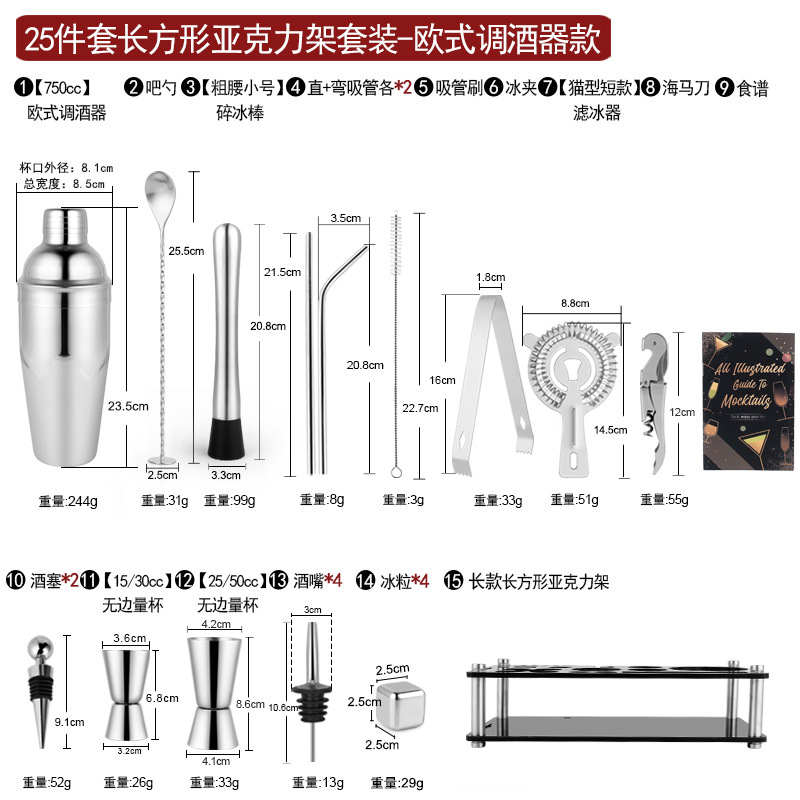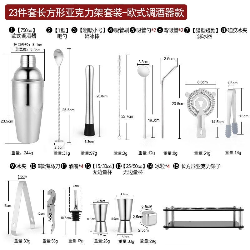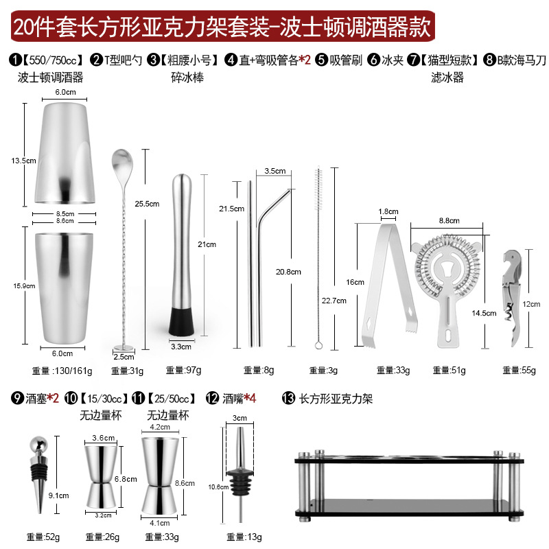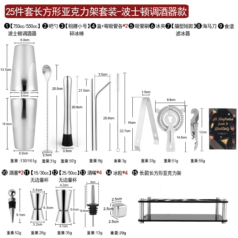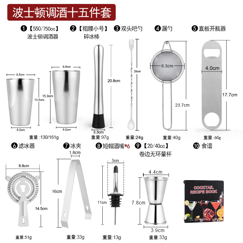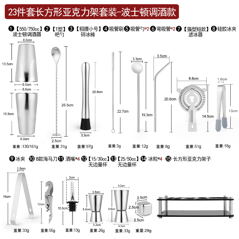 Набор из трех предметов для европейского бармена объемом 750 куб.см.; Набор из пяти предметов для европейского бармена объемом 550 куб.см.; Набор из пяти предметов для европейского бармена объемом 750 куб.см.; Набор из шести предметов для европейского бармена объемом 750 куб.см.; Набор из шести предметов для европейского бармена объемом 750 куб.см с капюшоном; Набор из семи предметов для европейского бармена объемом 750 куб.см.; Набор из восьми соломинок и ложек для европейского бармена объемом 550 куб.см.; Набор из восьми предметов для европейского бармена объемом 750 куб.см.; Набор из 11 предметов для европейского бармена объемом 750 куб.см.; Набор из 12 предметов для европейского бармена объемом 750 куб.см.; Набор для европейского бармена объемом 750 куб.см, 14 предметов.; Набор для европейского бармена объемом 750 куб.см, 22 предмета.; Набор из трех предметов для бармена «Бостон»; Набор из пяти предметов для бармена «Бостон»; Набор из десяти предметов для бармена «Бостон»; Набор для бармена «Бостон», 15 предметов.; Набор для бармена «Бостон», 20 предметов.; Набор для бармена с треугольными чашками из 13 предметов.; Овальная деревянная рама объемом 750 куб.см, набор из 10 предметов.; Овальная деревянная рама объемом 750 куб.см, набор из 12 предметов.; Набор из 13 предметов с прямоугольной деревянной рамой объемом 550 куб.см.; Набор из 14 предметов с прямоугольной деревянной рамой объемом 550 куб.см.; Набор для бармена из акрила, 14 предметов.; Акриловый набор из 20 предметов - Boston Bartending; Акриловый набор из 20 предметов-Европейский бармен; Акриловый набор из 23 предметов - Boston Bartending; Акриловый набор из 23 предметов-Европейский бармен; Акриловый набор из 25 предметов - Boston Bartending; Акриловый набор из 25 предметов-Европейский бармен