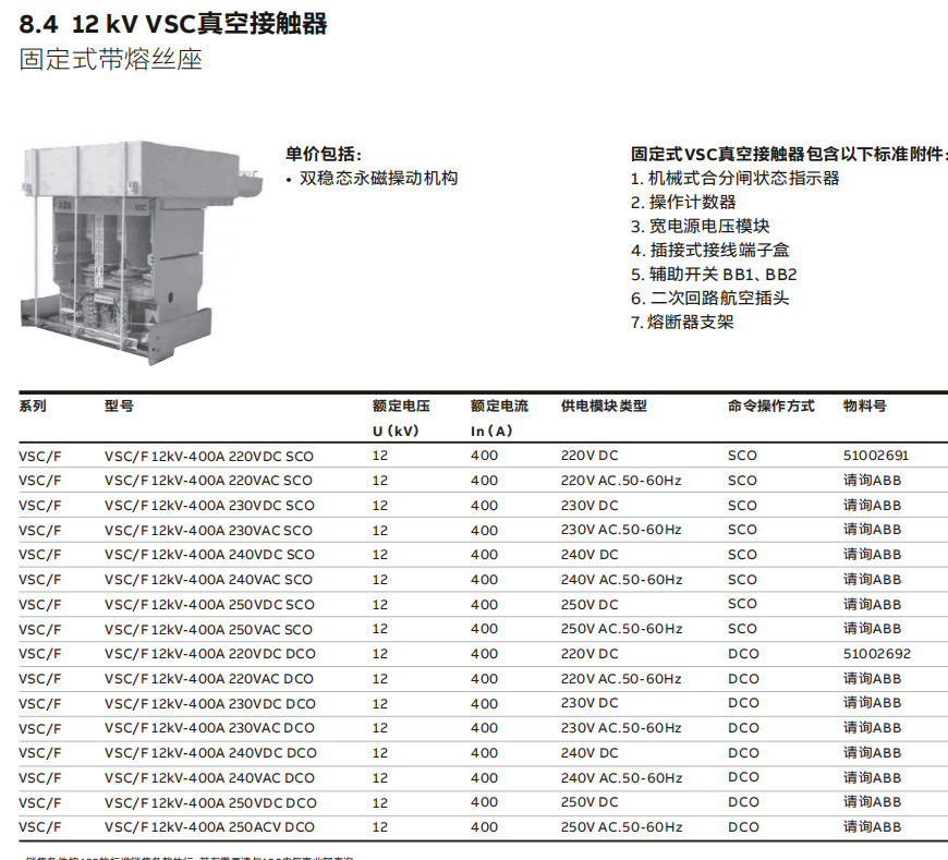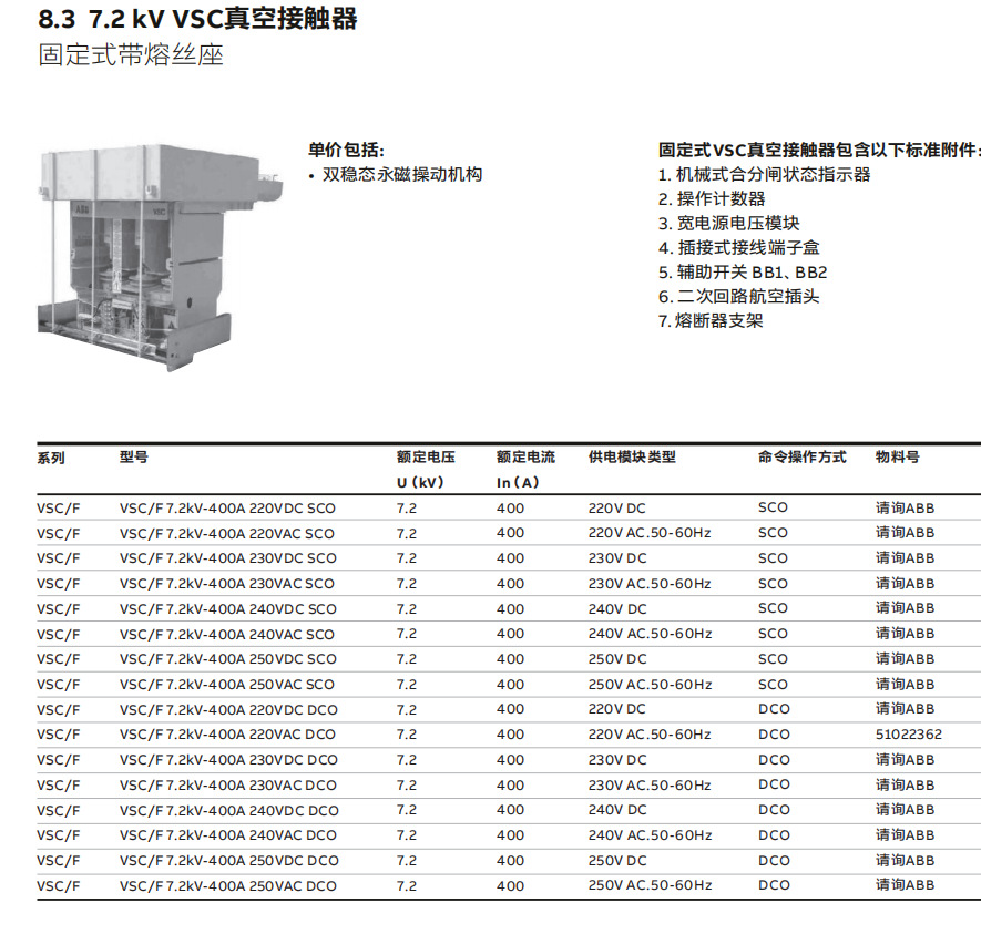 Вакуумный контактор ABB VSC/F 7,2кВ-400А 220В/230В/240В/250В переменного тока SCO DCO
