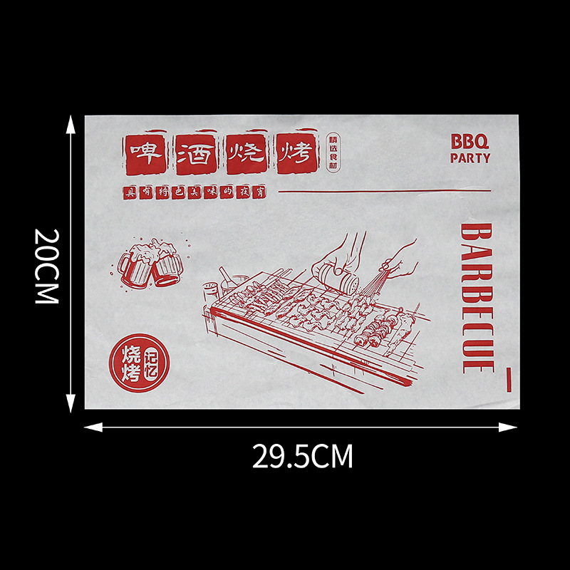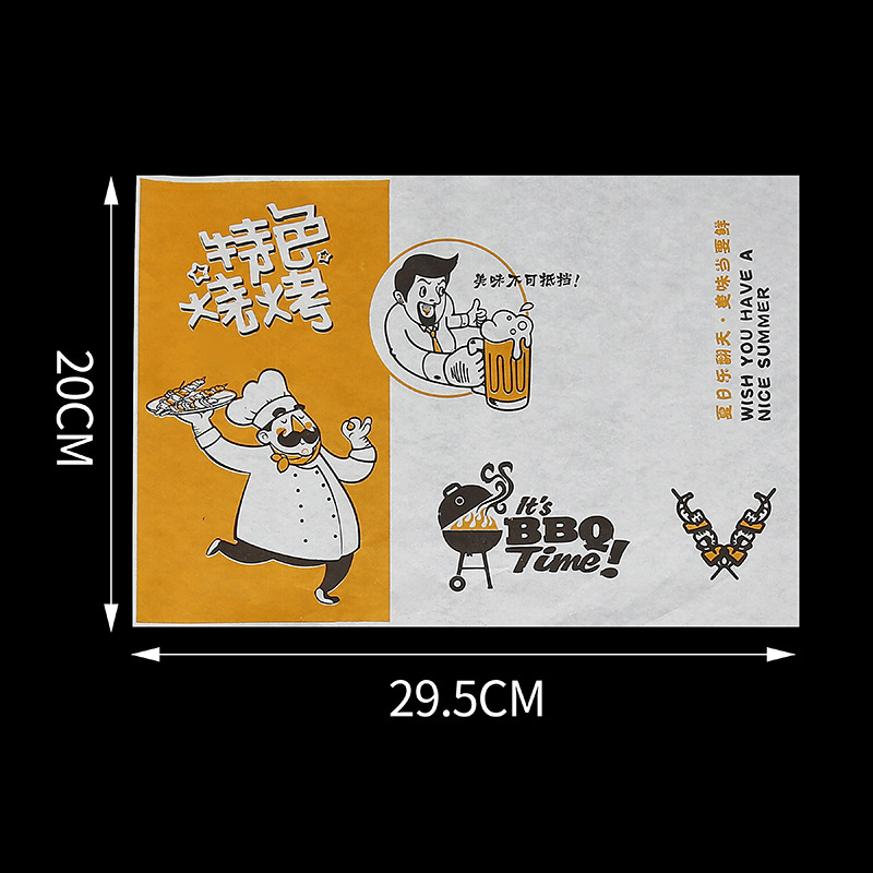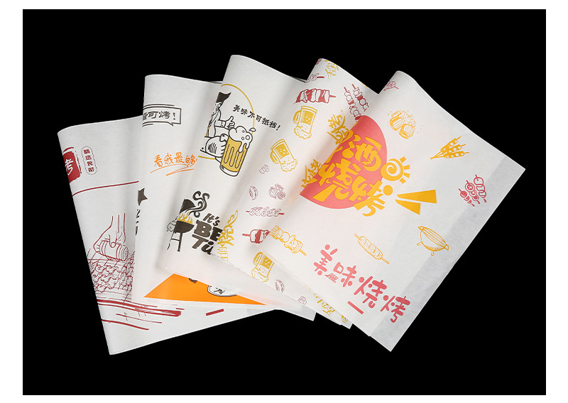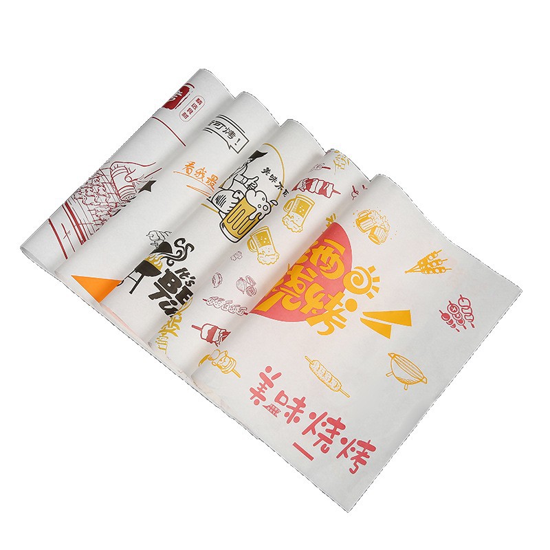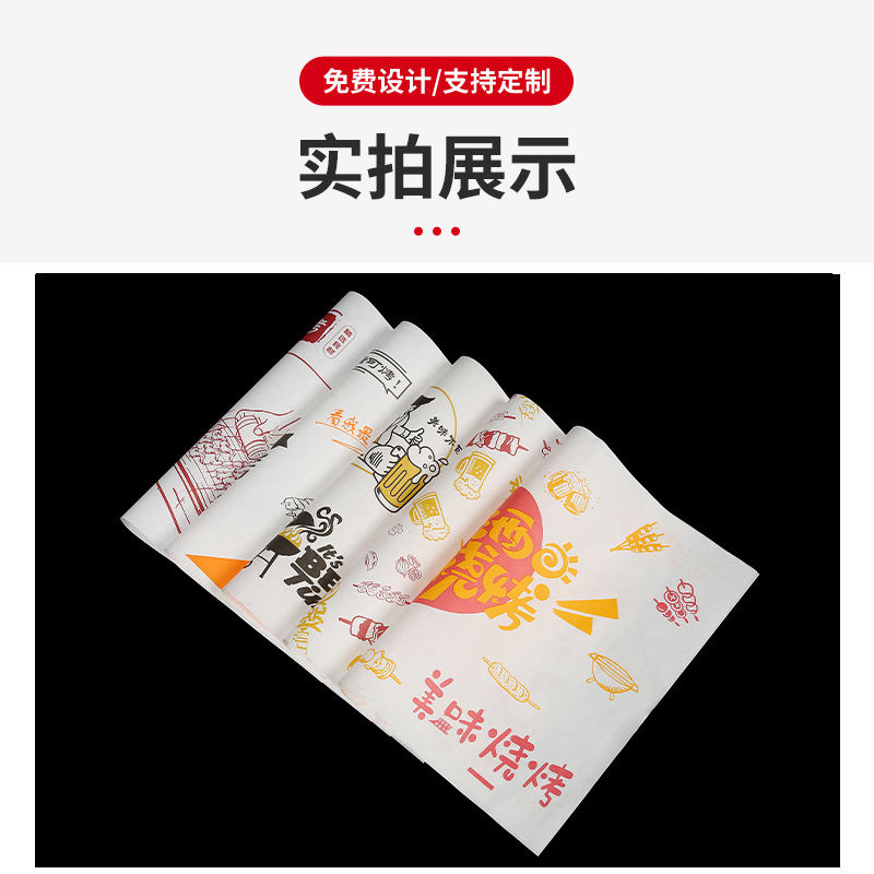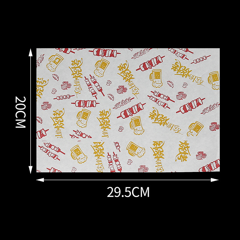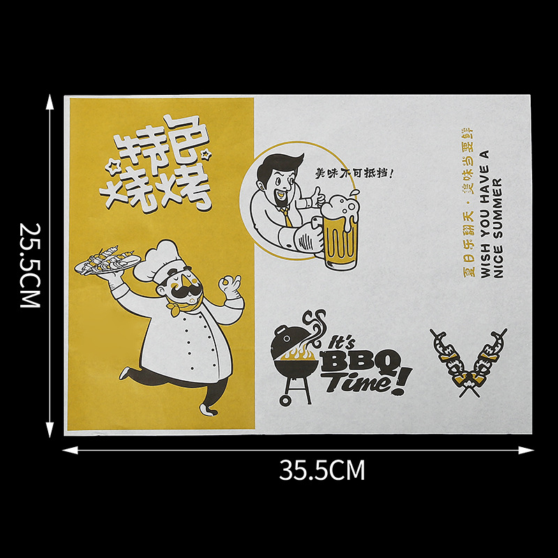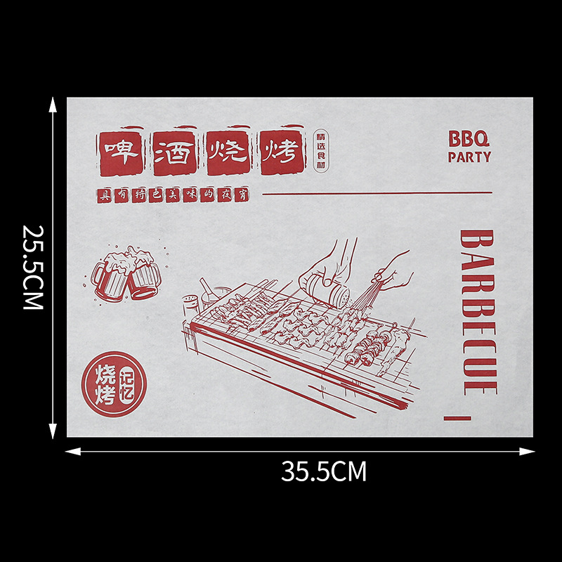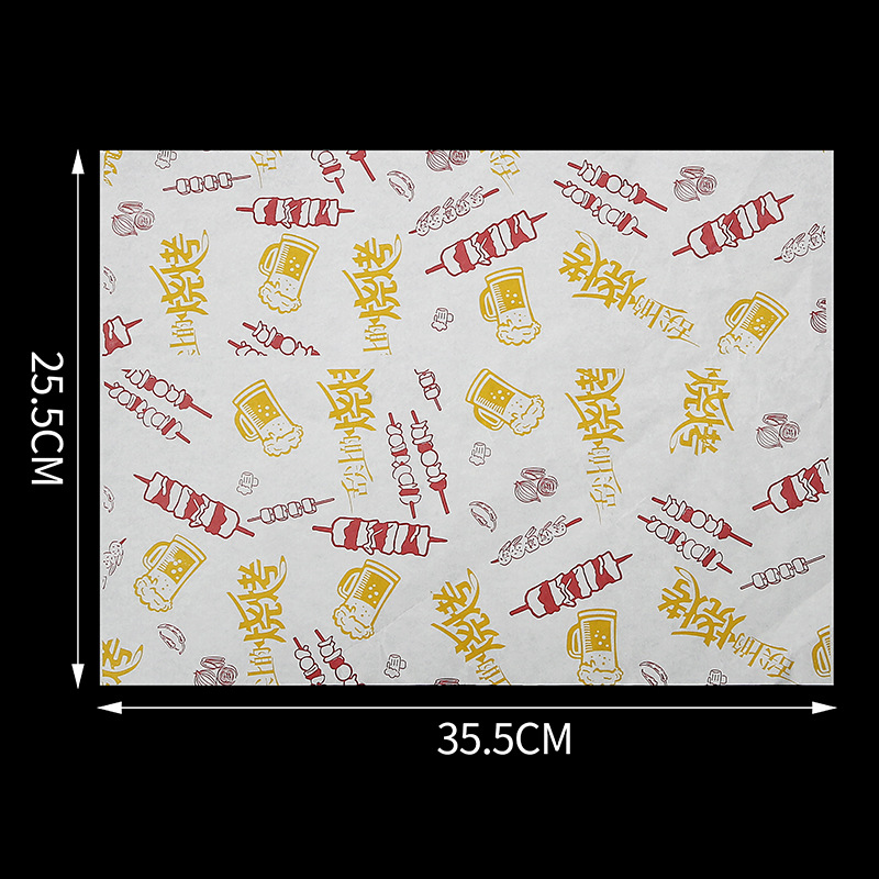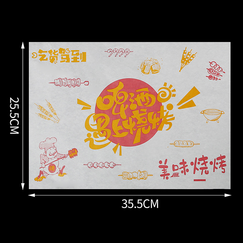 Бумажные подложки для барбекю, одноразовые пищевые маслопоглощающие бумажные шпажки, жареные маслостойкие лотки, бумага с печатью, мелованная бумага, индивидуальный заказ
