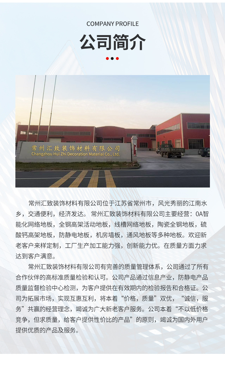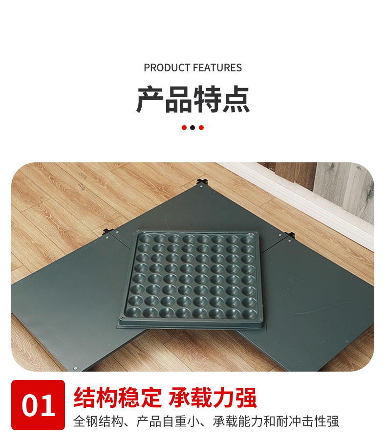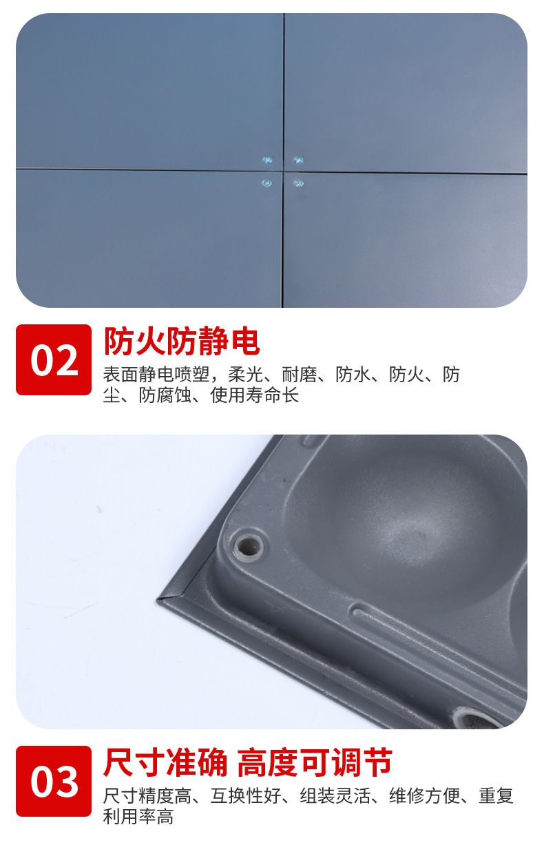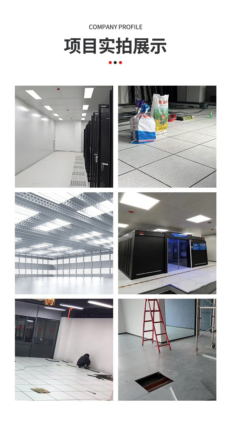 полный жесткий пол из ПВХ; Керамический пол (белый цвет слоновой кости); Сетевой пол OA500; Шестигранный пол из стальной сетки; Электростатический пол из сульфата кальция (32 мм); Электростатический пол из алюминиевого сплава; Стеновые панели для компьютерного зала