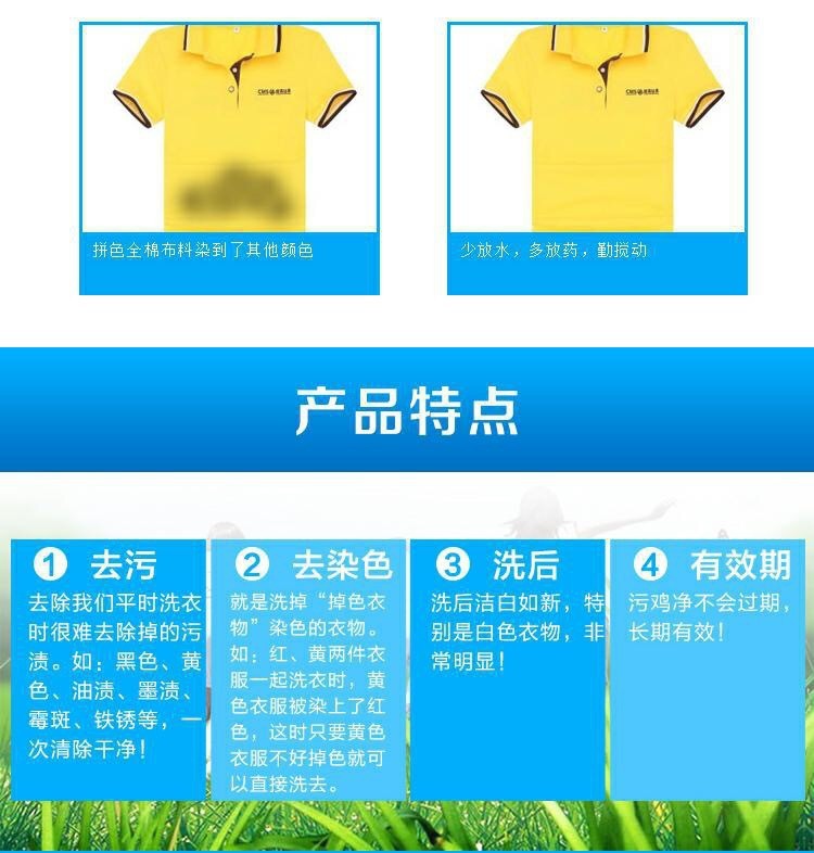 注意:本产品并不能保证100%有效,放够用量大部分污啧可漂洗去除。深色易掉色衣物、羽绒服、牛仔裤皮衣、蕾丝、真丝、羊绒毛衣类等厚纺织衣物不宜漂洗哦。