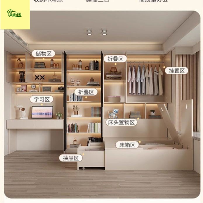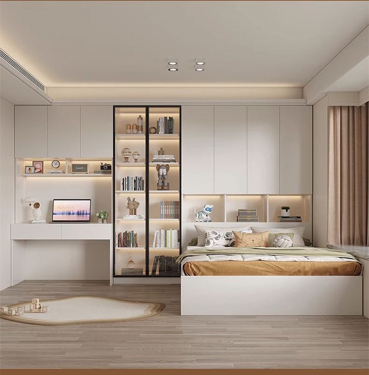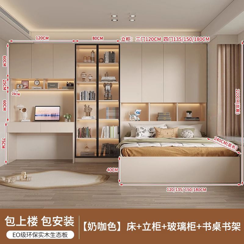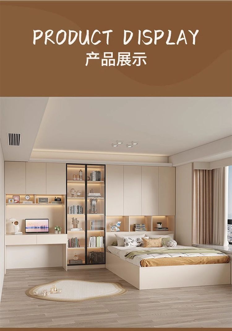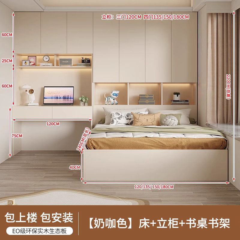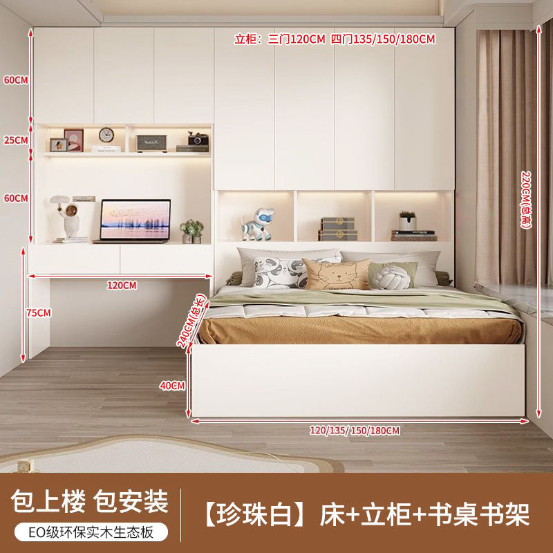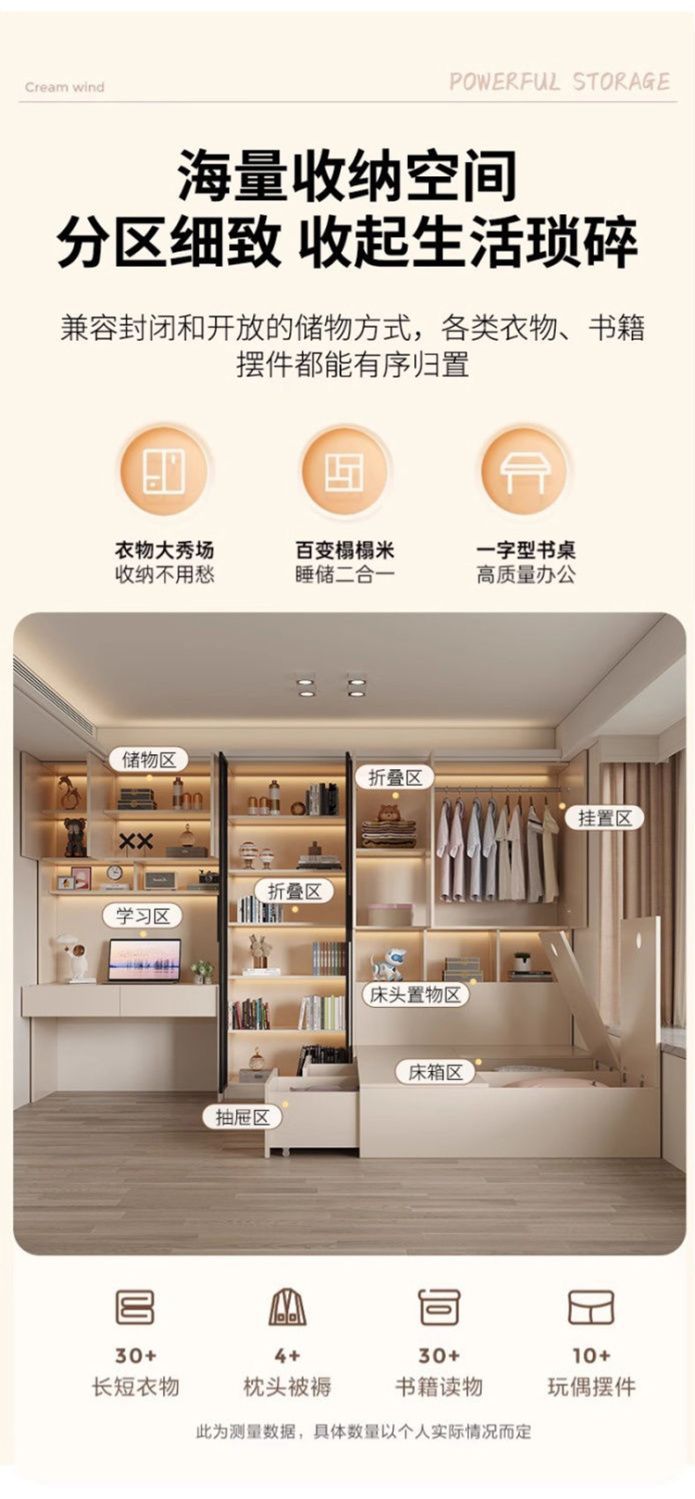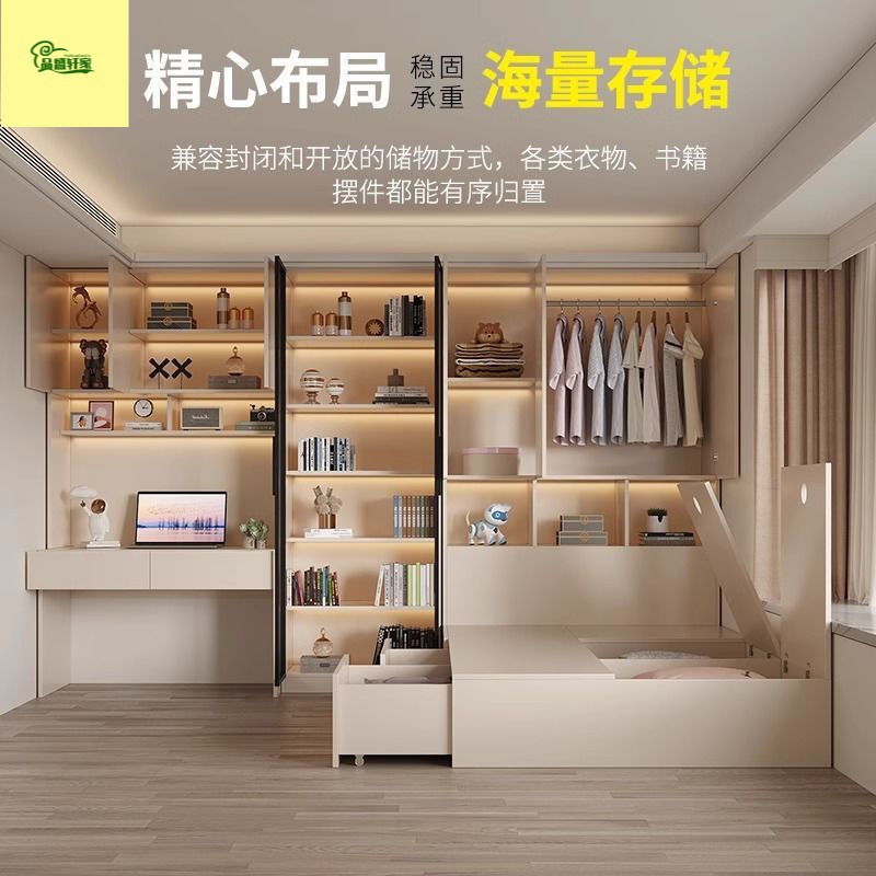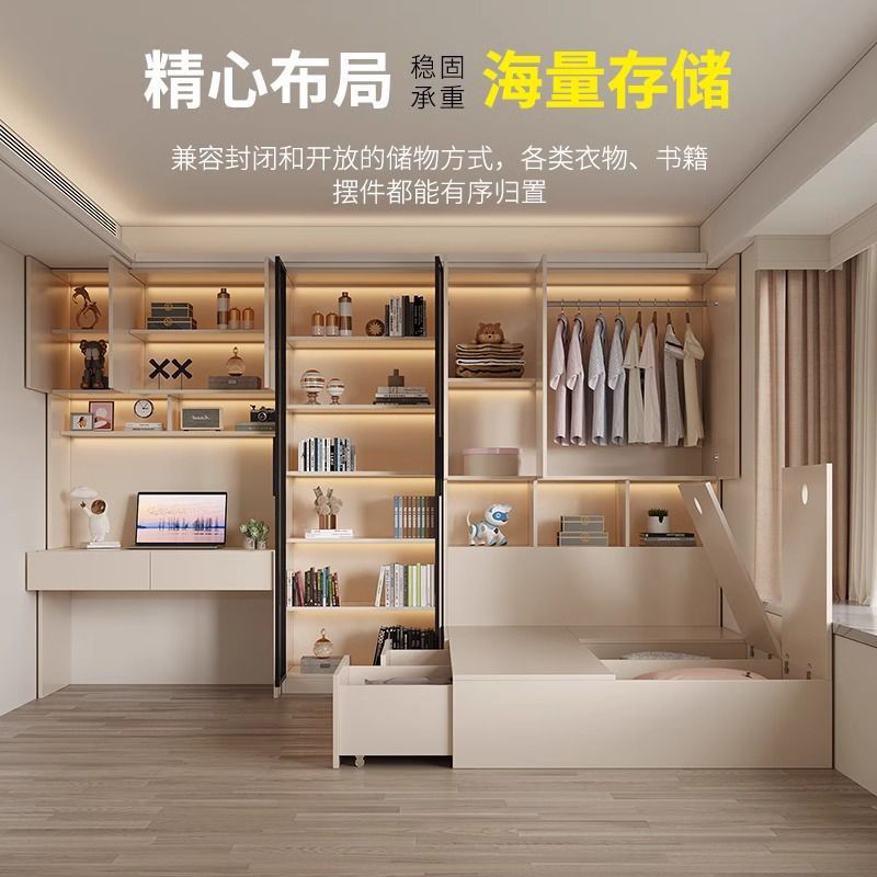 Комбинированный гарнитур для маленькой квартиры: кровать-шкаф из массива дерева, детская кровать, письменный стол, гардеробная, татами и встроенный шкаф.