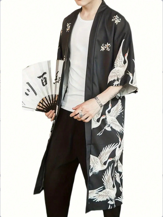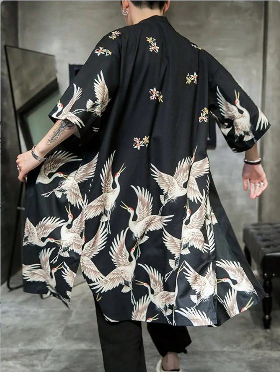 Кимоно-кардиган хаори в японском стиле, весенне-летний кран, цифровая печать, тонкое пальто средней длины с разрезом, солнцезащитная куртка