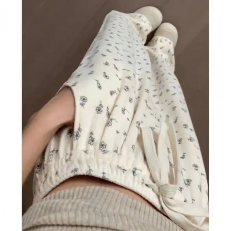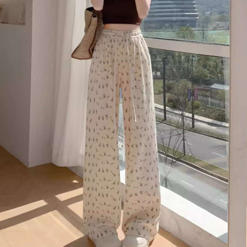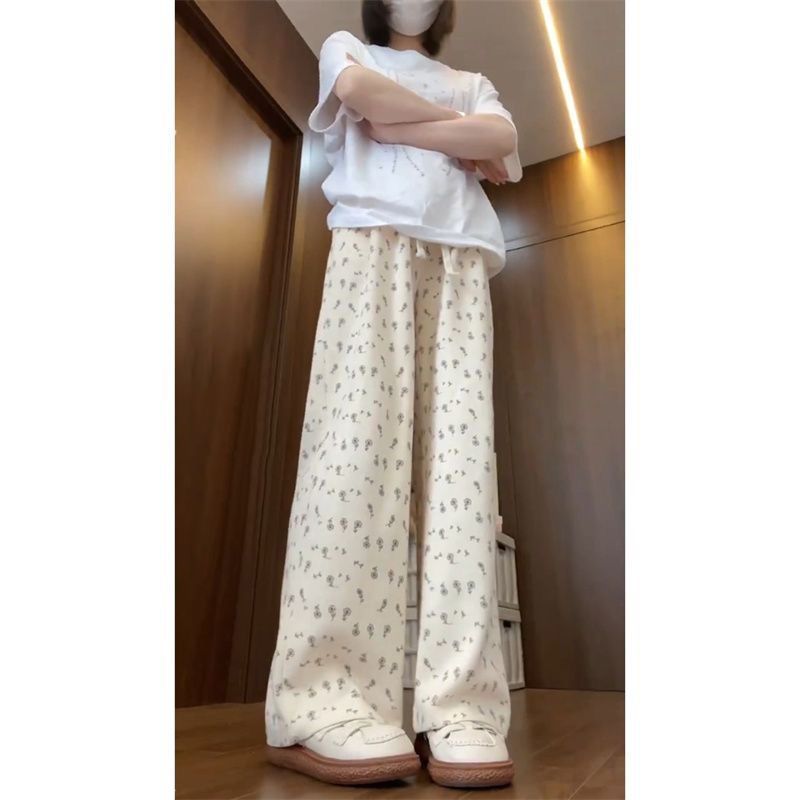 Новые летние брюки из ледяного шелка с цветочным принтом в корейском стиле для учащихся средних и старших классов, свободные прямые повседневные миниатюрные широкие брюки