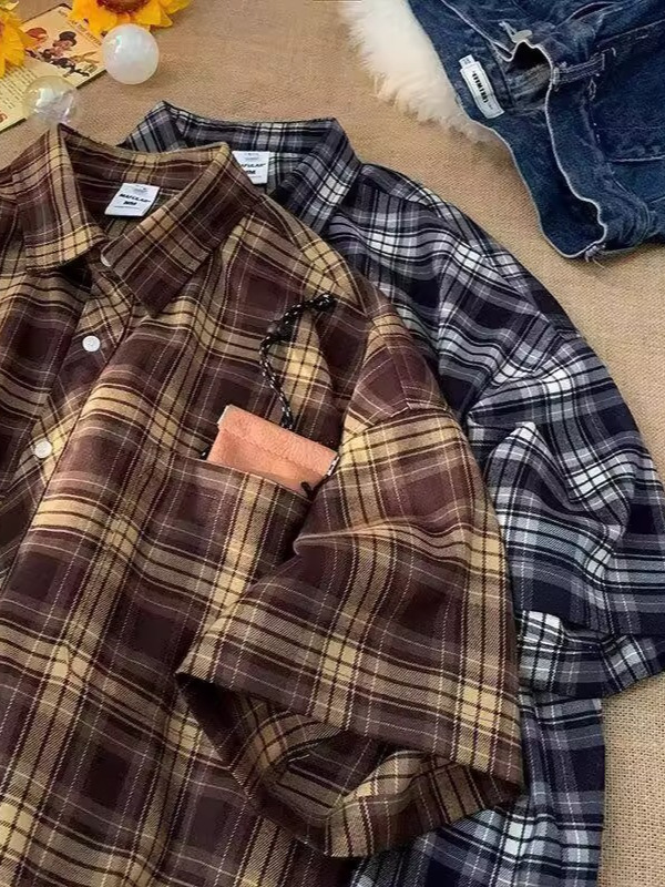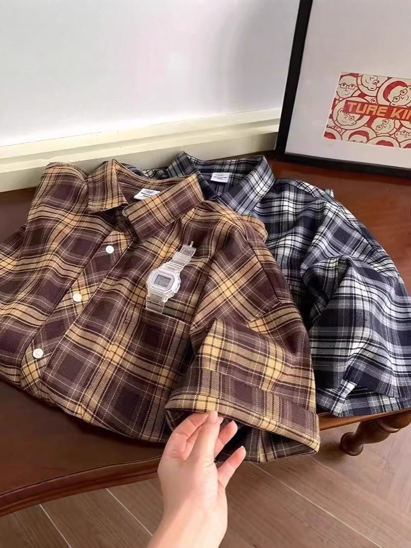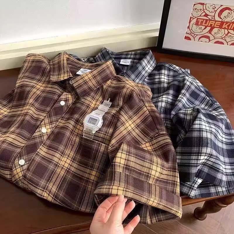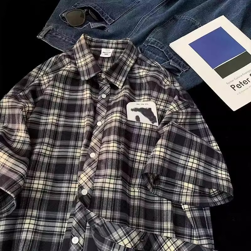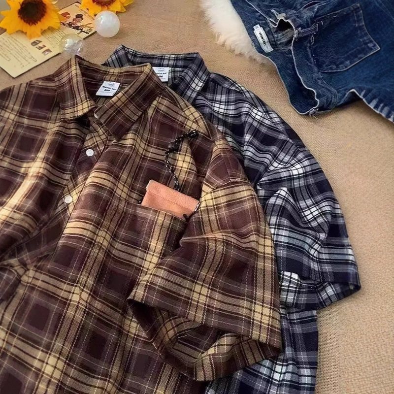Американские клетчатые рубашки с короткими рукавами в стиле ретро для мужчин и женщин, летние свободные повседневные рубашки с четвертью рукавов, топы для рубашек High Street Cross-Border