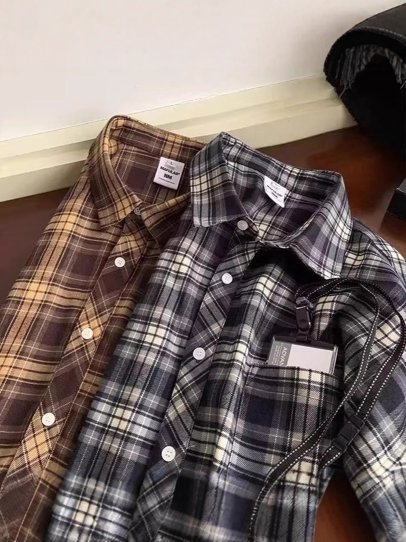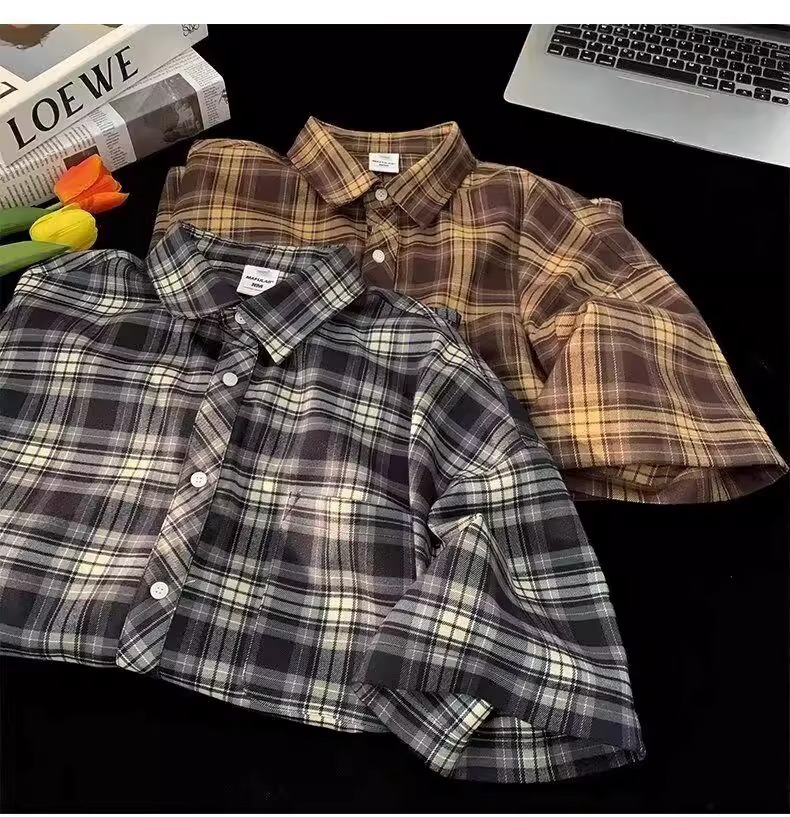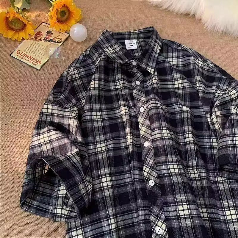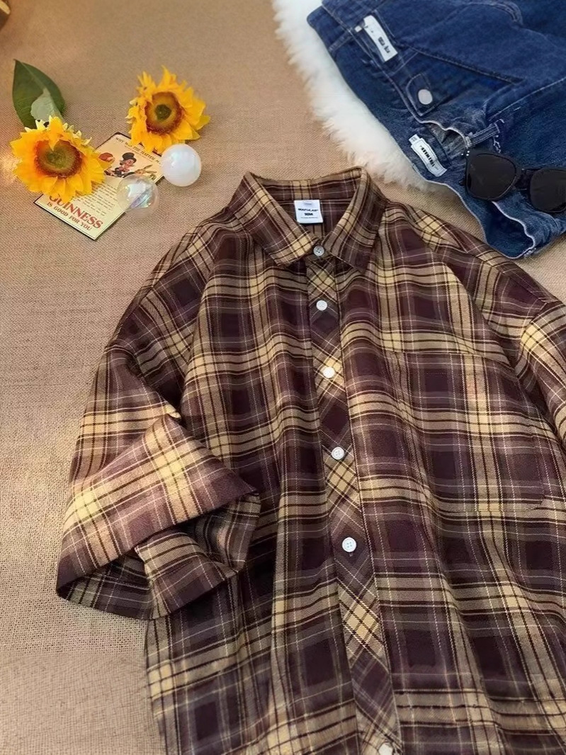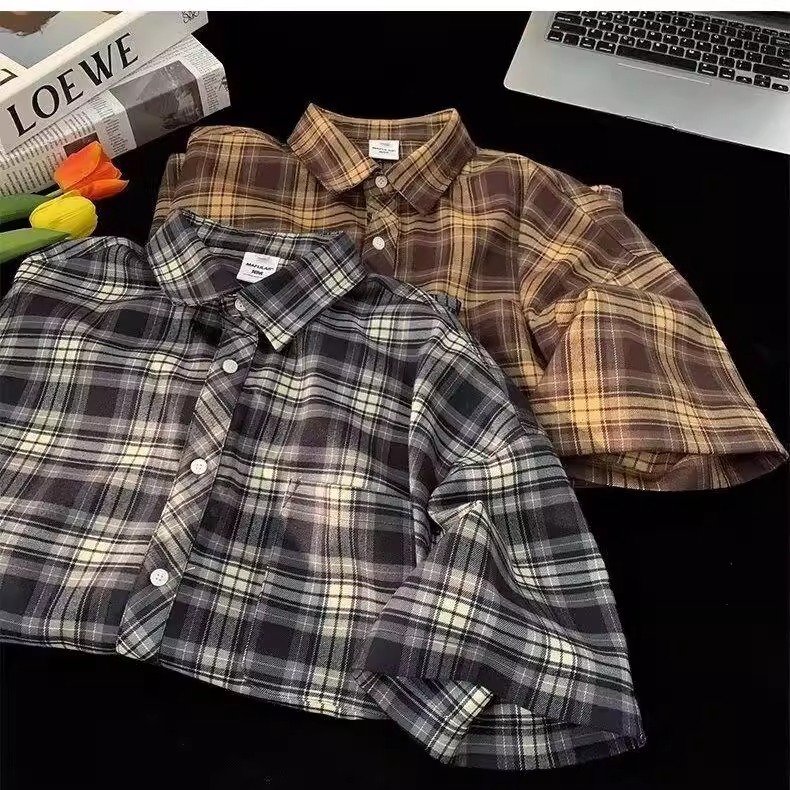 Американские клетчатые рубашки с короткими рукавами в стиле ретро для мужчин и женщин, летние свободные повседневные рубашки с четвертью рукавов, топы для рубашек High Street Cross-Border
