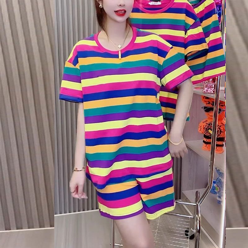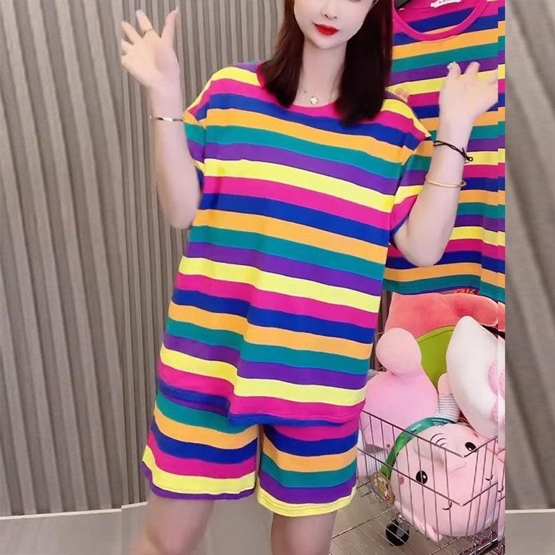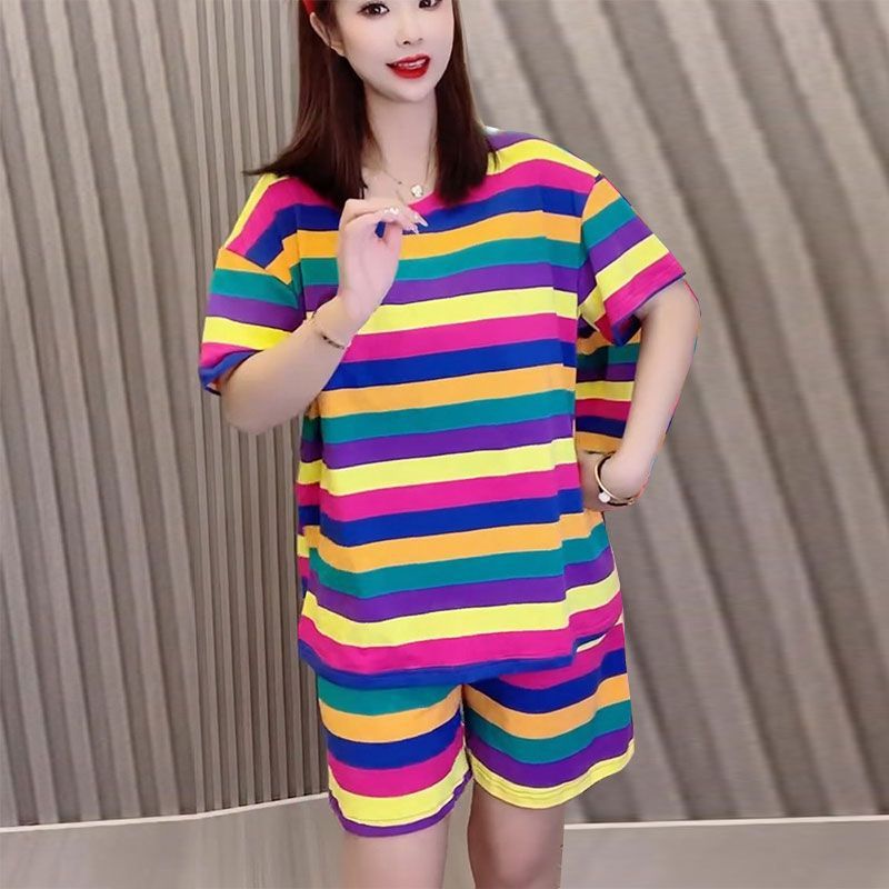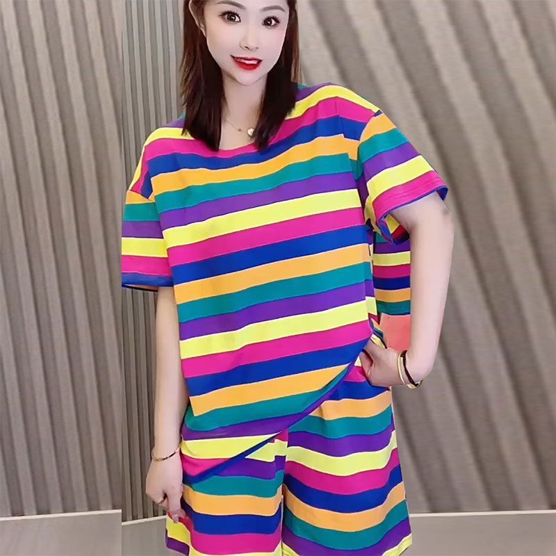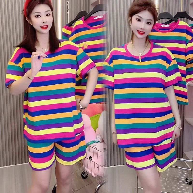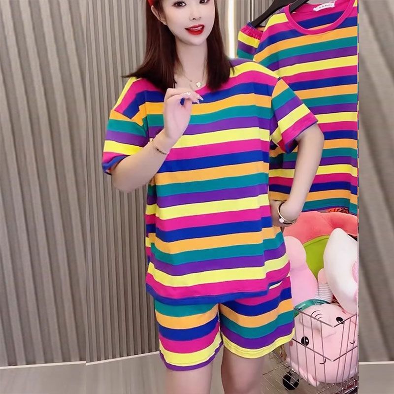 Летние женские пижамы, комплект из двух предметов, свободные полосатые брюки больших размеров, повседневная спортивная одежда для отдыха, модная одежда