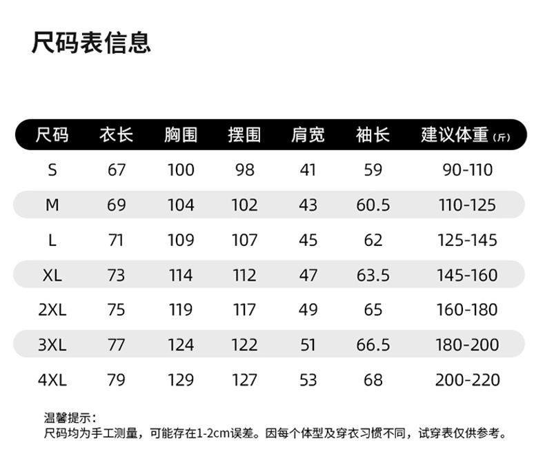 С【90-100】; М【100-120】; Л【120-140】.; ХЛ [140-160]; XXL【160-180】; XXXL【180-200】.; 4XL [200-215]