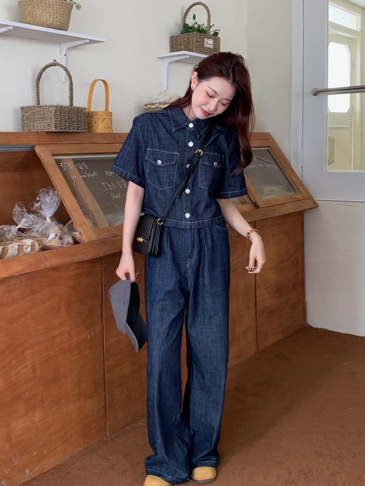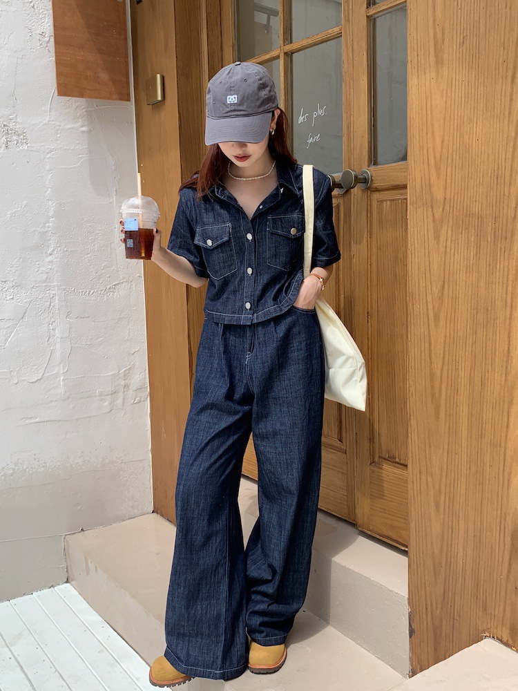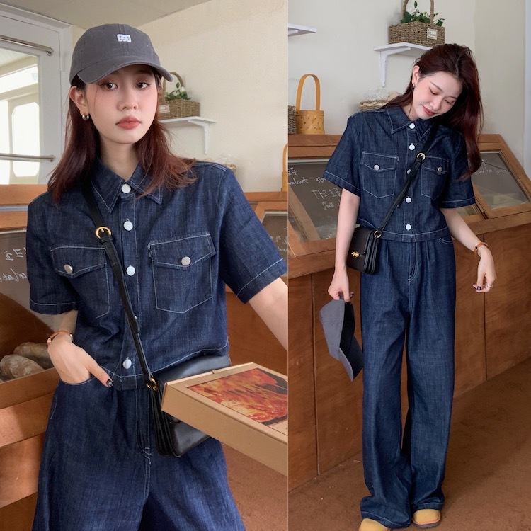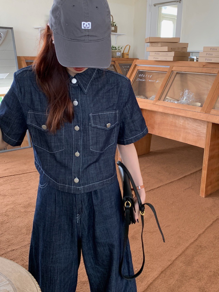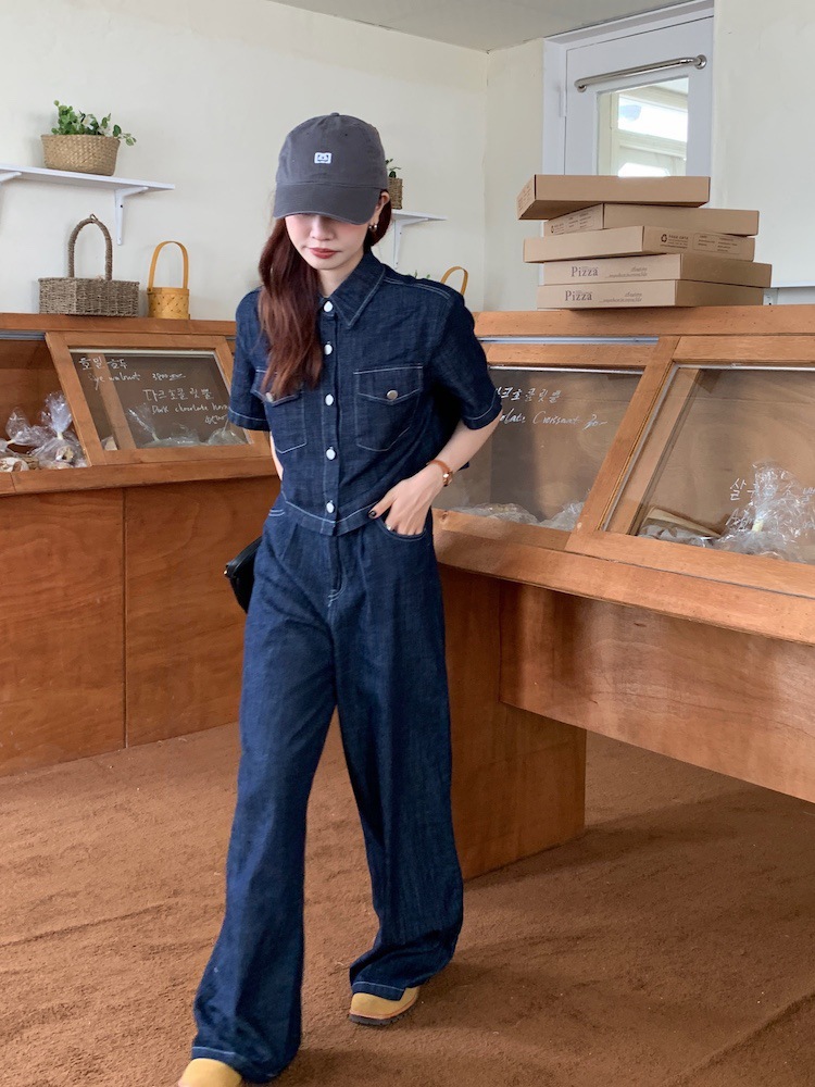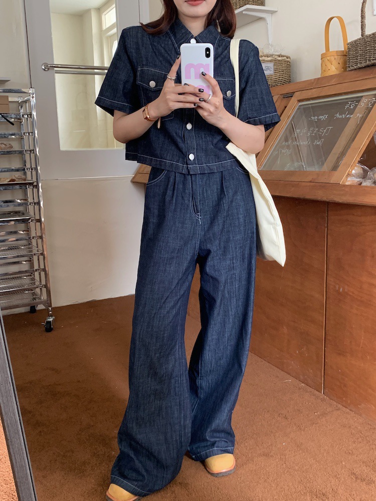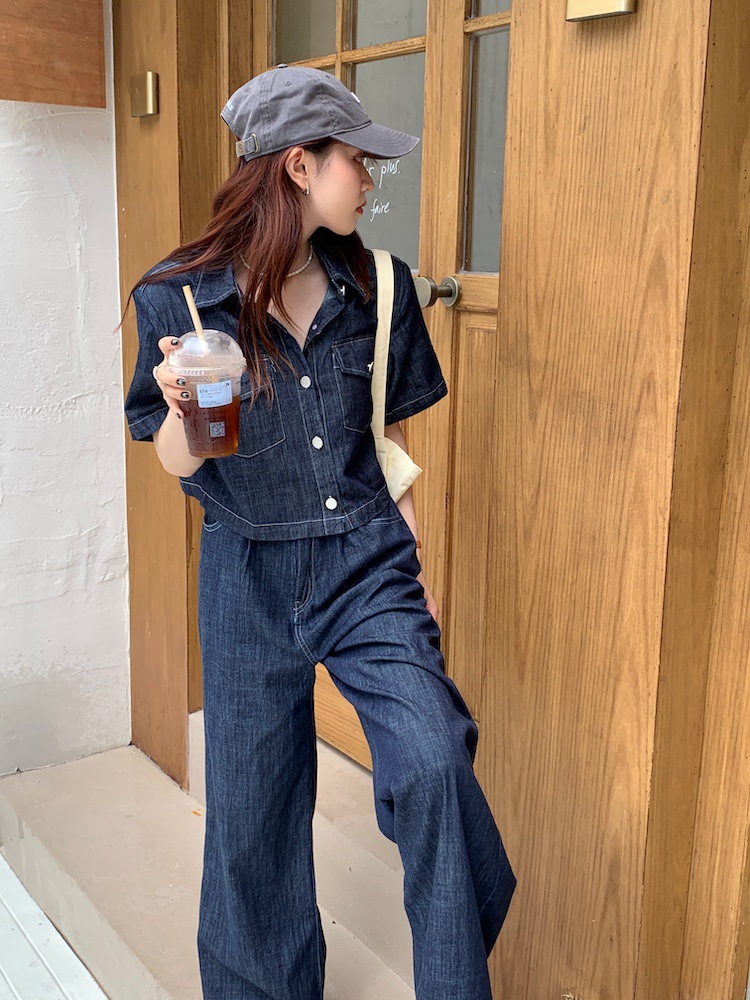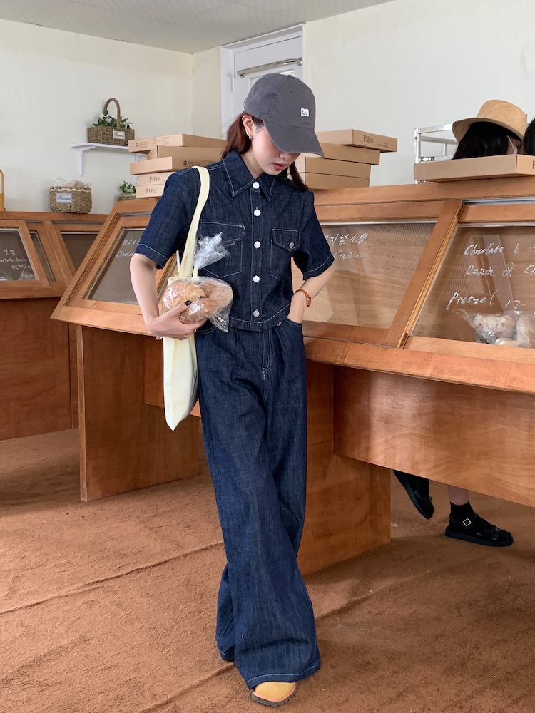 Реальный снимок корейского летнего костюма 2025 года: рубашка с коротким рукавом из выстиранного денима в корейском стиле против свободных джинсовых брюк в пол.