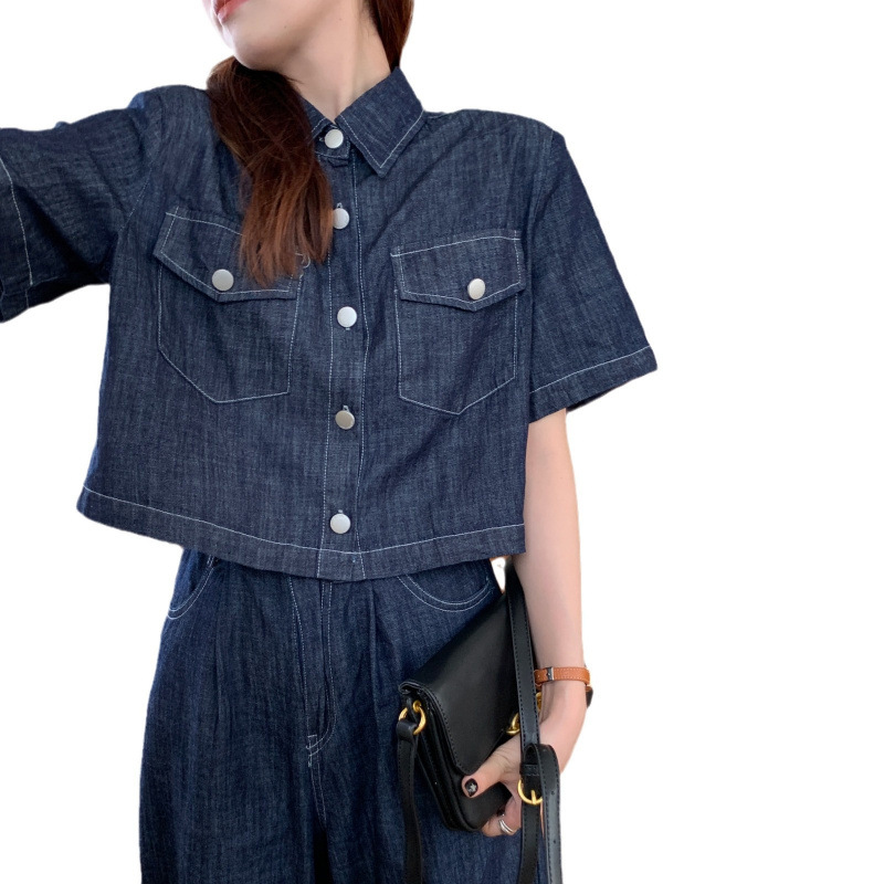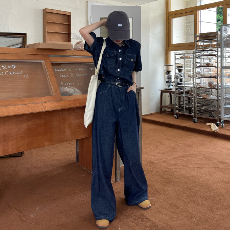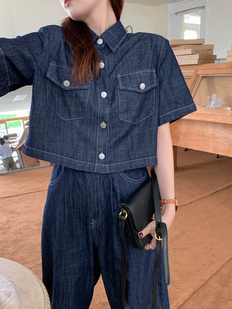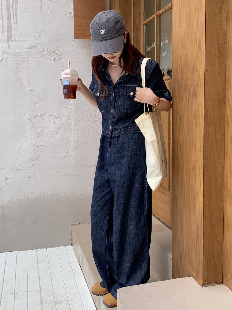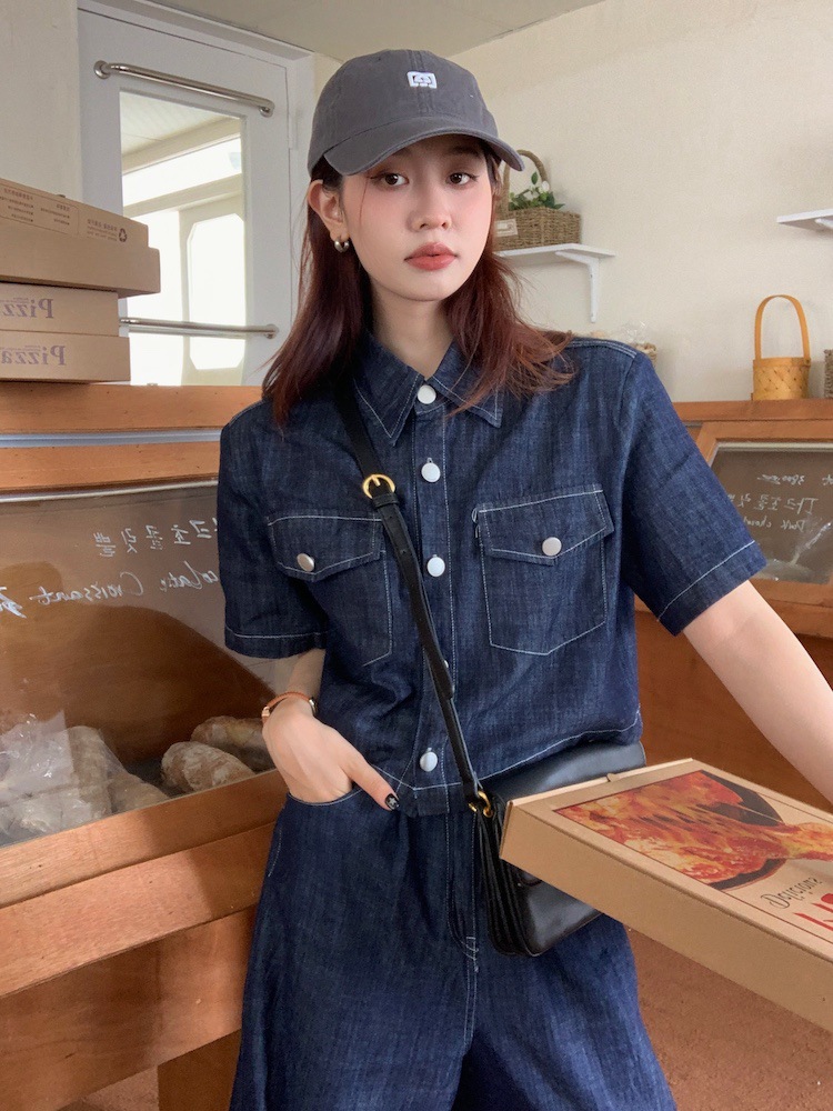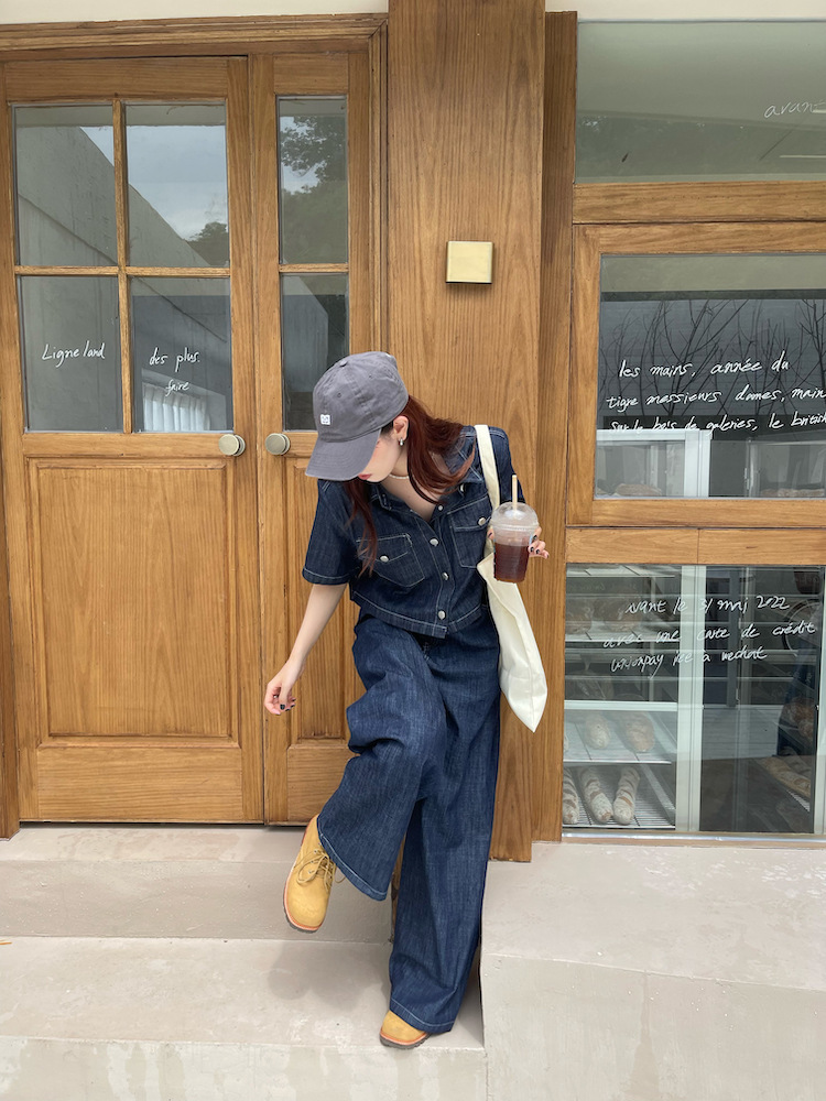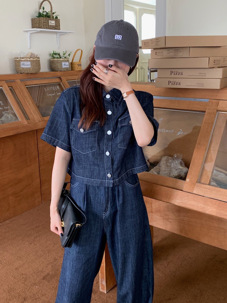 Реальный снимок корейского летнего костюма 2025 года: рубашка с коротким рукавом из выстиранного денима в корейском стиле против свободных джинсовых брюк в пол.