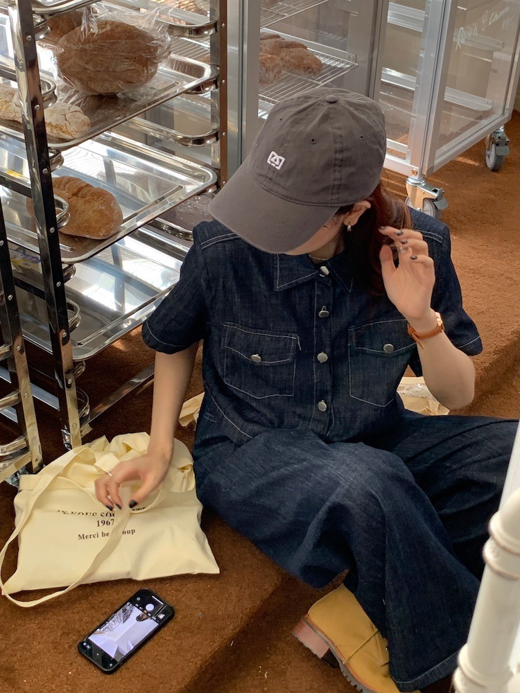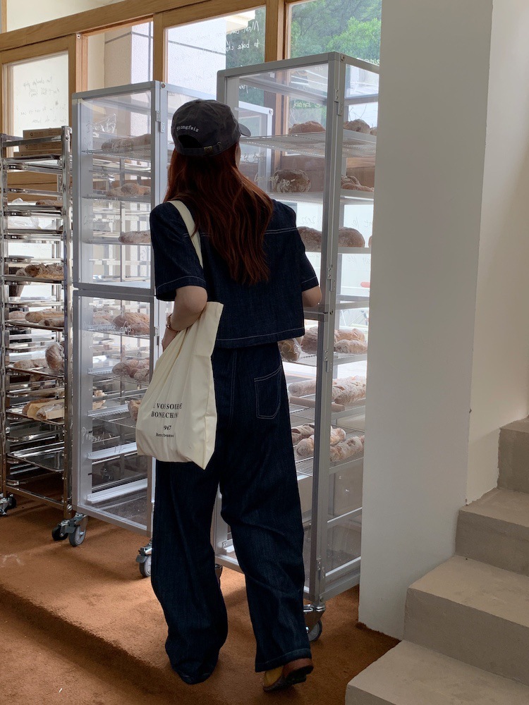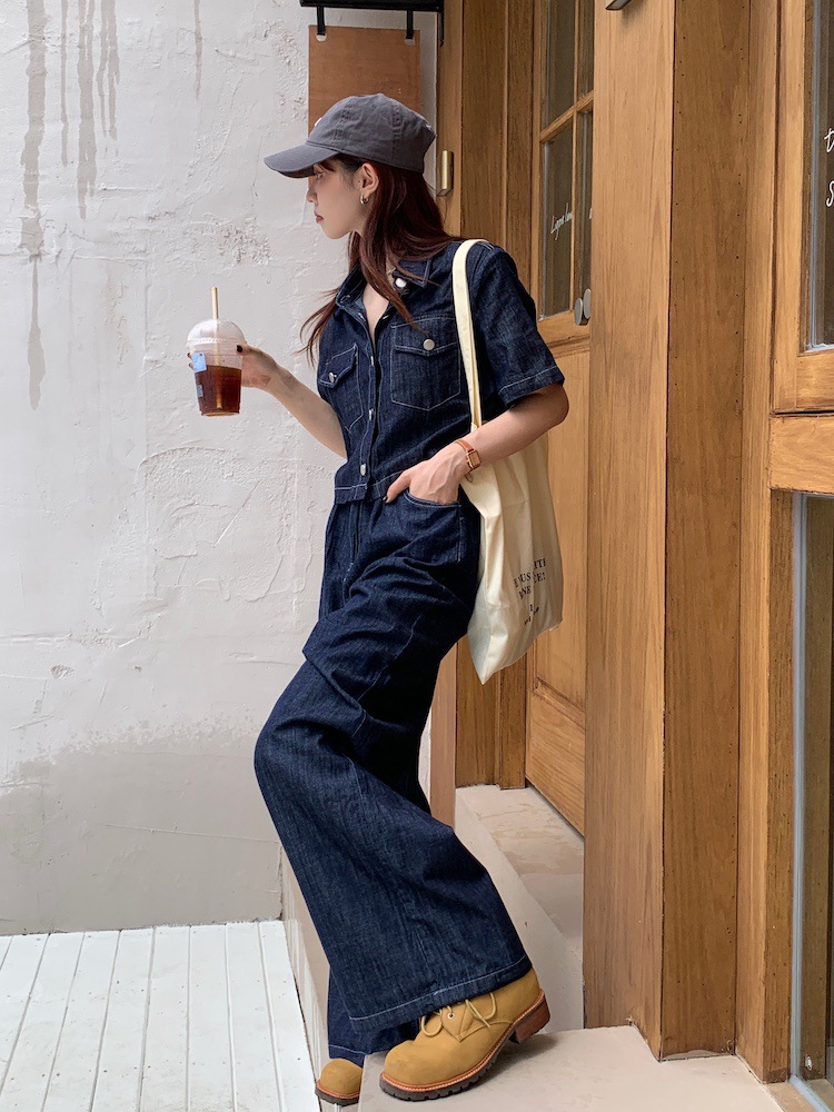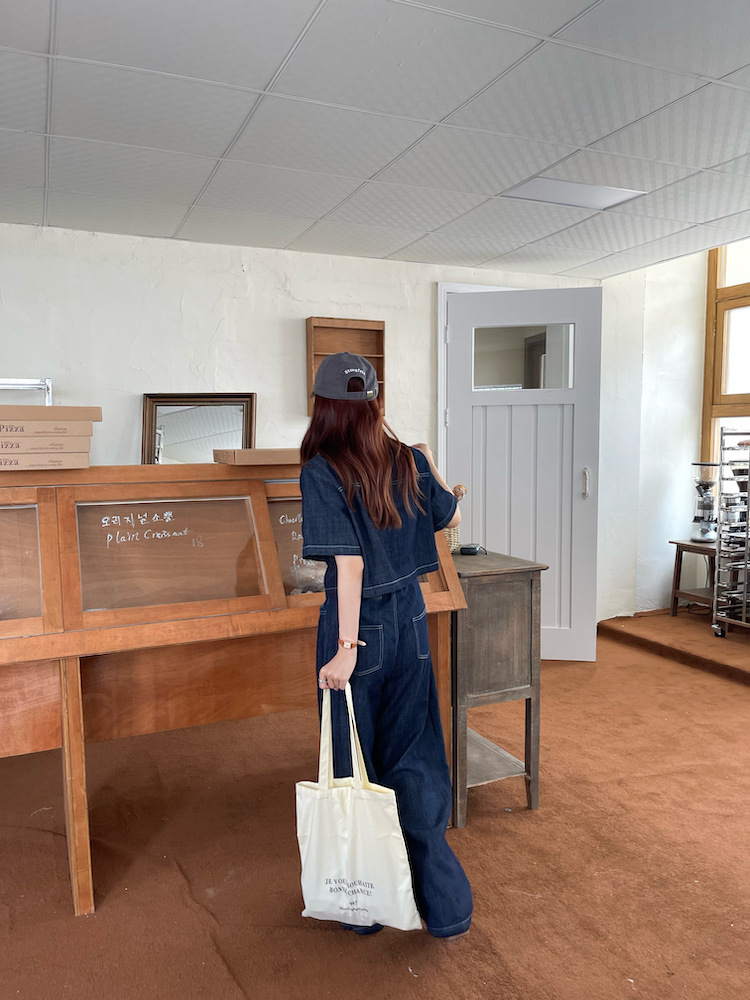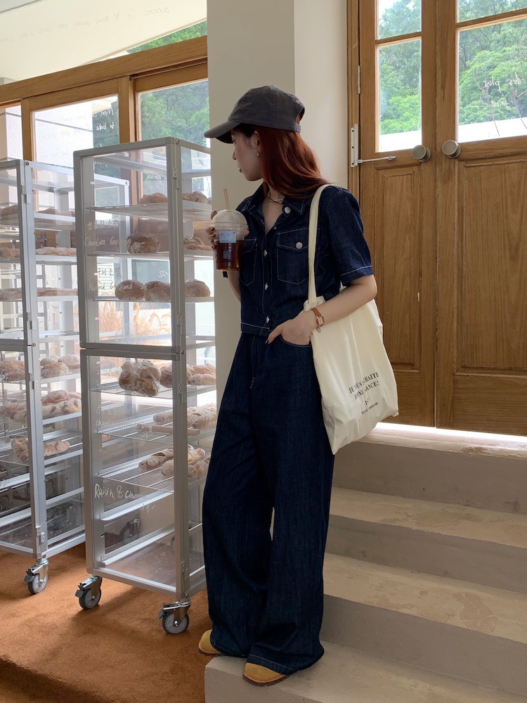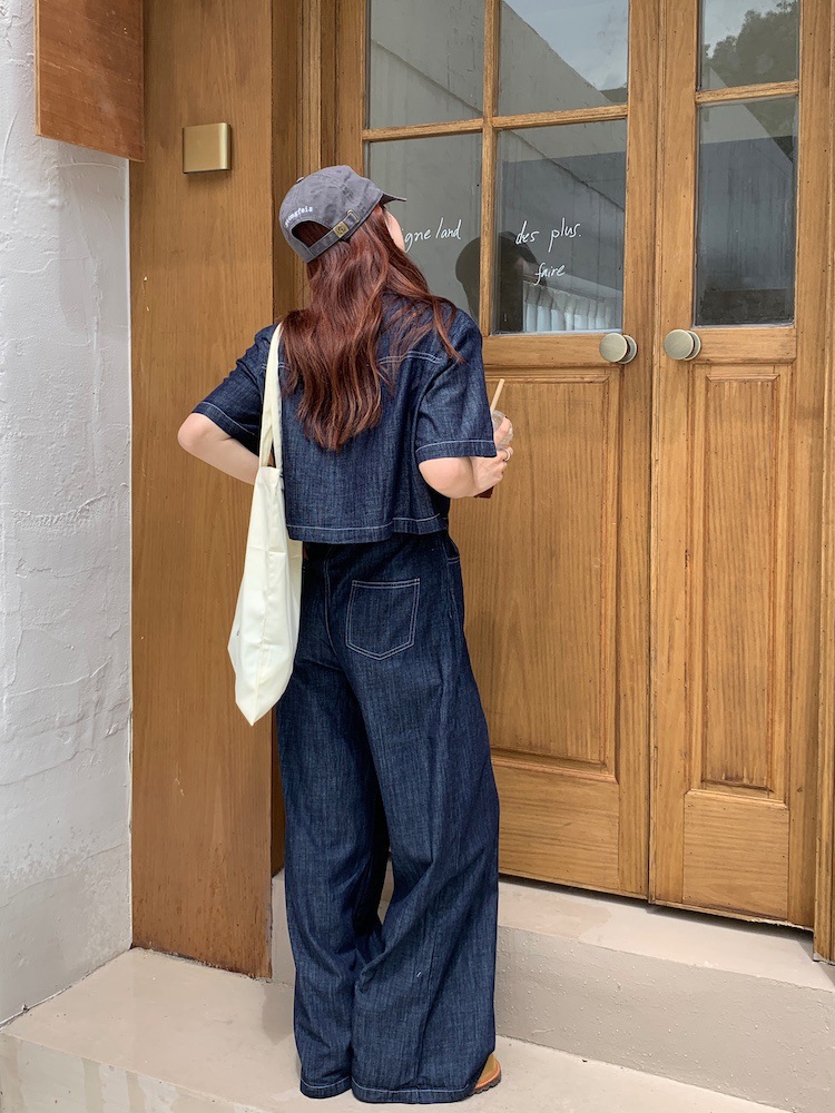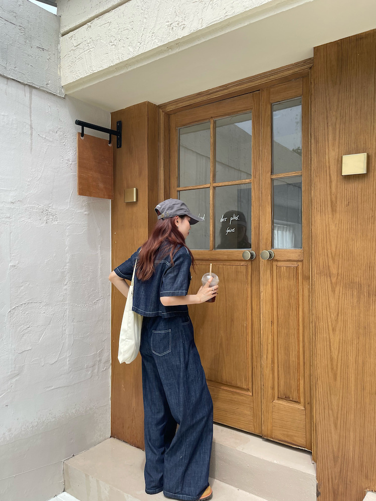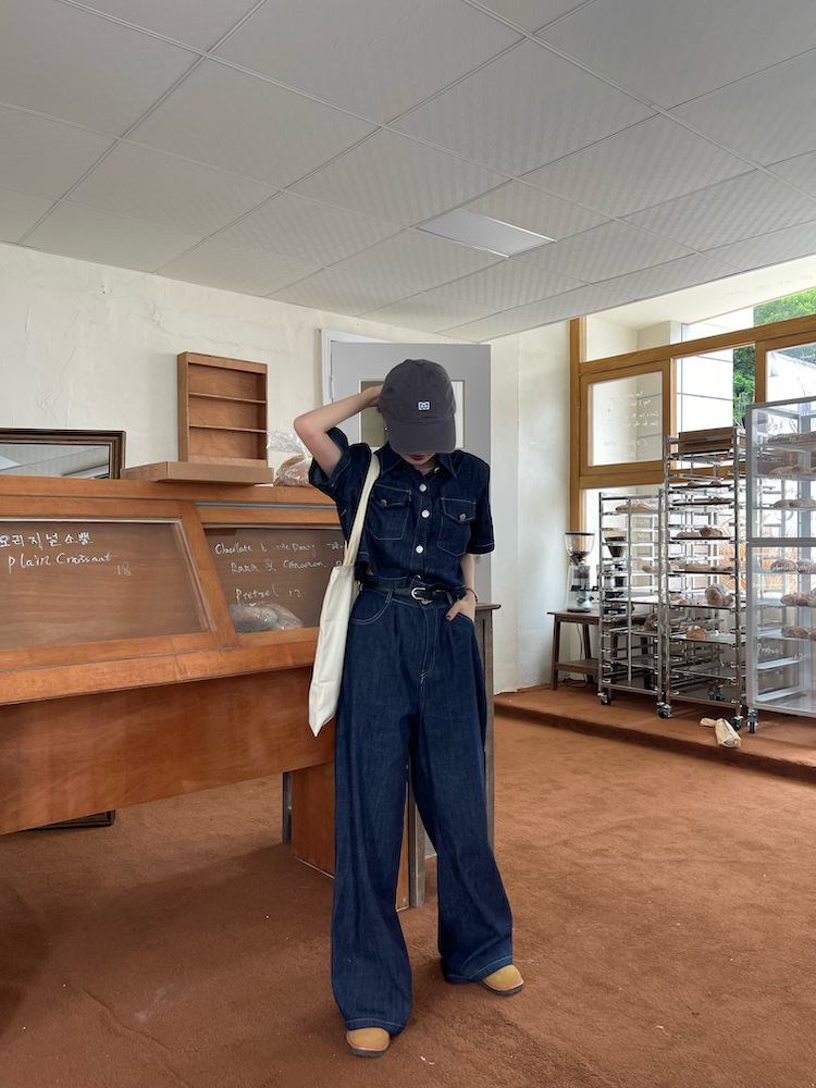 Реальный снимок корейского летнего костюма 2025 года: рубашка с коротким рукавом из выстиранного денима в корейском стиле против свободных джинсовых брюк в пол.