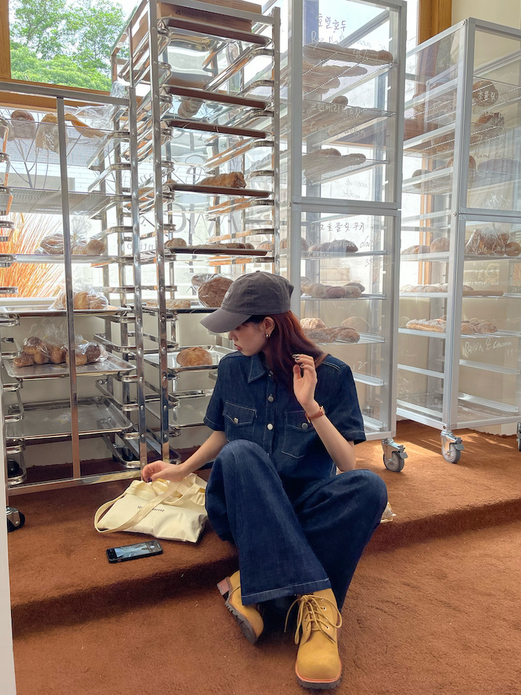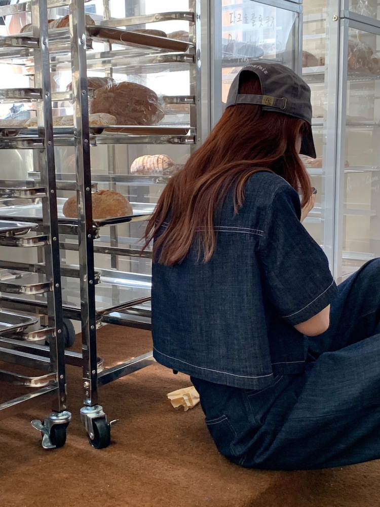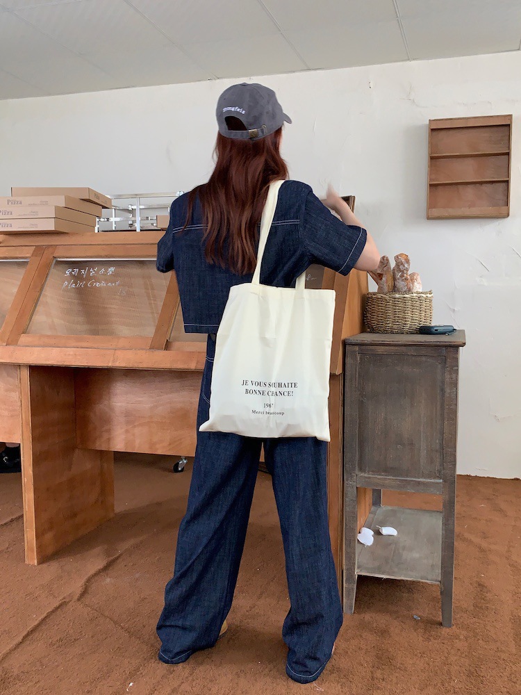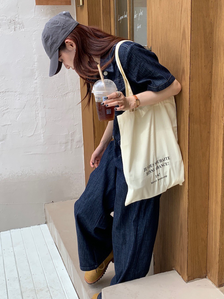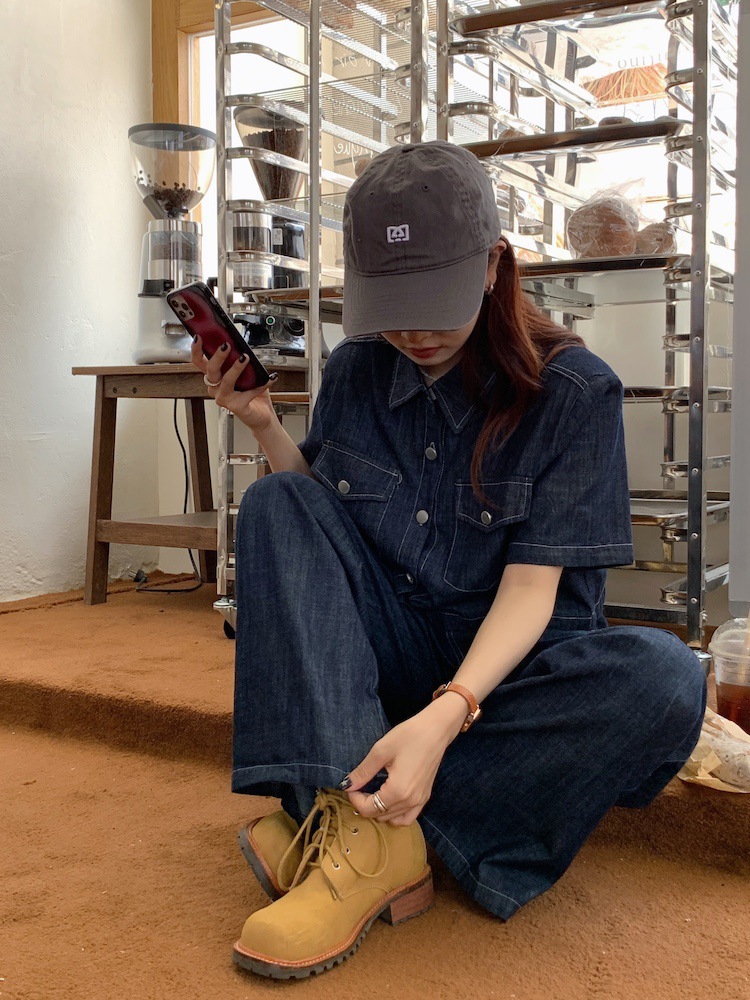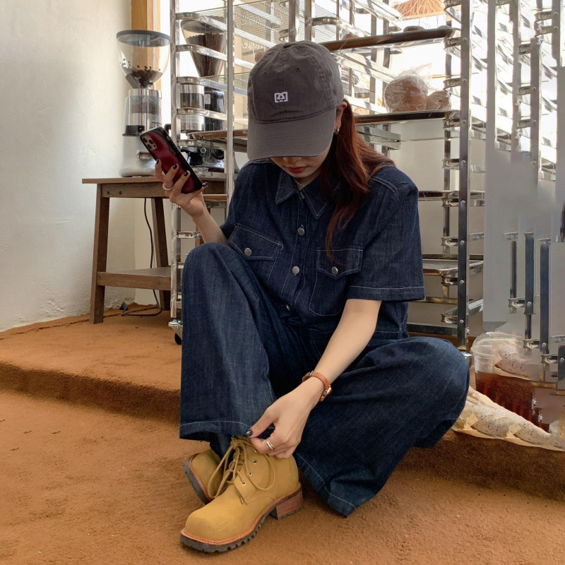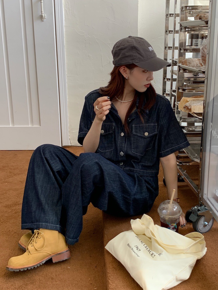 Реальный снимок корейского летнего костюма 2025 года: рубашка с коротким рукавом из выстиранного денима в корейском стиле против свободных джинсовых брюк в пол.
