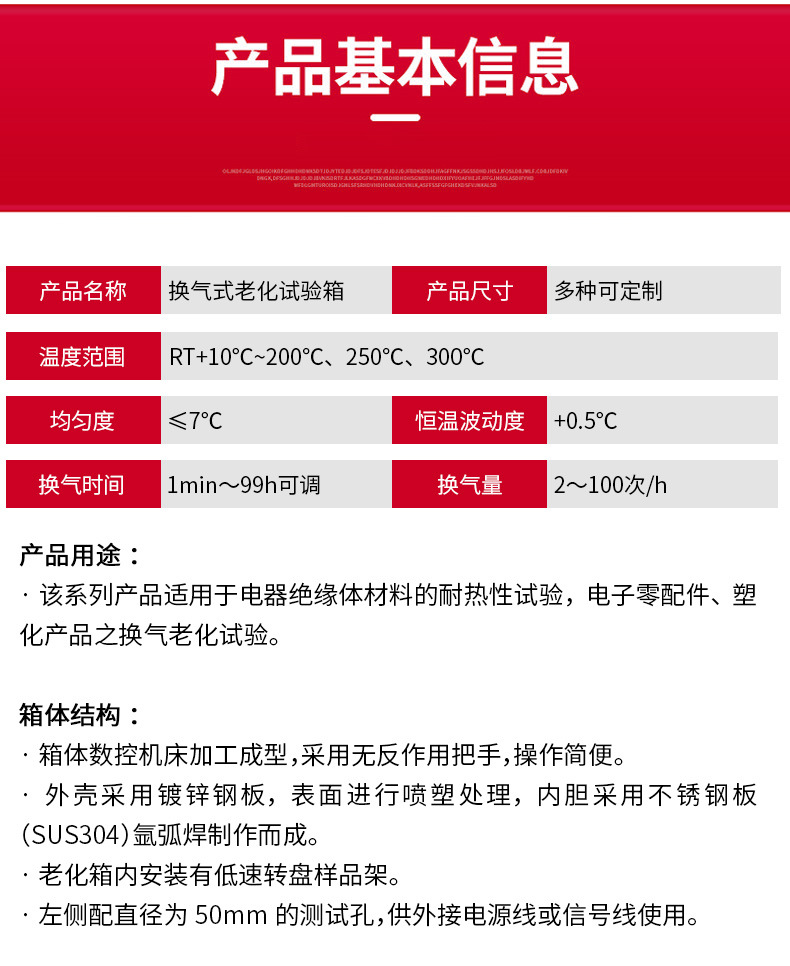 Эта серия продуктов подходит для испытаний на термостойкость электрических изоляционных материалов, а также для испытаний на старение при вентиляции цифровых запасных частей и пластифицированных изделий.