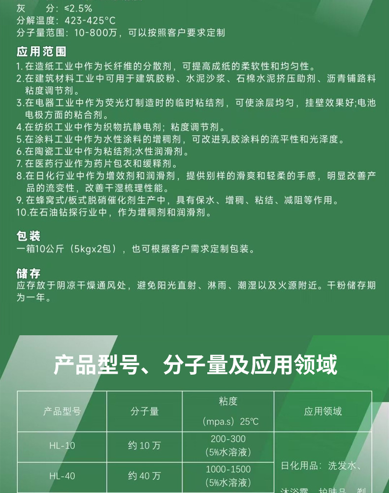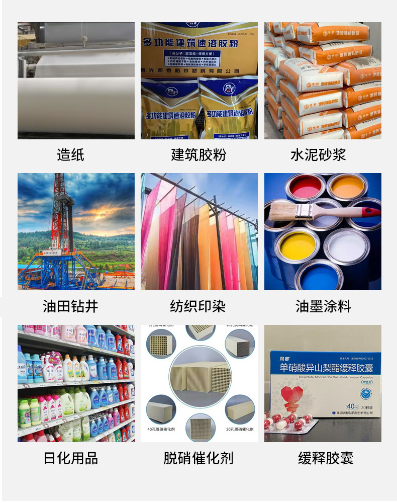 Изготовление бумаги, строительный клей, цементный раствор, печать и крашение текстиля, бытовые химические продукты, чернила и покрытия.