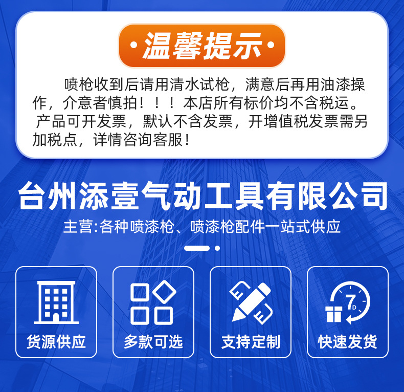 是一家从事气动喷涂设备,开发设计,生产制造,销售网络,售后服务为一体的综合性企业。产品采用成熟的加工工艺,由CNC数控加工而成,以及精密检测设备。专注生产低压喷漆枪,传统喷漆枪,涂料喷枪,胎压枪,喷砂枪,清洗枪,吹尘枪等配套的喷涂设备。