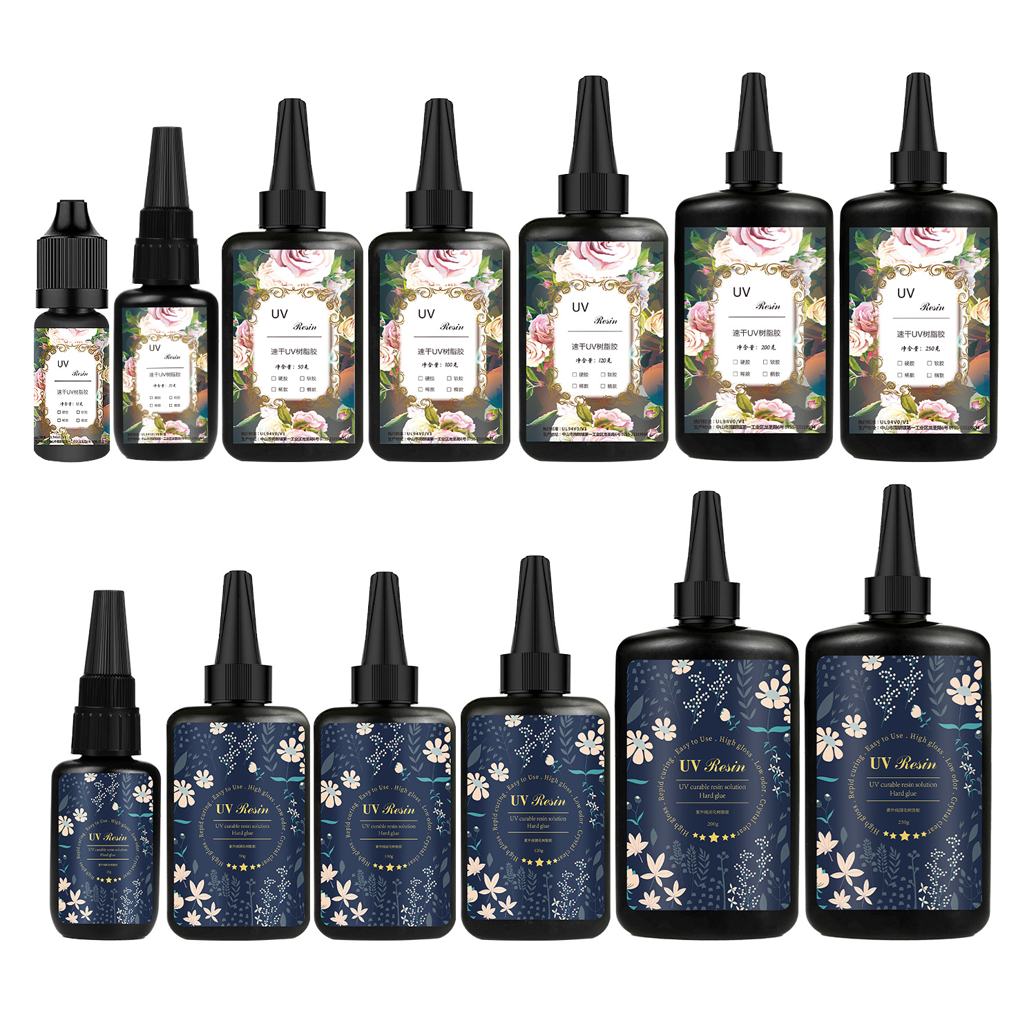 10 грамм бесцветного и очень прозрачного УФ-твердого клея (редкая модель); 25 грамм бесцветного и очень прозрачного УФ-жесткого клея (редкая модель); 25 грамм твердого УФ-клея с низким запахом и высокой прозрачностью (редкая модель); 50 грамм бесцветного и очень прозрачного УФ-твердого клея (редкая модель); 50 г твердого УФ-клея с низким запахом и высокой проницаемостью (редкая модель); 100 г твердого УФ-клея без запаха и высокой прозрачности (редкая модель); 100 г УФ-жесткого клея с низким запахом и высокой прозрачностью (редкая модель); 100 г УФ-твердого клея высокой прозрачности без запаха (редкая модель); 120 г высокопрозрачного УФ-твердого клея без запаха (редкая модель); 120 г УФ-твердого клея со слабым запахом и высокой прозрачностью (редкая модель); 200 грамм бесцветного и очень прозрачного УФ-твердого клея (редкая модель); 200 г твердого УФ-клея с низким запахом и высокой проницаемостью (редкая модель); 250 г высокопрозрачного УФ-твердого клея без запаха (редкая модель); 250 г УФ-твердого клея с низким запахом и высокой прозрачностью (редкая модель); УФ-лампа для полимеризации ногтей (6 Вт); УФ-лампа для полимеризации ногтей (36 Вт)