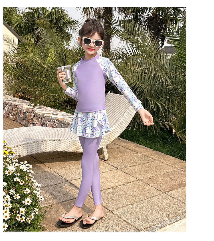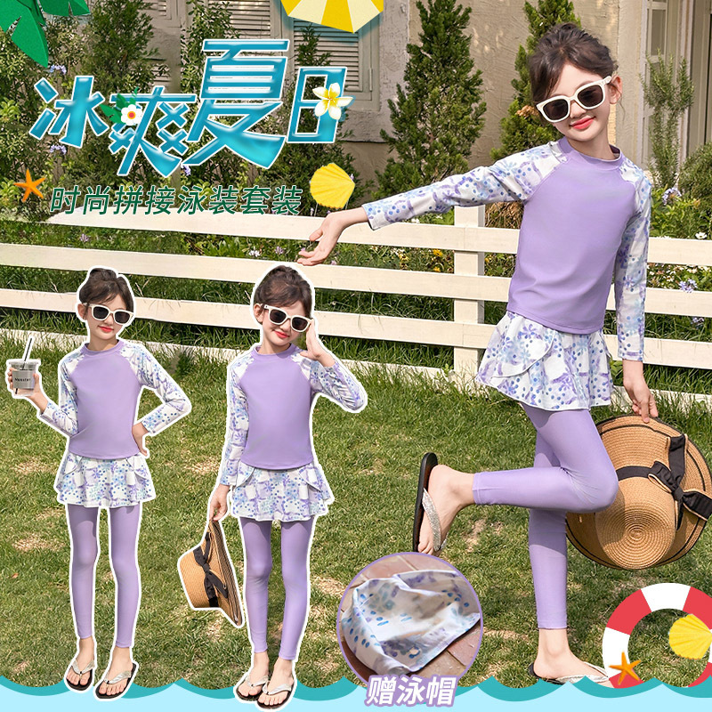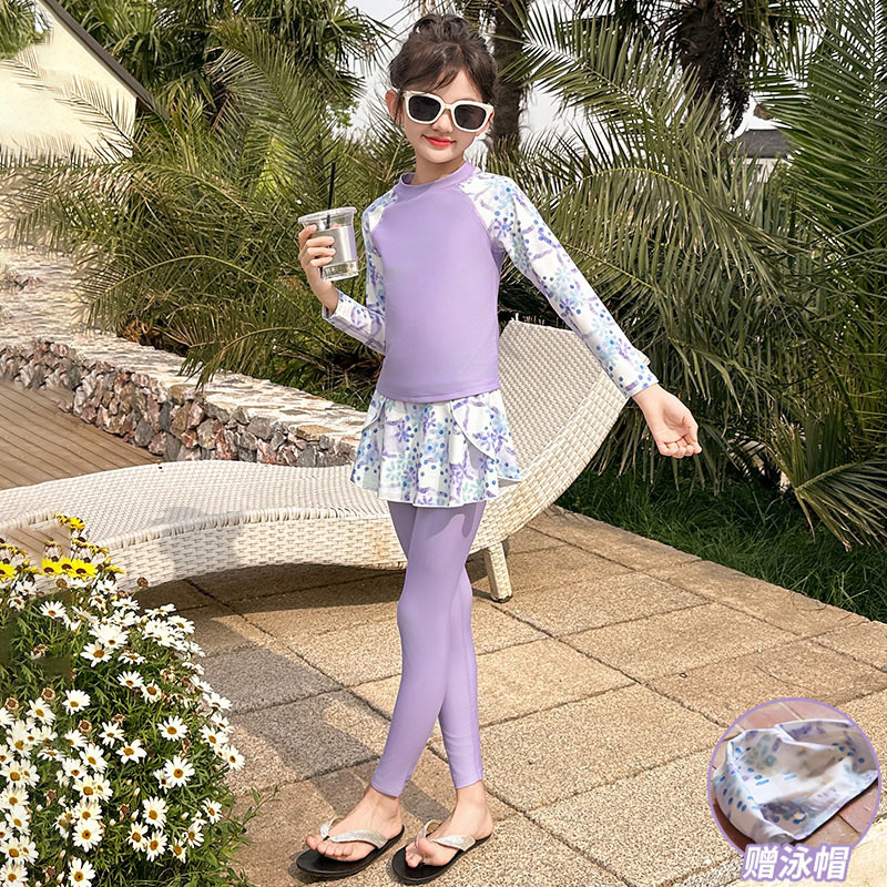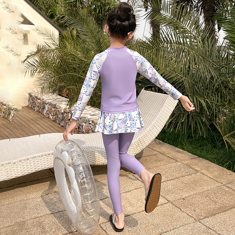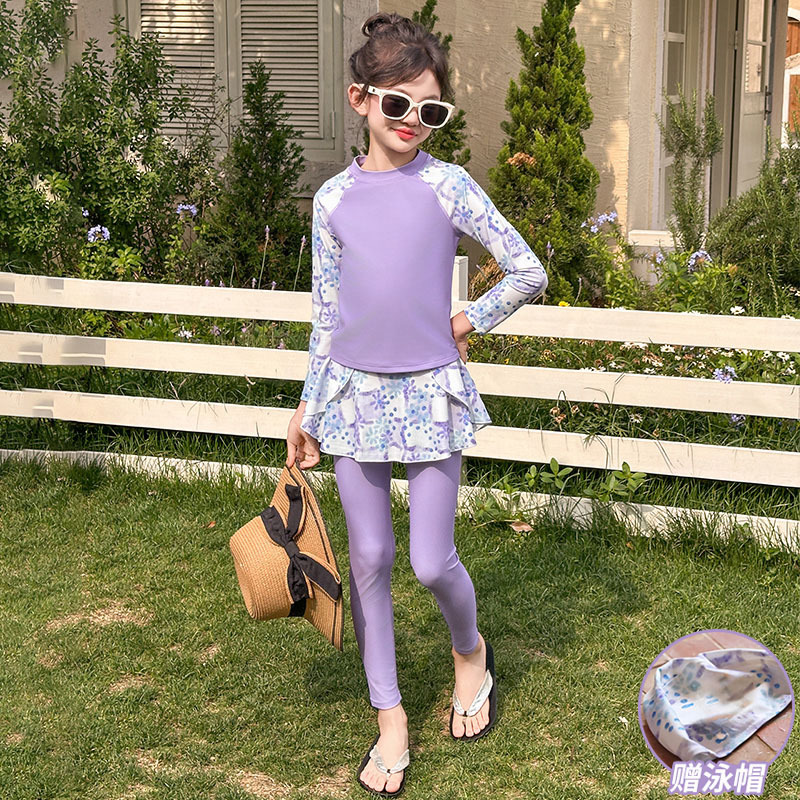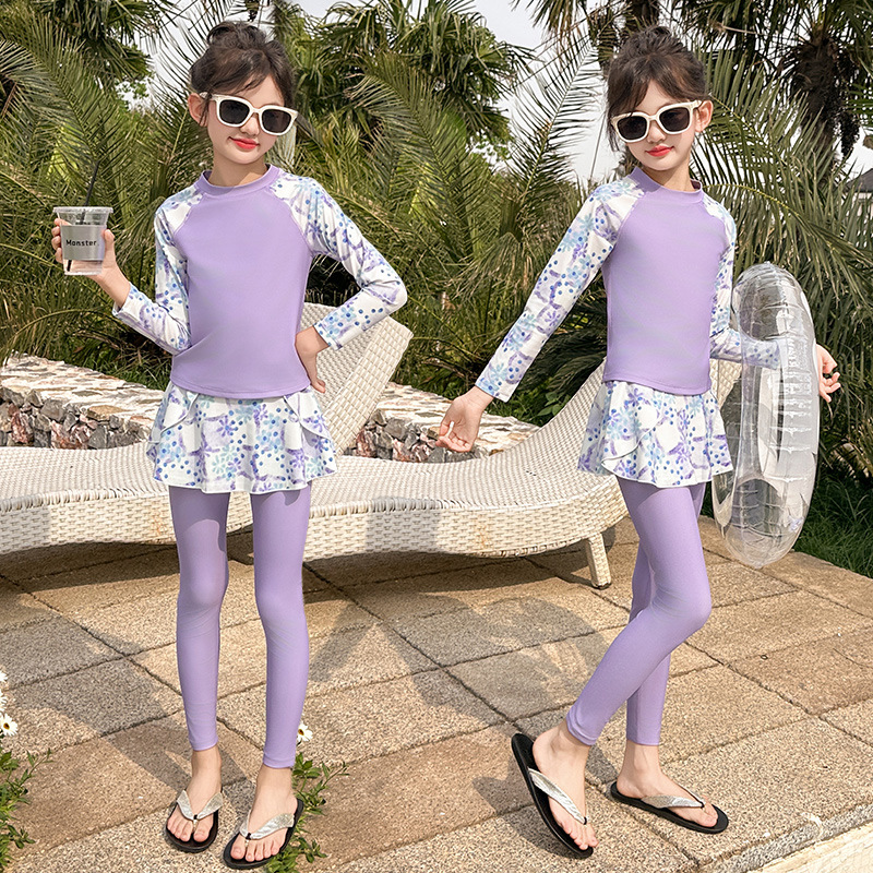 Детский купальник для девочек, защита от солнца, новый стиль 2025 года для старших детей, раздельный купальник с юбкой.