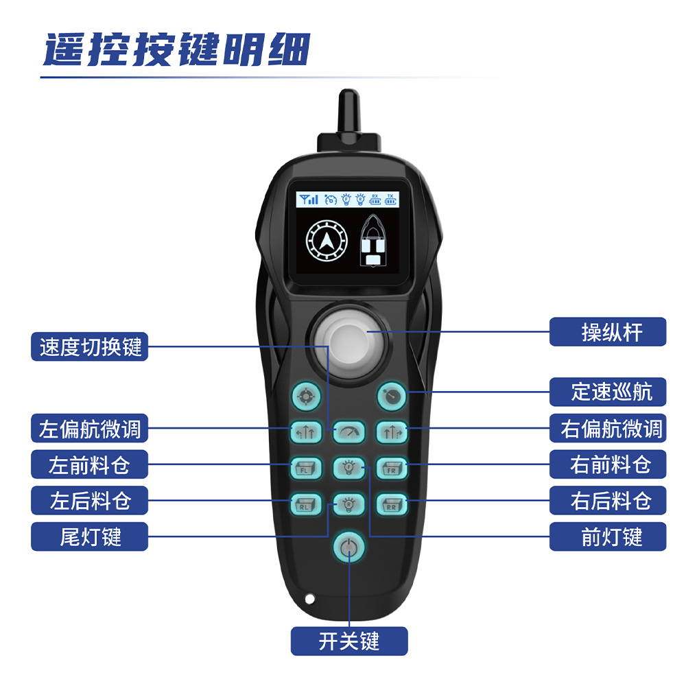 支持前进、后退、左转、右转,操作灵活,适应多种水域环境。内置高精度陀螺仪,自动修正偏航,确保航行稳定。