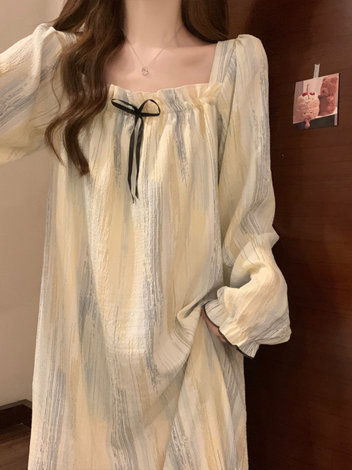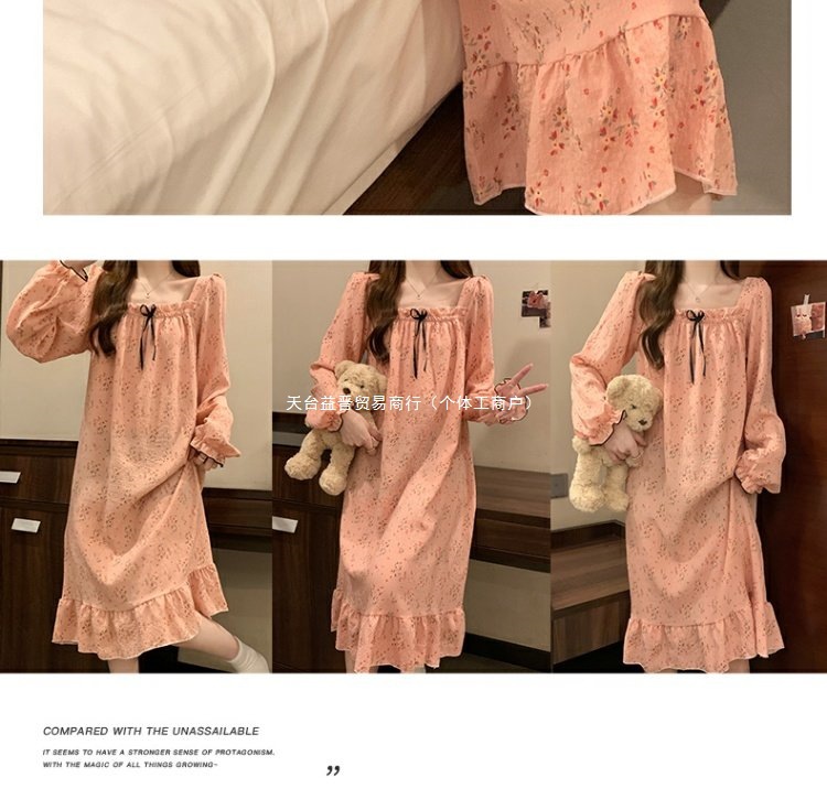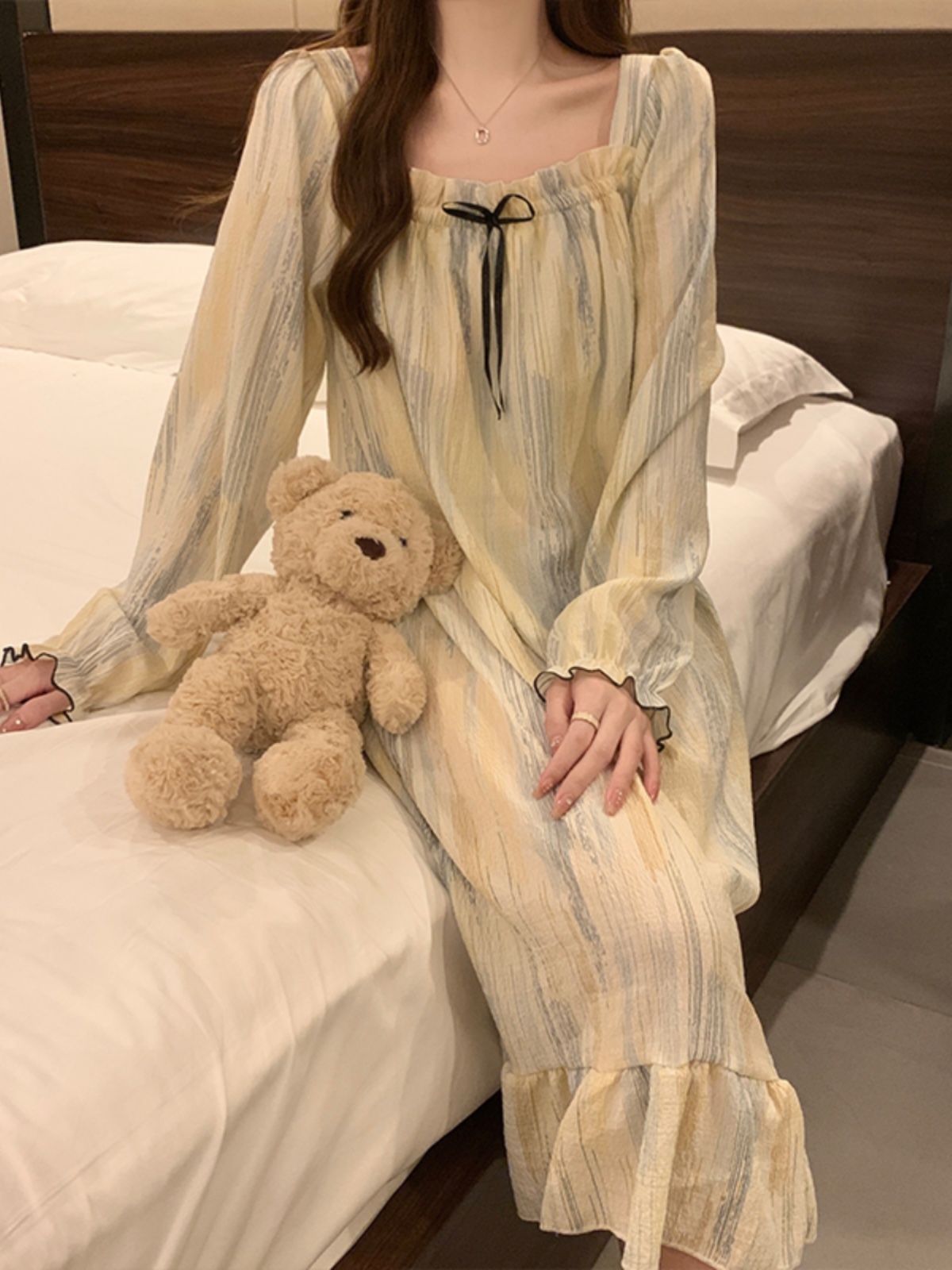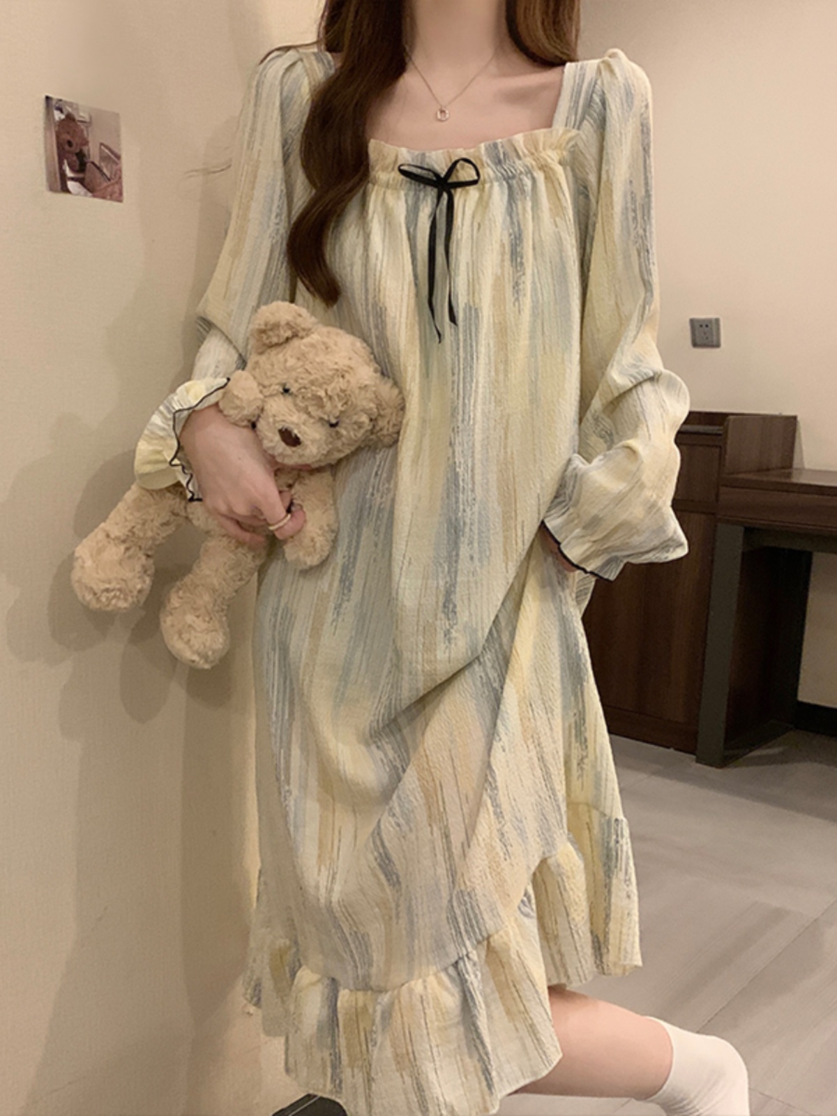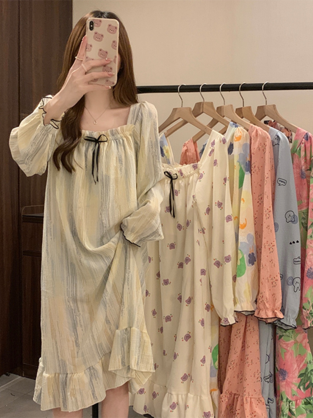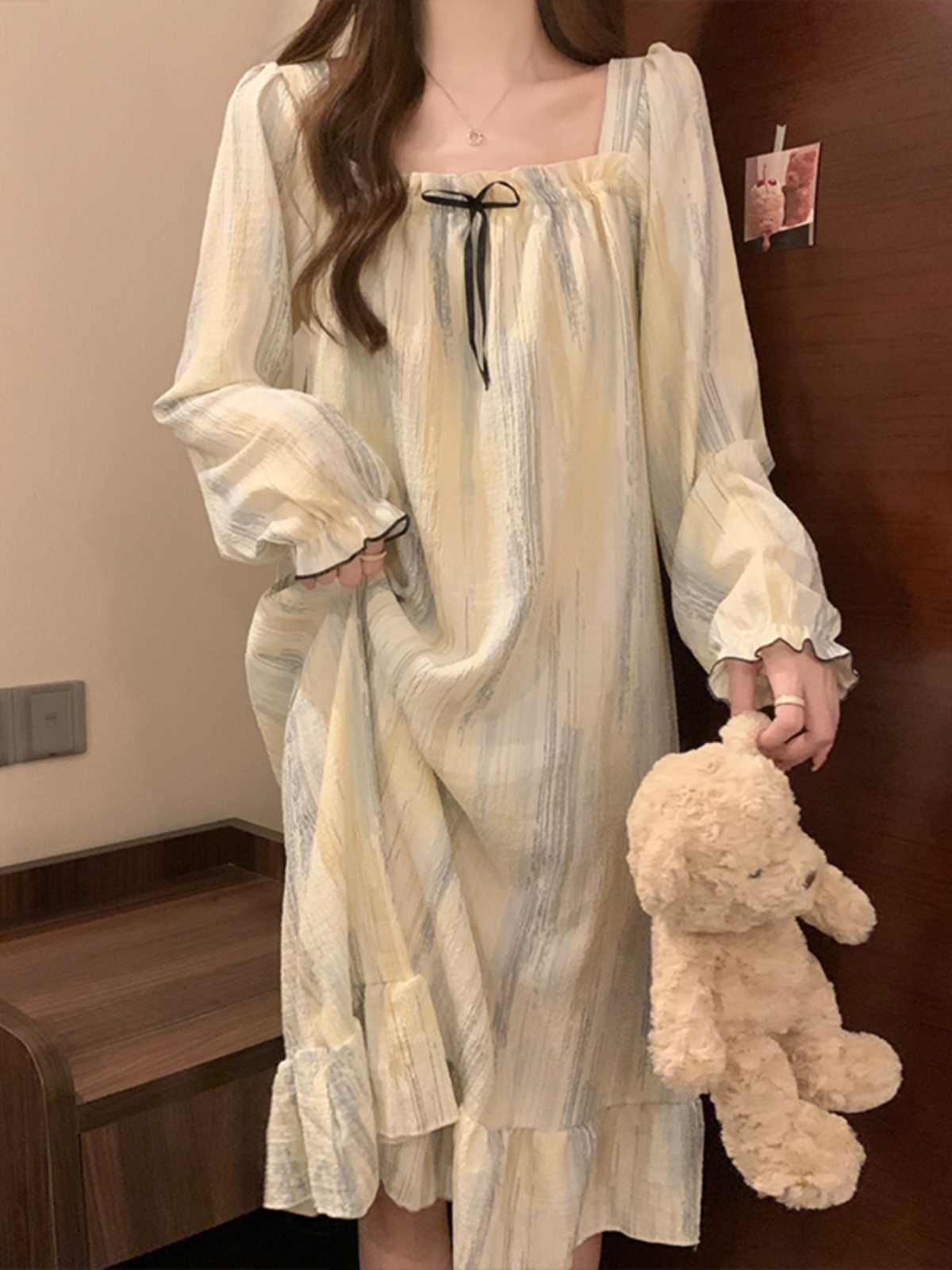 Ночная рубашка в стиле принцессы, пижамы для женщин из чистого хлопка, весенне-осенняя одежда с длинными рукавами и нагрудными подушечками, милая полосатая домашняя одежда средней длины