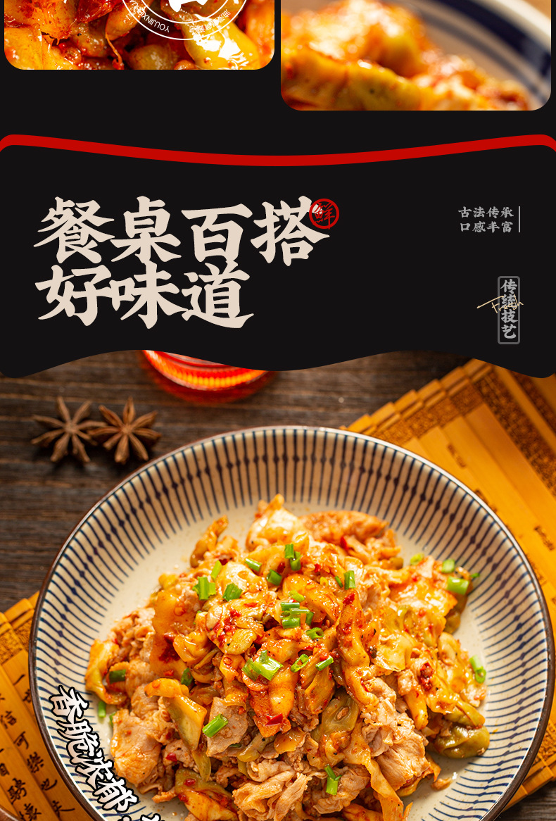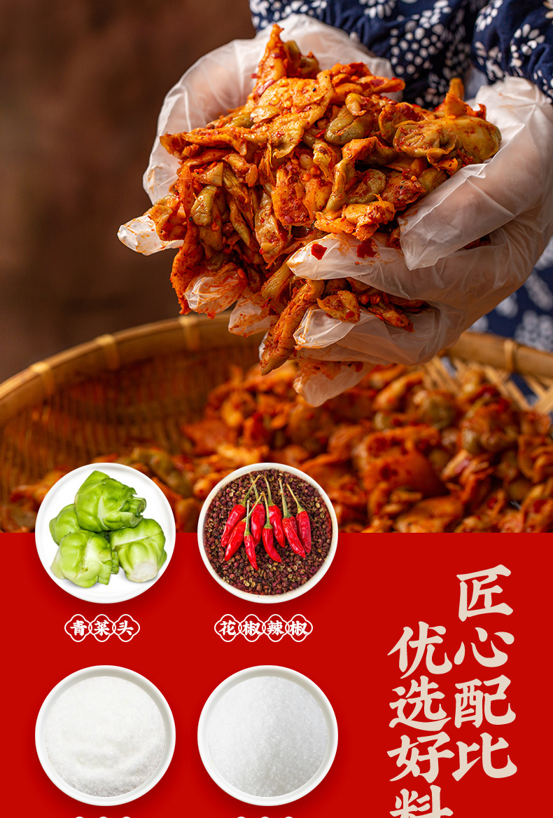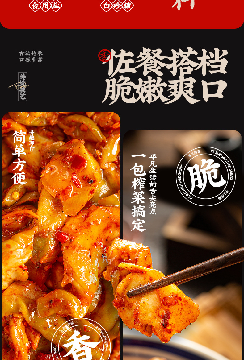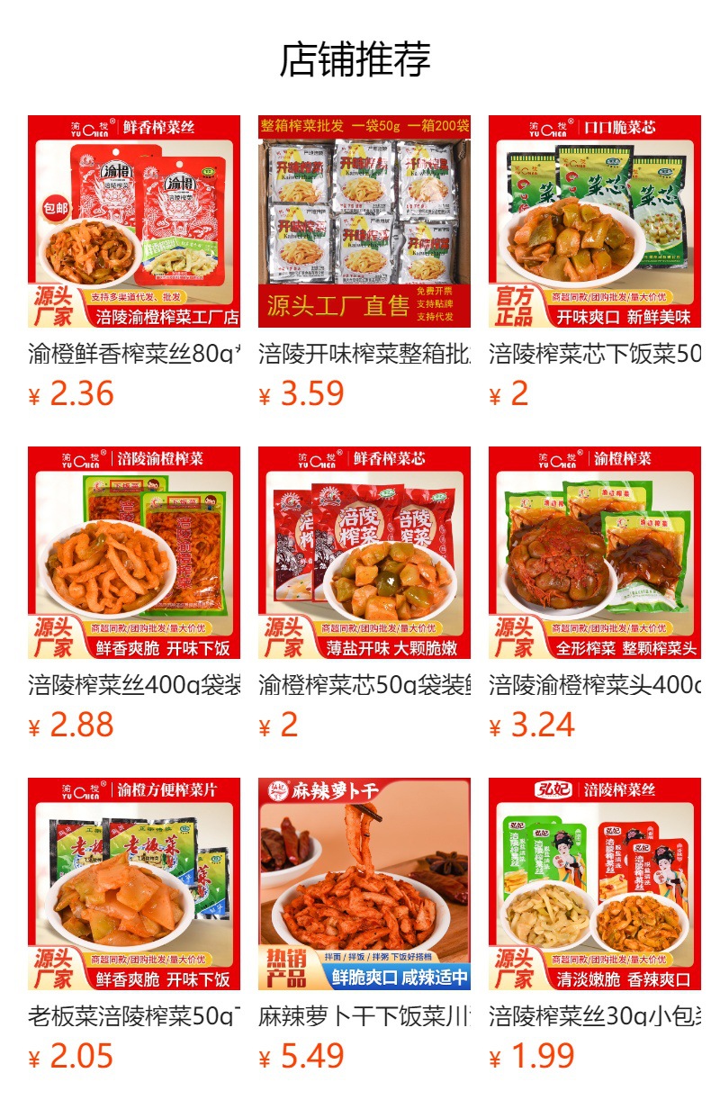 Чунцинская свежая хрустящая горчица 40 г; Ю Ченг Свежие и Хрустящие Заварные Горчицы в Соленой Специи, 50 г; Atao Ge аппетитные маринованные отруби горчицы 50г; Чунцинский острый соус с кунжутным маслом и маринованным горчичным корнем, 50 г; Чунцинская хрустящая горчичная сердцевина 50г; Чунцинский босс овощной 50г; Чунцинская свежая горчица 50 г; Чунцинская свежая и пикантная нарезка цзяцай, 50 г; Чунцинская свежая горчица, 80 г; Чунцинская свежая и пикантная маринованная сердцевина горчичного клубня, 80 г; Рисовая мука Чунцин 208г; Рисовая мука Чунцин 400г; Рисовая мука Чунцин 128г; Ю Чэн Красный Масло Соевых Бобов 108 г; Чунцинский оранжево-желтый цветок в ассортименте 128 г; Чунцинский гриб в ассортименте 128г; Грибное блюдо Чунцин 128 г; Чунцинский пряный три шелка 128 г; Чунцинская горчичная головка 400г; Хунфэй легкая маринованная горчица в кусочках 30г; Хунфэй острая маринованная горчица 30 г; Хунфэй Хрустящая маринованная горчица 82 г; Хунфэй легкая маринованная горчица в кусочках 82г; Хунфэй острый маринованный горчицовый измельчитель 82 г; Кусочки свежей маринованной горчицы Hongfei 82 г; Хонфэй Огурцы ручной работы в ломтиках, легкие 252 г; Горчичные ломтики ручной работы Hongfei Spicy 252 г; Хонфэй маринованные отруби горчицы легкие 252 г; Хонфэй маринованный горчичный пикантный 252 г; Горячий сушеный редис ручной работы Hongfei 252 г