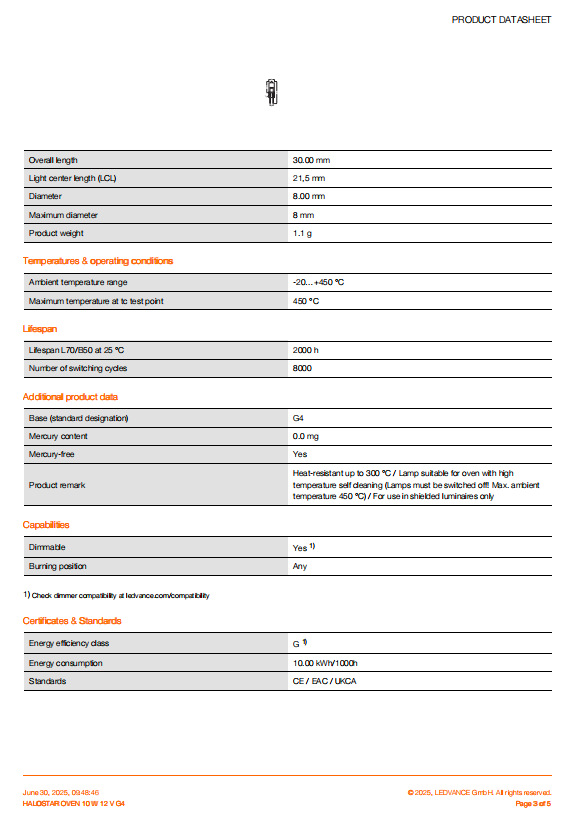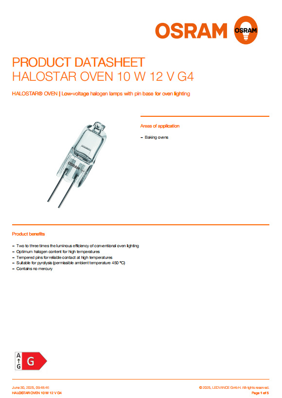 Специальная галогенная лампа для духовки OSRAM, контакт G4, 12 В, 10 Вт/20 Вт, устойчивая к высоким температурам до 300 градусов, без ртути, с высокой яркостью и затемнением.