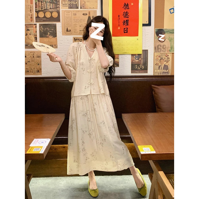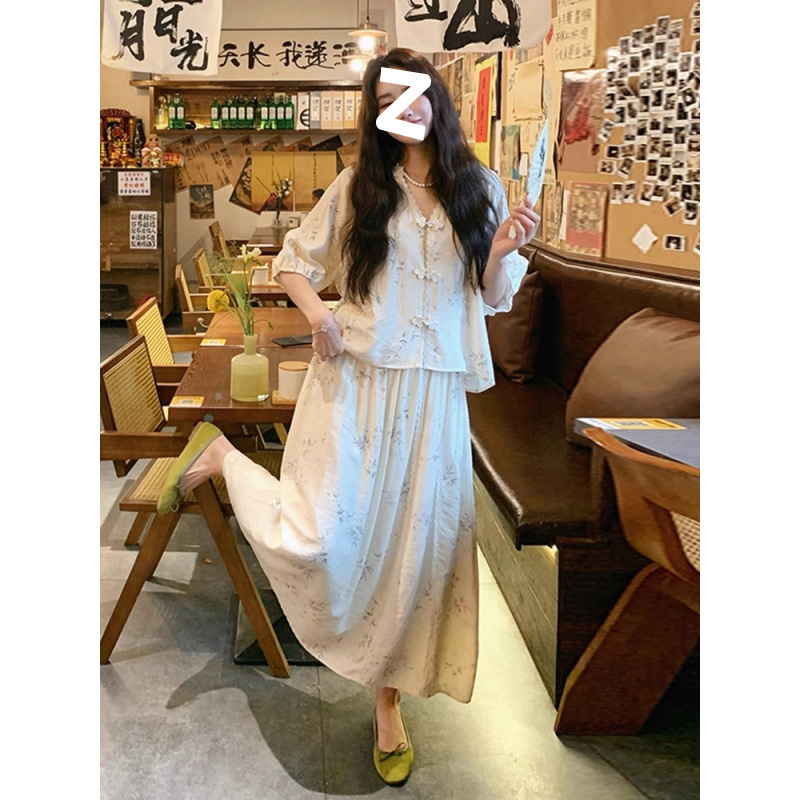 Новый китайский костюм-юбка в стиле дзен для женщин 2025, новый летний комплект из двух предметов в американском стиле с вышивкой, топ и юбка средней длины