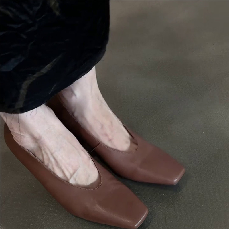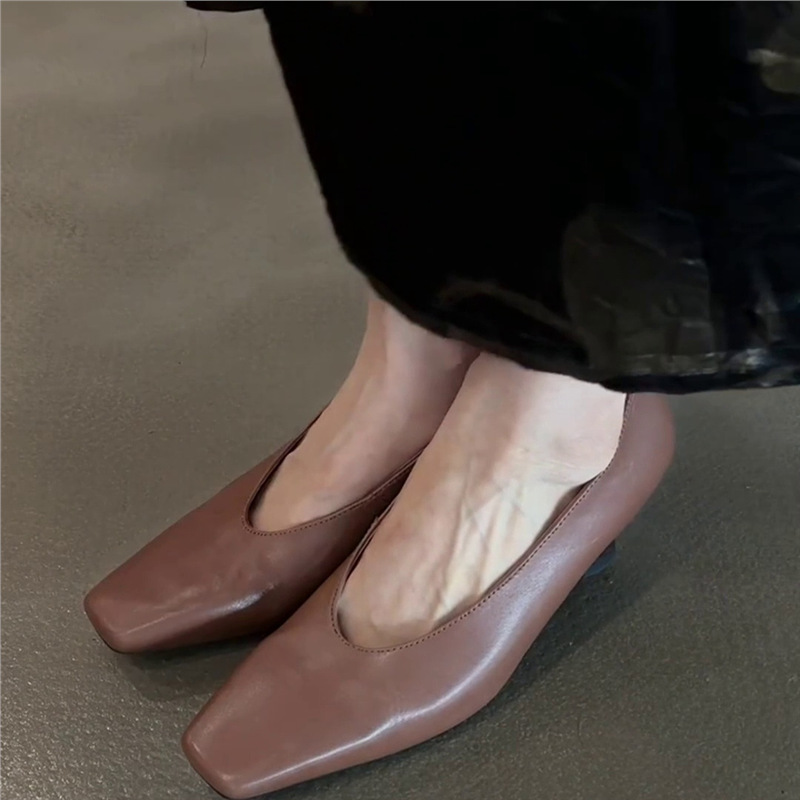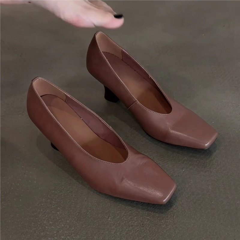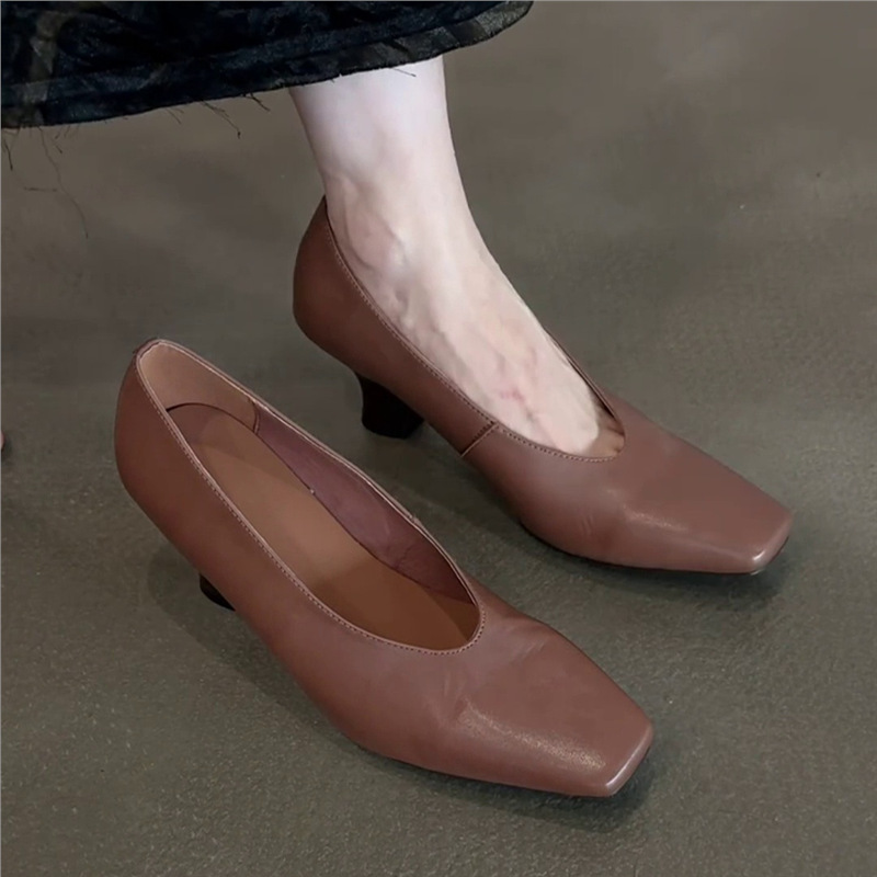 Женские туфли-лодочки из цельной козьей кожи, французский ретро-стиль, квадратный носок, 2025, новые, универсальные, на толстом каблуке, для работы.