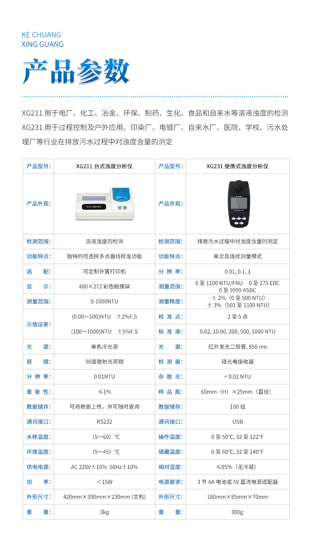 XG211 型 台式浊度分析仪 采用人性化设计,图形菜单操作直观易懂,中英文可选,光源采用单色冷光源,采用90度散射光原理,测量准确可靠。可用于电厂、化工、冶金、环保、制药、生化、食品和自来水等溶液浊度的检测。