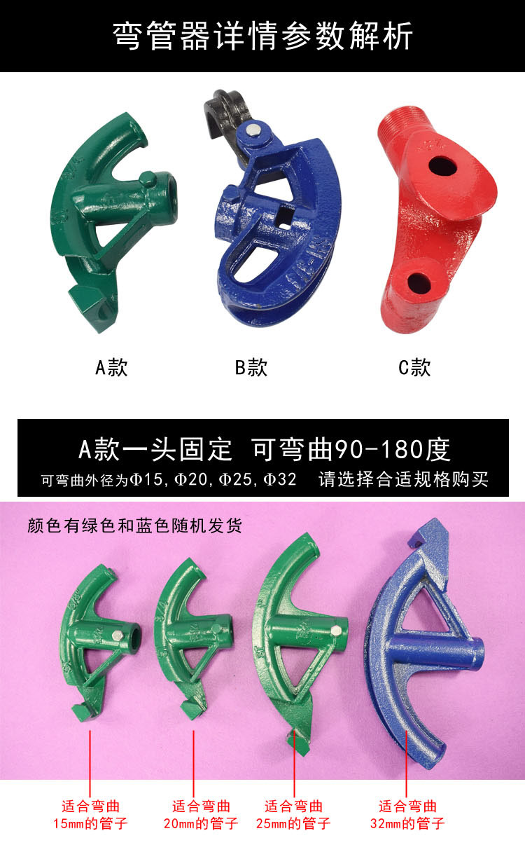 Тип А 5/8 (труба с наружным диаметром изгиба 16 мм); Тип А 3/4 (труба с внешним диаметром изгиба 20 мм); Тип А 1inch (труба с изогнутым внешним диаметром 25мм); Тип А 11/4 (труба с внешним диаметром изгиба 32 мм); Подвижная головка типа B 1/2 (изогнутая трубка с внешним диаметром 20 мм); Подвижная головка типа B 3/4 (изогнутая трубка с внешним диаметром 25 мм); Подвижная головка типа B Ф25 (изогнутая труба с наружным диаметром 32 мм); Передвижная головка типа B Ф32 (изогнутая труба с наружным диаметром 35-38 мм).; Стиль С красный 13 # (труба DN15 мм); Стиль С красный 19 # (труба DN20 мм); Стиль С красный 25 # (труба DN25 мм); Стиль С красный 32 # (труба DN32 мм)