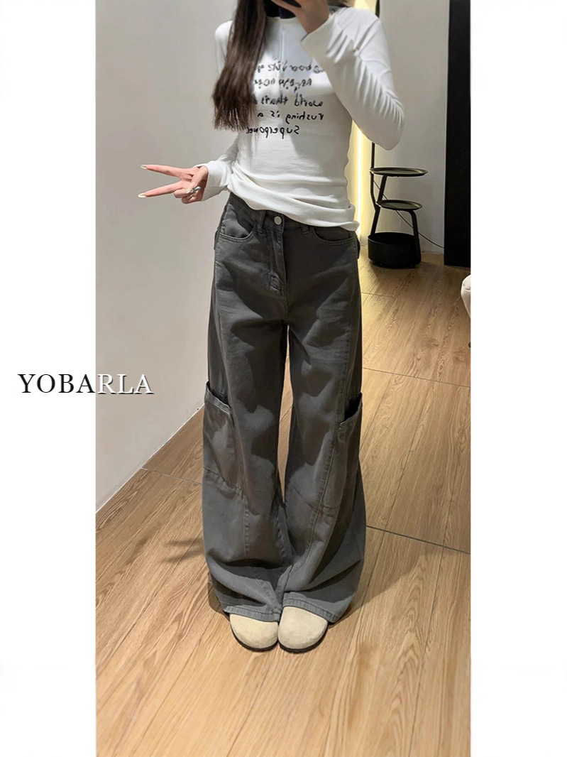 Серые широкие брюки-карго для женщин, новый летний стиль, свободный крой больших размеров для фигуры груши, утягивающие прямые джинсы.