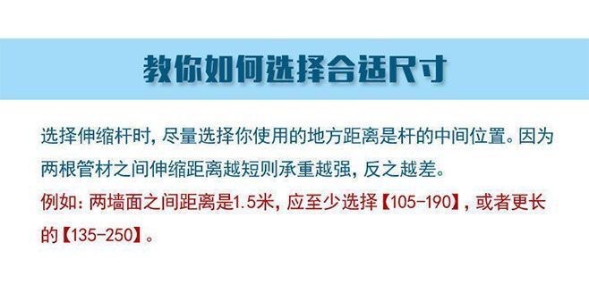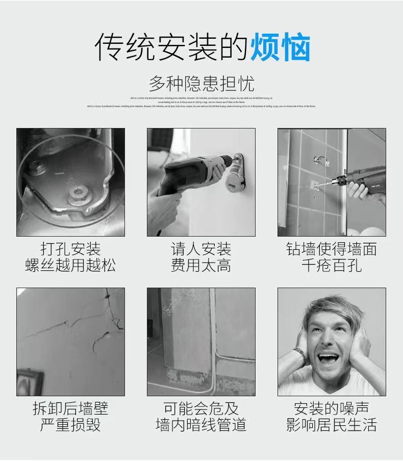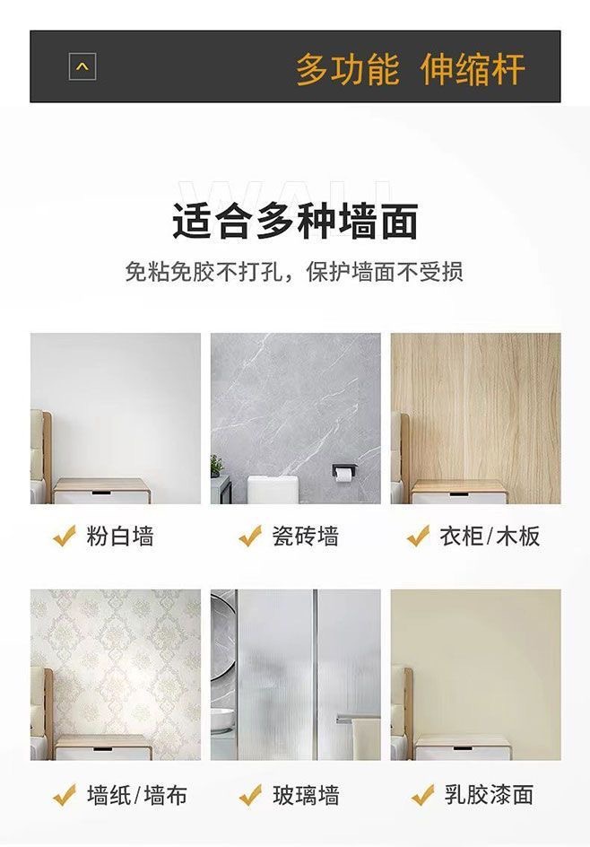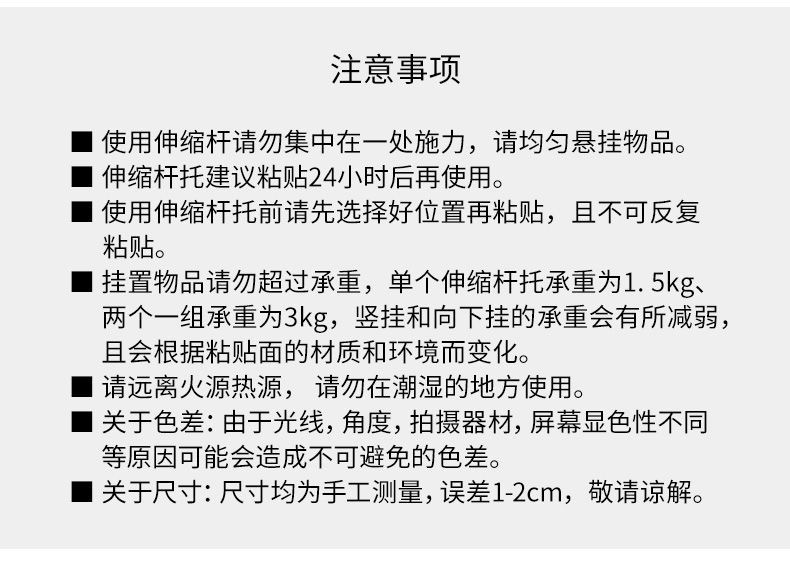 注意:安装在表面光滑地方如瓷砖玻璃等,建议购买搭配防滑杆托或挂钩粘钩使用!