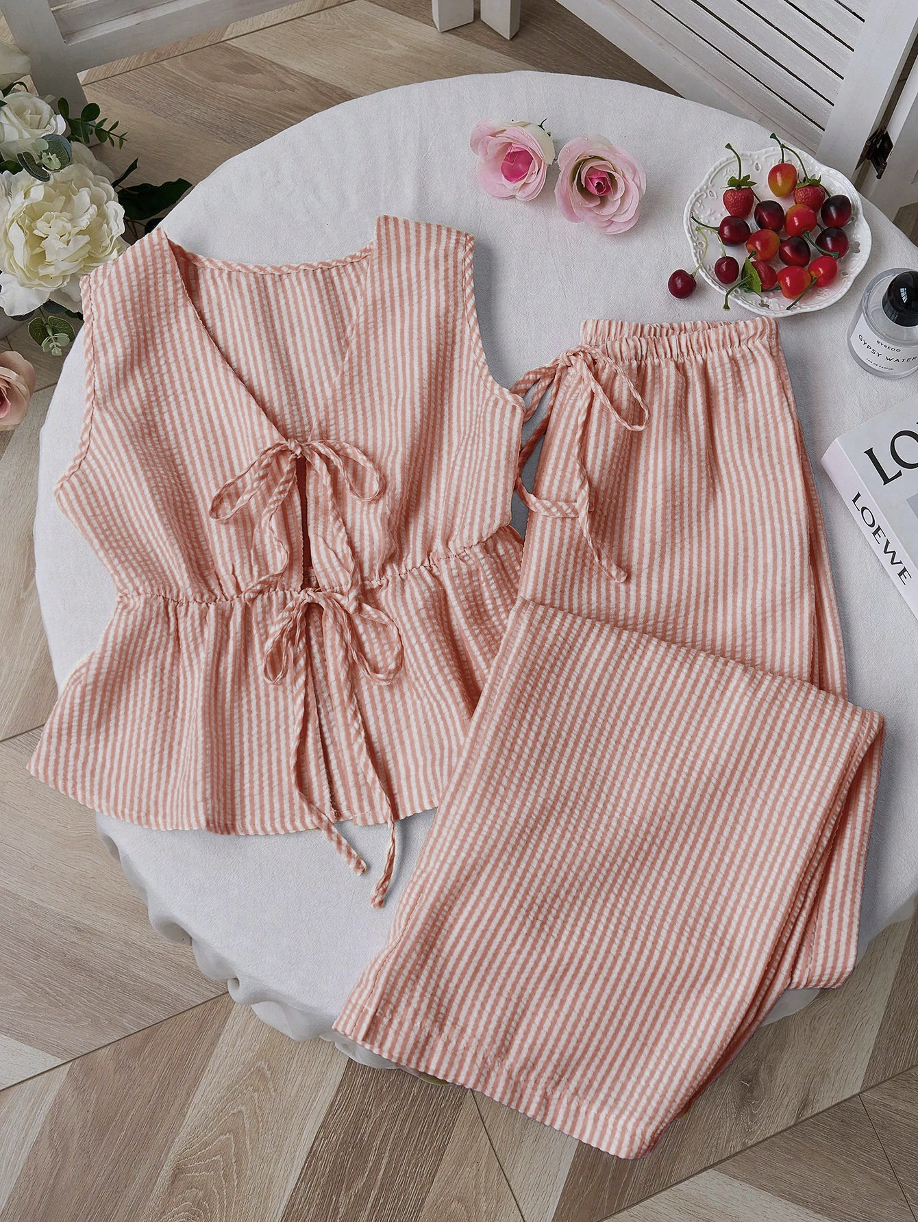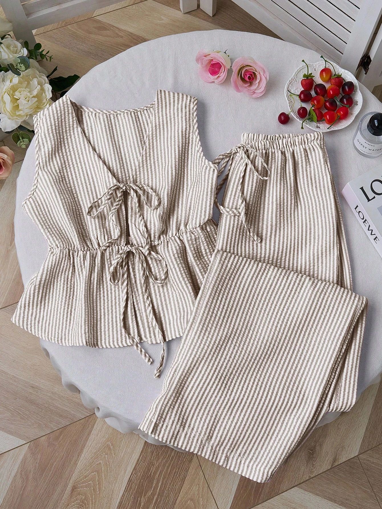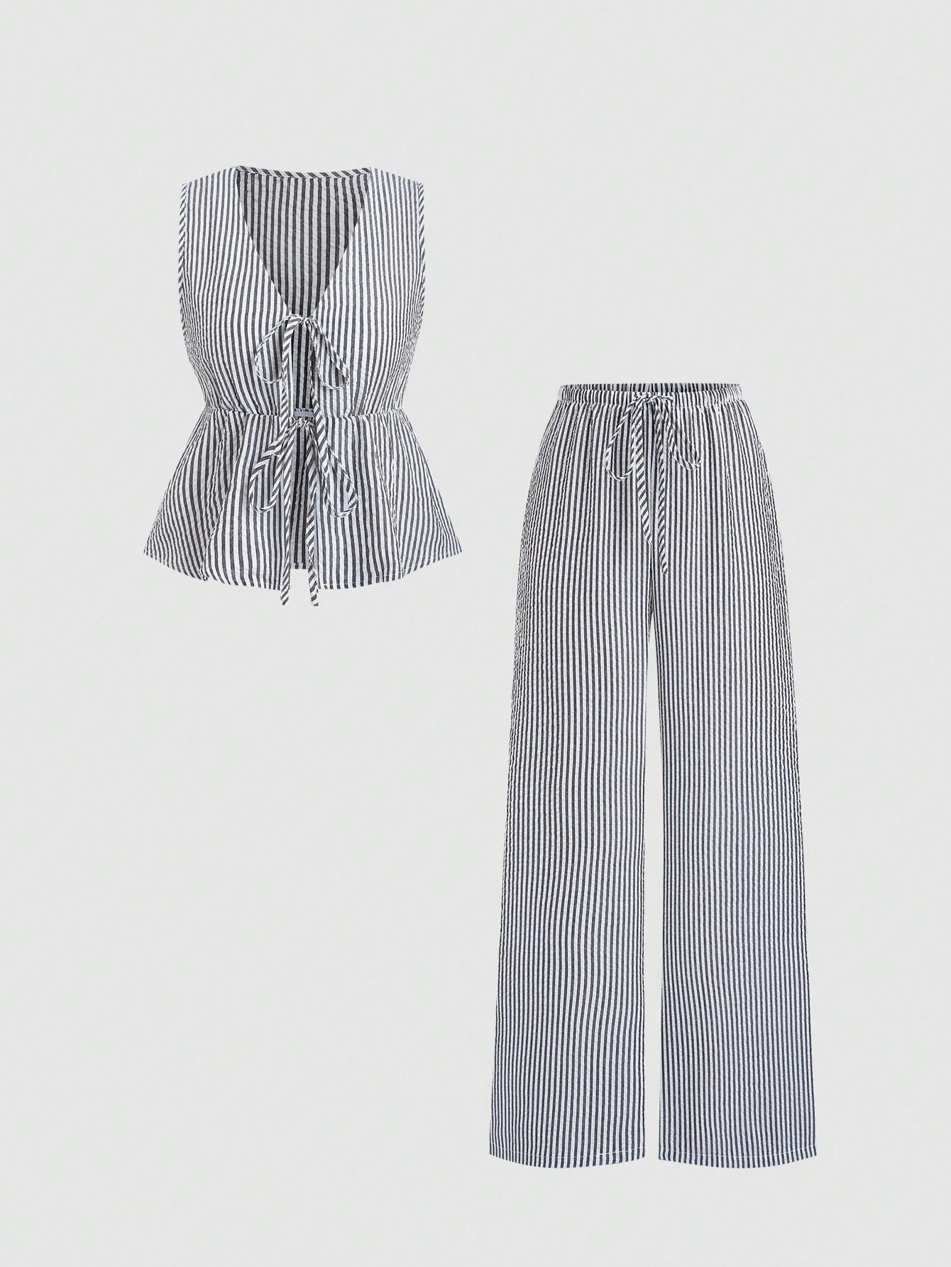 Летний однотонный полосатый костюм, повседневный универсальный жилет на шнуровке, свободные однотонные брюки на шнуровке, повседневный милый костюм