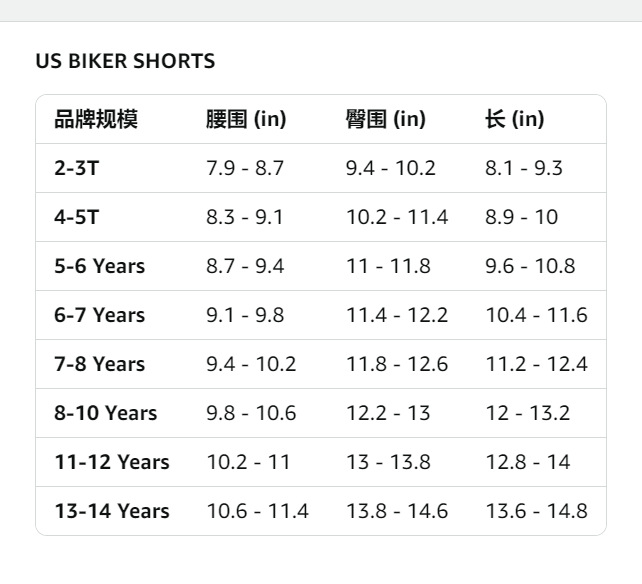 2–3Т; 4–5Т; 5–6 лет; 6-7Y; 7–8 лет; 8–10 лет; 11–12 лет; 13–14 лет