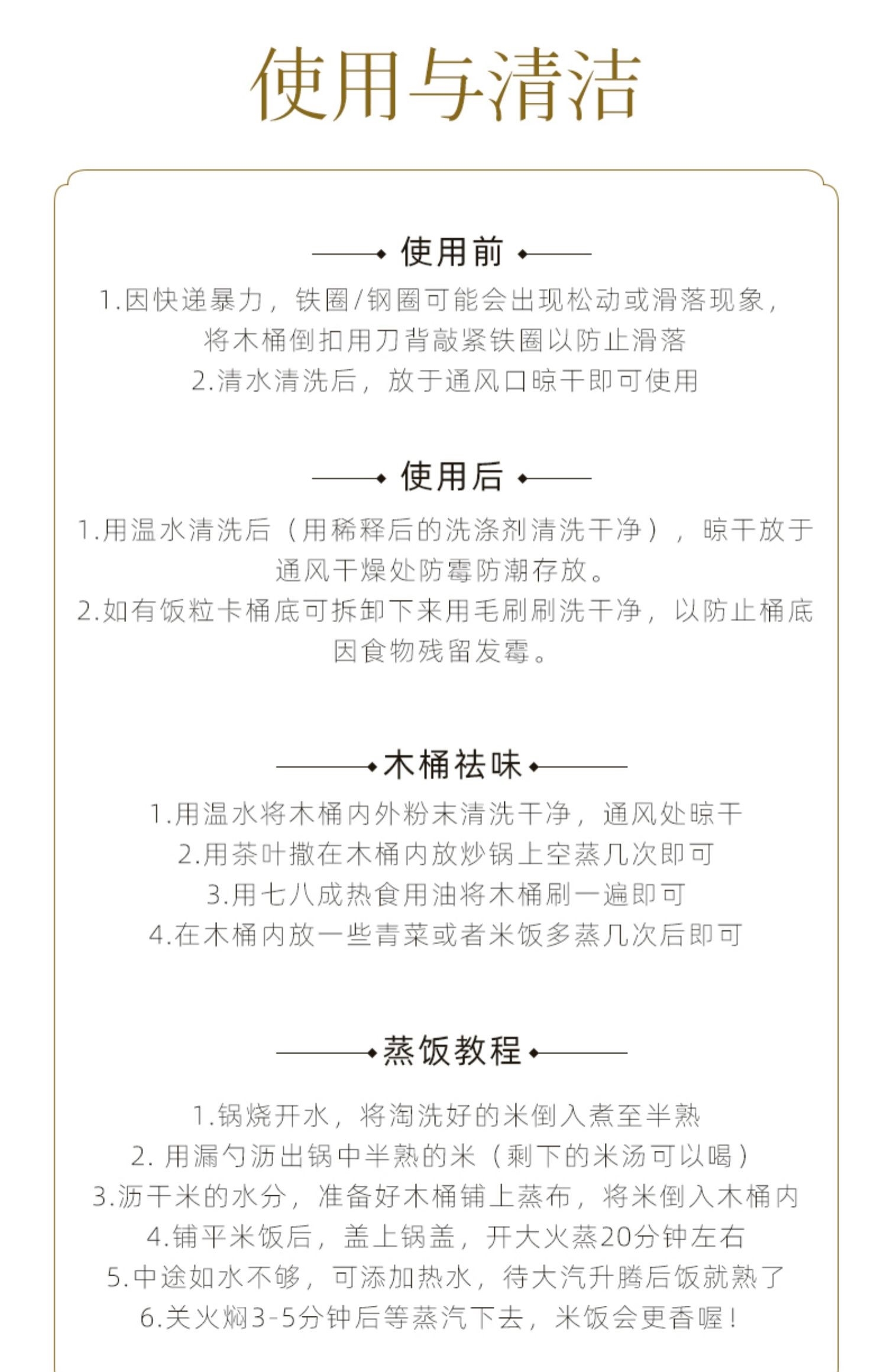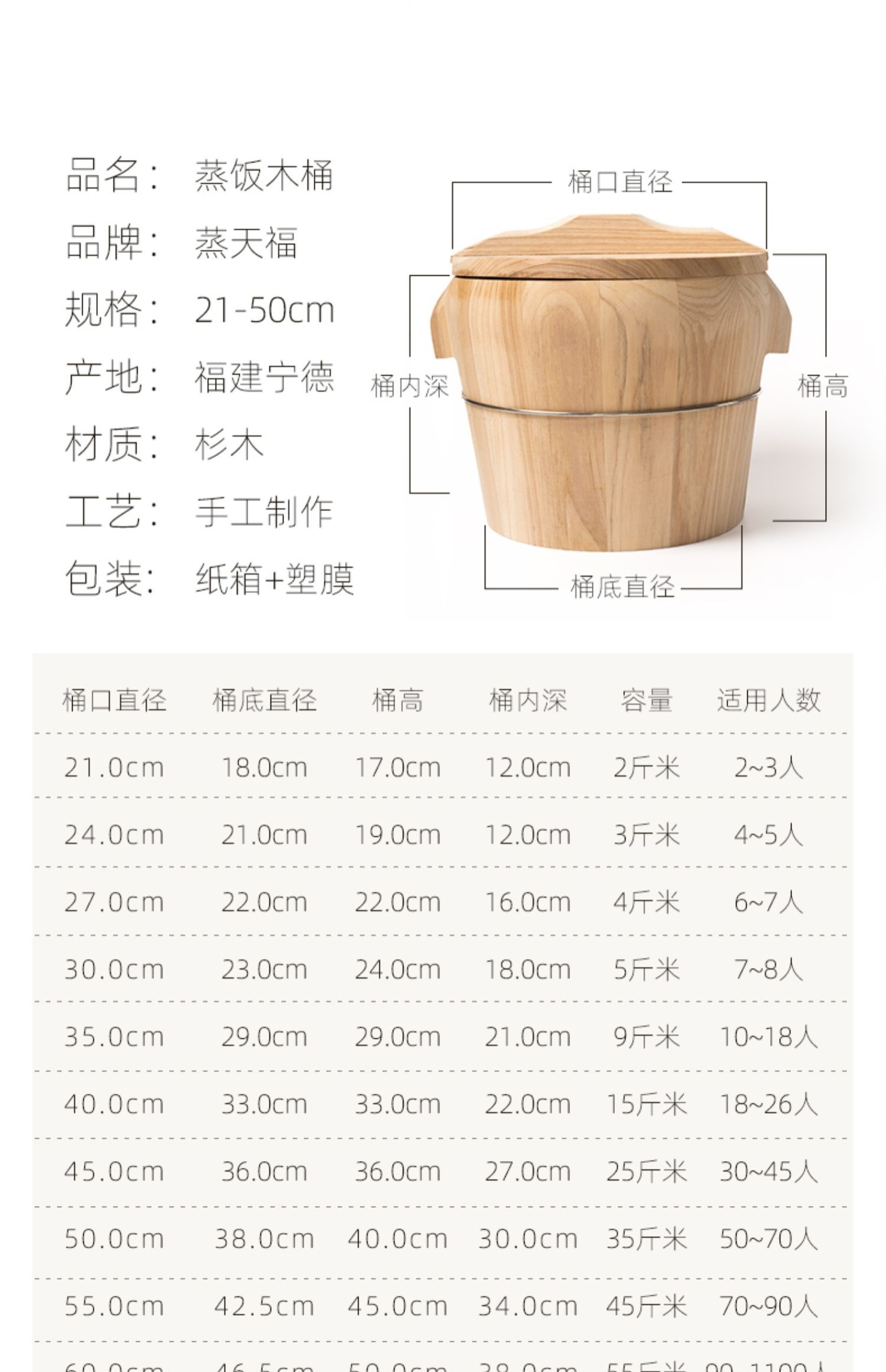 Деревянный бочонок с изогнутыми краями 21см + крышка ручки + обычное деревянное дно (1-3 человека на 1.0kg сырого риса); Деревянный бочонок с изогнутым краем 21см + крышка ручки + бамбуковое дно (1-3 человека на 1.0kg сырого риса); Деревянная бочка с изогнутым краем 24 см + крышка ручки + обычное деревянное дно (из 1.5kg необработанных рисов на 3-5 человек); Деревянный бочонок с изогнутыми краями 24см + крышка ручки + бамбуковое дно (3-5 человек на 1.5kg неприготовленный рис); Деревянный бочонок с изогнутыми краями 27см + крышка ручки + обычное деревянное дно (5-7 человек на 2kg сырого риса); Деревянный бочонок с изогнутыми краями 27см + крышка ручки + бамбуковое дно (5-7 человек на 2kg неприготовленный рис); Деревянная бочка с изогнутым краем 30см + крышка ручки + обычное деревянное дно (2.5kg сырого риса, 7-10 человек); Деревянная бочка с изогнутым краем 30 см + крышка ручки + бамбуковое дно (2.5kg необработанных риса, 7-10 человек); Ведро с прямыми сторонами 35см + крышка ручки + обычное деревянное дно (на 10-15 человек 4.5kg неоваренных риса); Ведро с прямыми сторонами 35см + крышка ручки + бамбуковое дно (10-15 человек на 4.5kg неоваренного риса); Ведро с прямыми сторонами 40см + крышка ручки + обычное деревянное дно (18-26 человек на 7.5kg сырого риса); Ведро с прямыми сторонами 40 см + крышка с ручкой + бамбуковое дно (неваренный рис 7.5kg шт., 18-26 человек); Ведро с прямыми сторонами 45 см + крышка с ручкой + обычное деревянное дно (из расчета 12.5kg сырого риса, 30-45 человек); Ведро с прямыми сторонами 45см + крышка ручки + бамбуковое дно (30-45 человек на 12.5kg неприготовленный рис); Ведро с прямыми сторонами 50см + крышка ручки + обычное деревянное дно (50-70 человек на 17.5kg неоваренных риса); Ведро с прямыми сторонами 50см + крышка ручки + бамбуковое дно (50-70 человек на 17.5kg неприготовленный рис); Ведро с прямыми сторонами 55см + крышка ручки + обычное деревянное дно (70-90 человек на 22.5kg сырого риса); Ведро с прямой стороной 60см + крышка ручки + обычное деревянное дно (27.5kg сырого риса 90-110 человек); Ведро прямогранное 65см + крышка ручки + деревянное основание (120-135 человек 45kg неоваренных рисов)