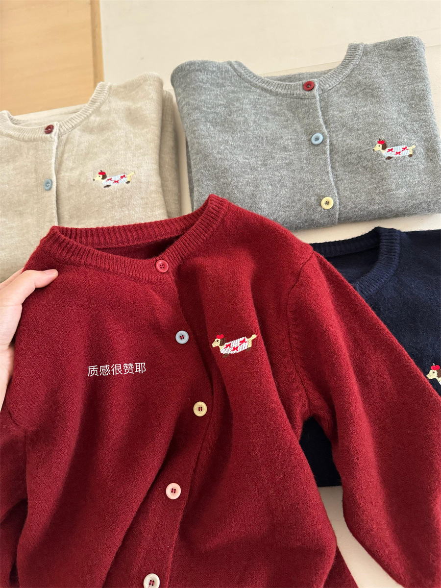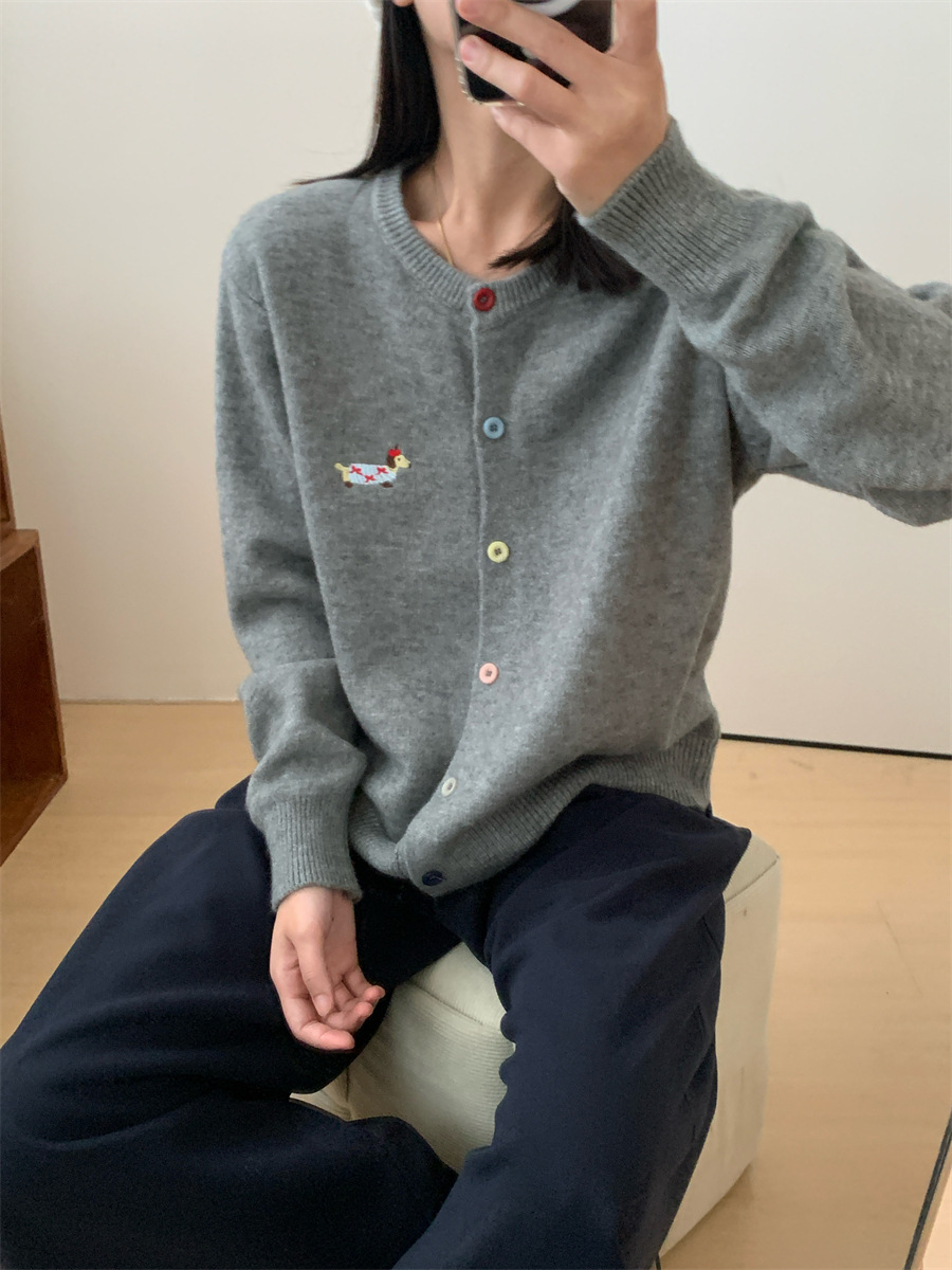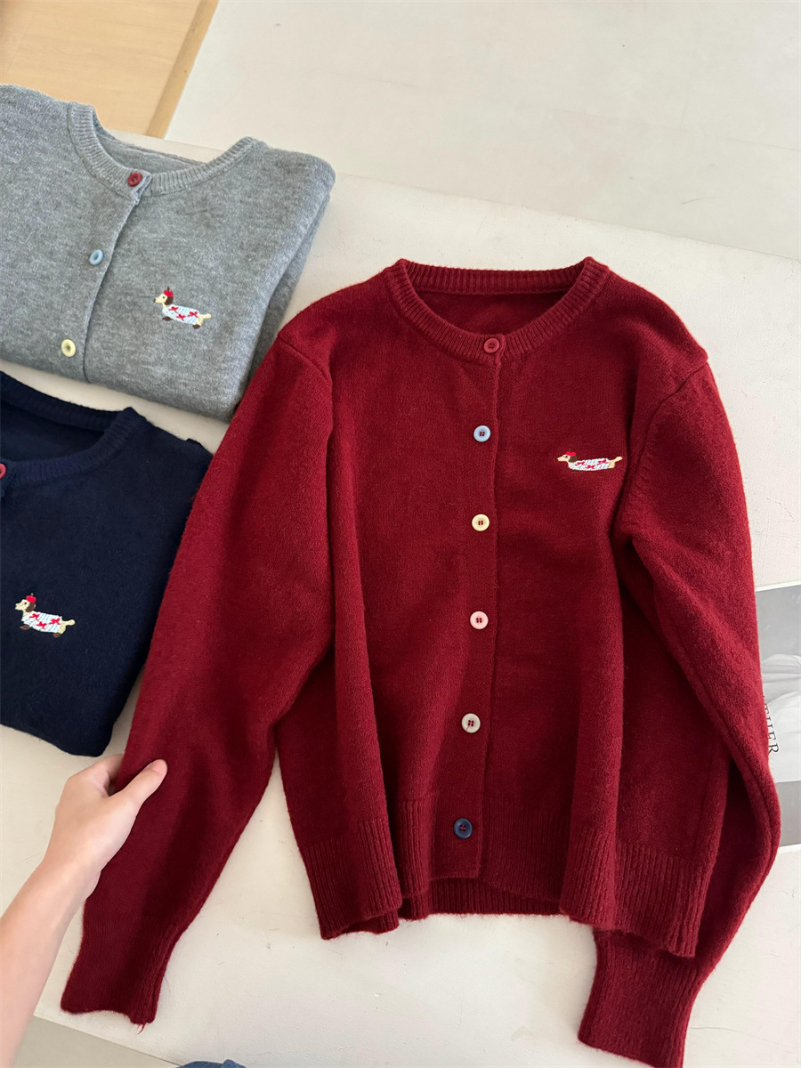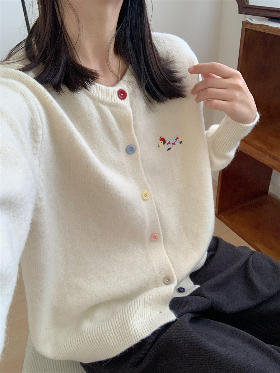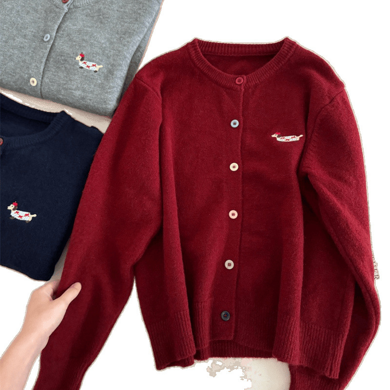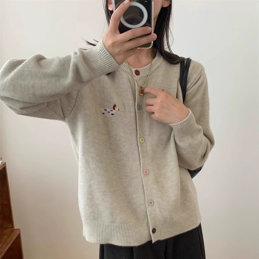Милый и простой стильный кардиган с круглым вырезом в виде таксы, осень 2024, новый универсальный трикотажный топ с вышивкой для похудения