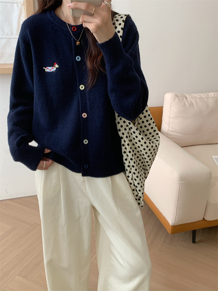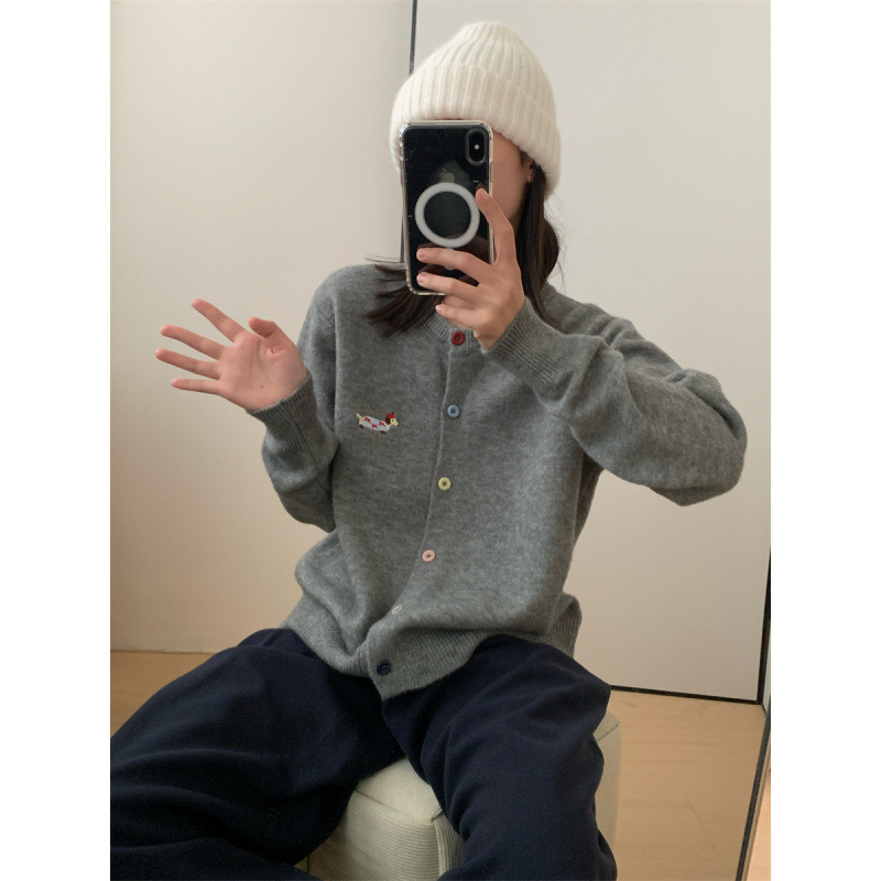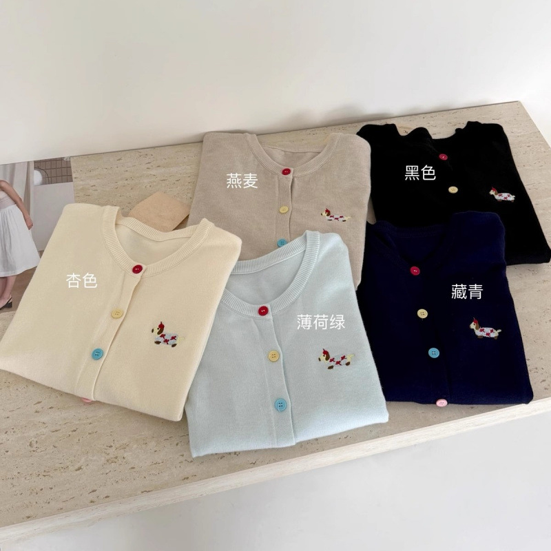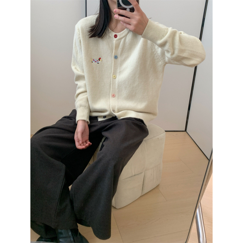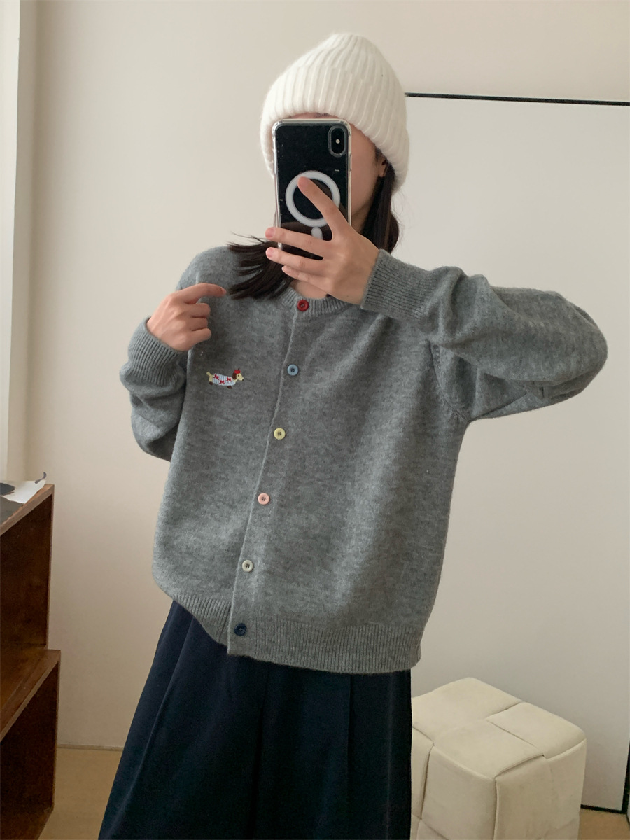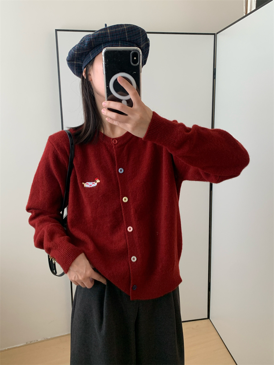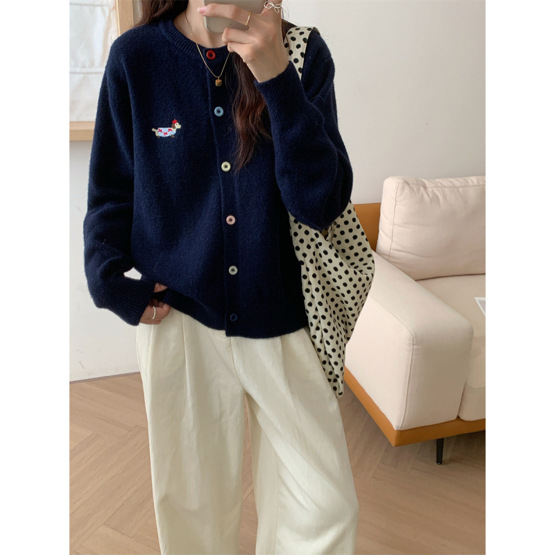 Милый и простой стильный кардиган с круглым вырезом в виде таксы, осень 2024, новый универсальный трикотажный топ с вышивкой для похудения