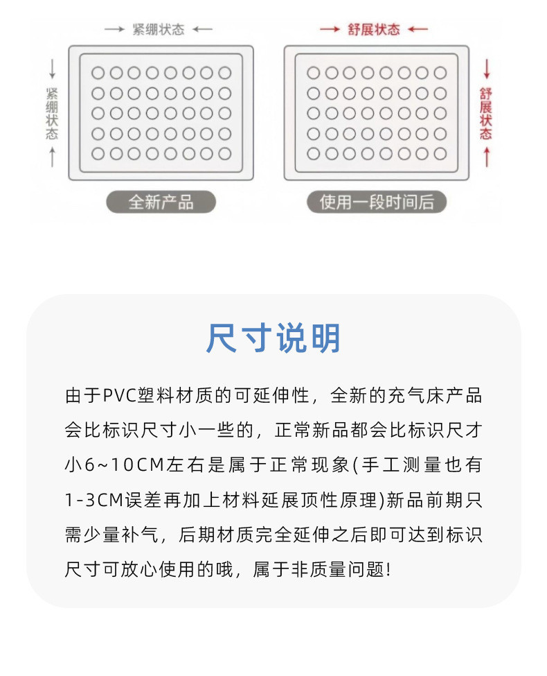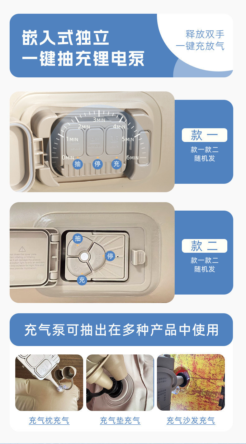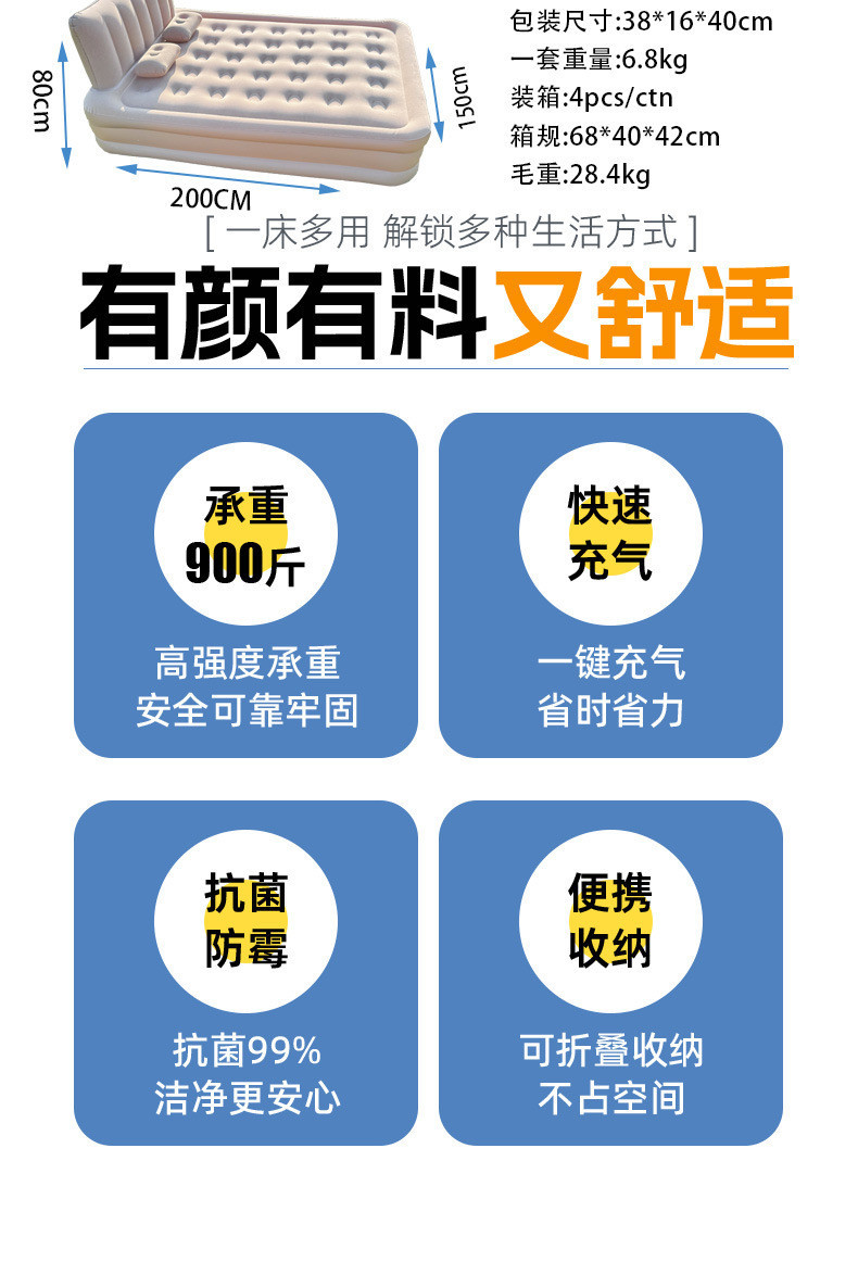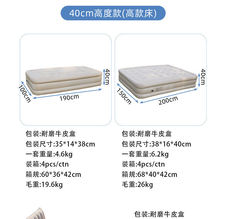 Высокий двуспальный 150х200х40см; Высокий одиночный 100х190х40см; Короткий двойной 150х200х25см; Короткий одинарный 100х190х25см; Модернизированная новая надувная кровать с двойной утолщенной спинкой 150*200*80 см; Внешний одиночный низкосортный ручной воздушный насос 100*190*25 см; Внешний двойной ручной насос низкой конфигурации 137*9190*25 см; Внешний двойной ручной насос низкой конфигурации 150*200*25 см