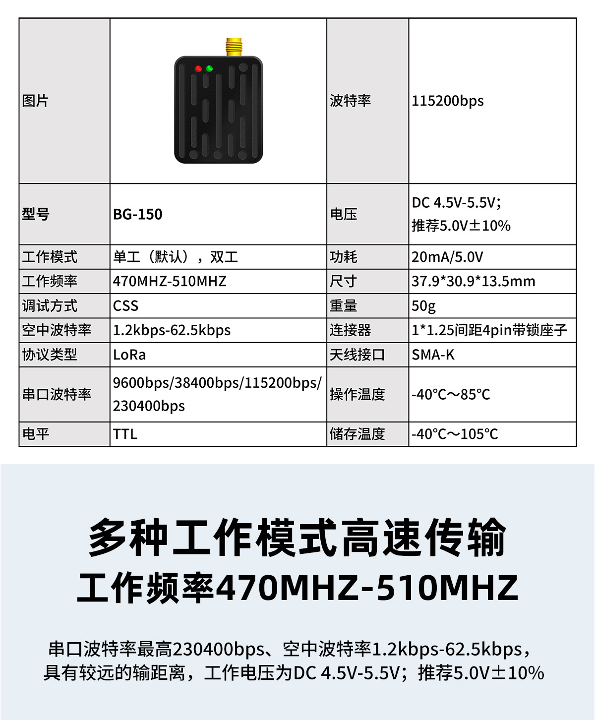 BG-150 (пара, уровень TTL, прозрачная передача один-к-одному); BG-150B (пара, уровень 232, прозрачная передача один-к-одному); BG-Y150 (одиночный, уровень TTL, передвижная станция); BG-Y150B (одиночный, уровень 232, мобильная станция); BG-J150 (одиночный, уровень TTL, базовая станция); BG-J150B (одиночный, уровень 232, базовая станция)