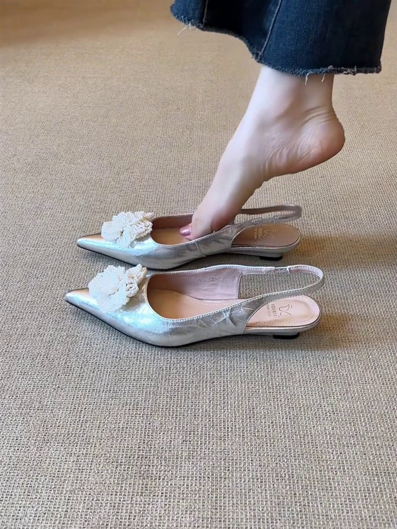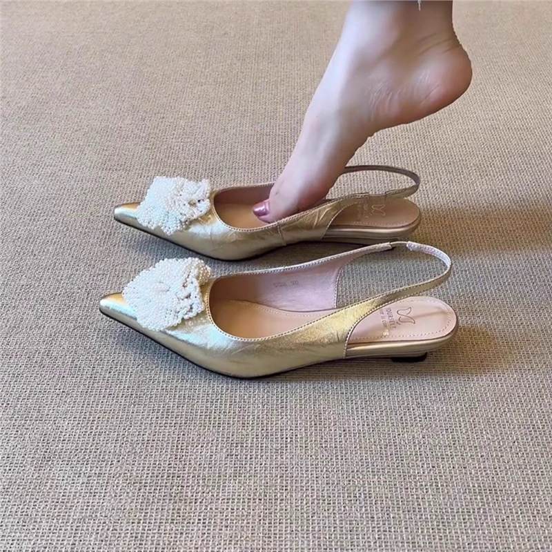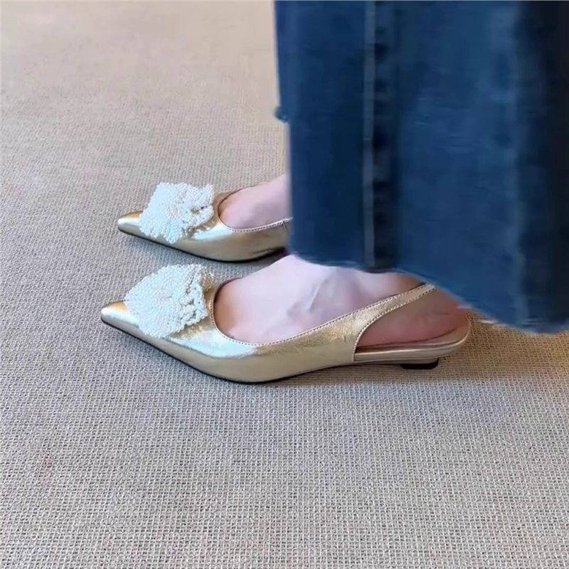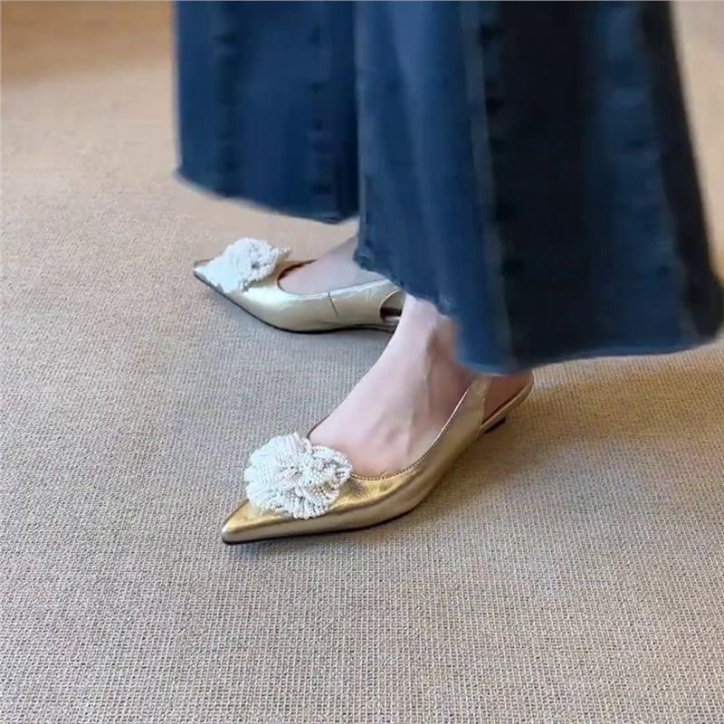 Версия из овчины ~ французский стиль ретро с открытой спиной, профессиональные цветочные сандалии, универсальные туфли-лодочки на низком каблуке с жемчужным острым носком