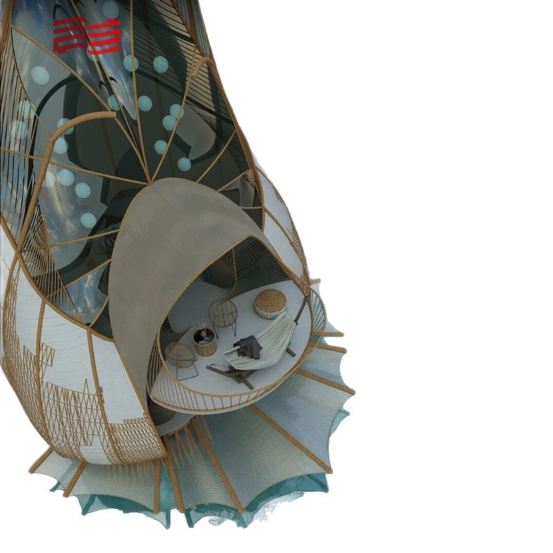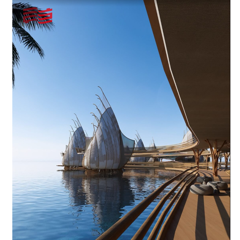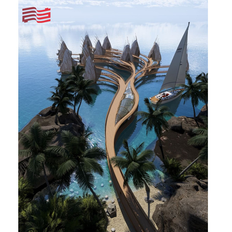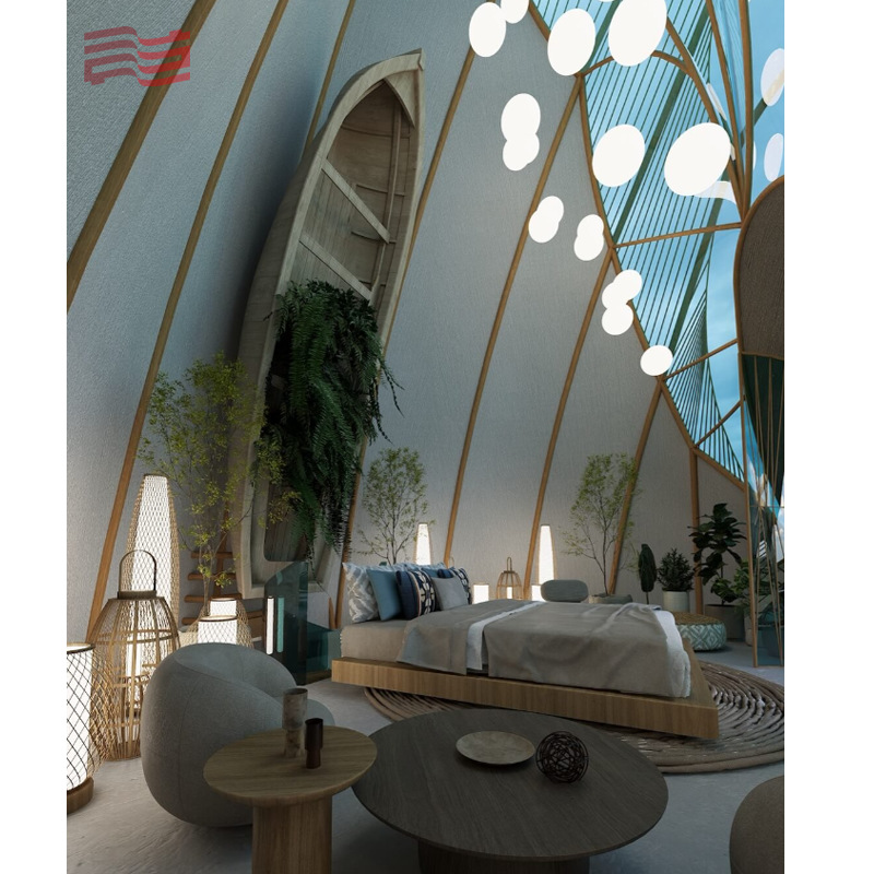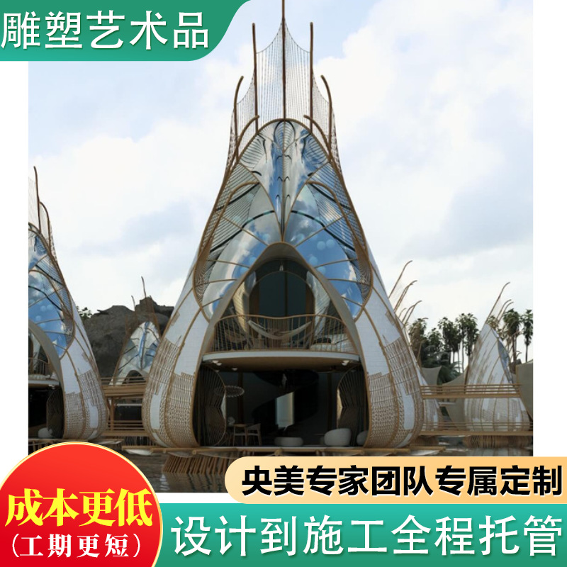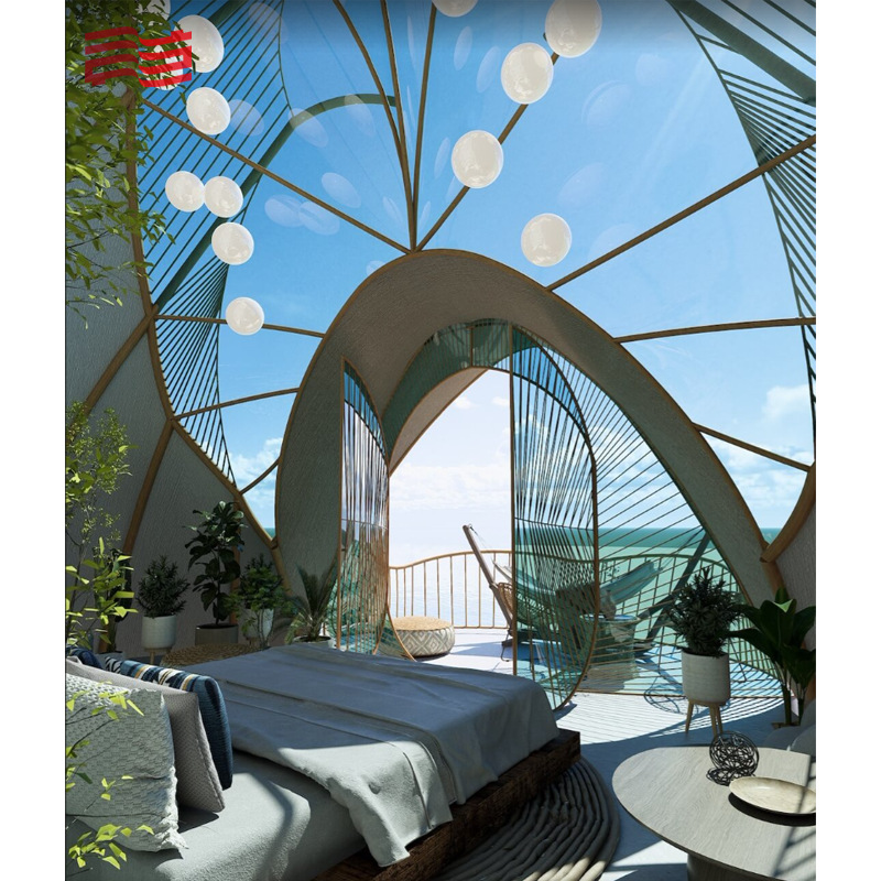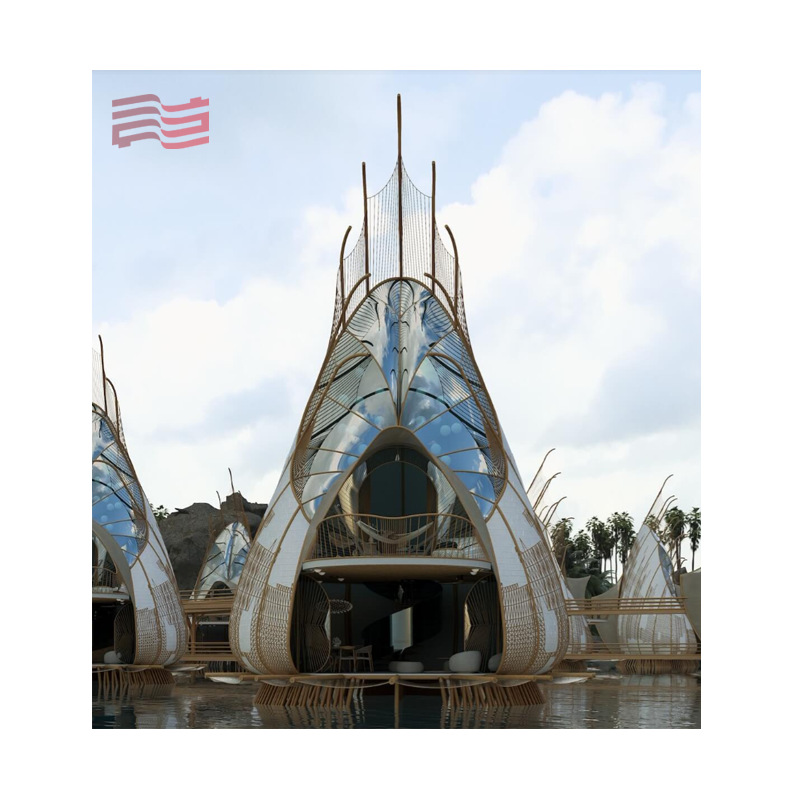 Креативная бамбуковая конструкция B&B для культурного туризма и отдыха, дом для отдыха на воде в стиле современного искусства, элитная туристическая архитектура в живописных местах.
