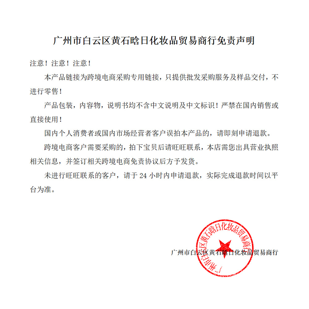 化妆品因生产批次不同,大小、颜色、包装、配件可能存在细微差异,是在合理范围内,如不能接受请勿拍。对于大批量采购的客户,如单次采购数量在500以上,考虑到退换货运输等问题,无质量问题不进行退换,如介意请慎拍。对于定制类订单, 一旦开始大货生产, 定金不退。