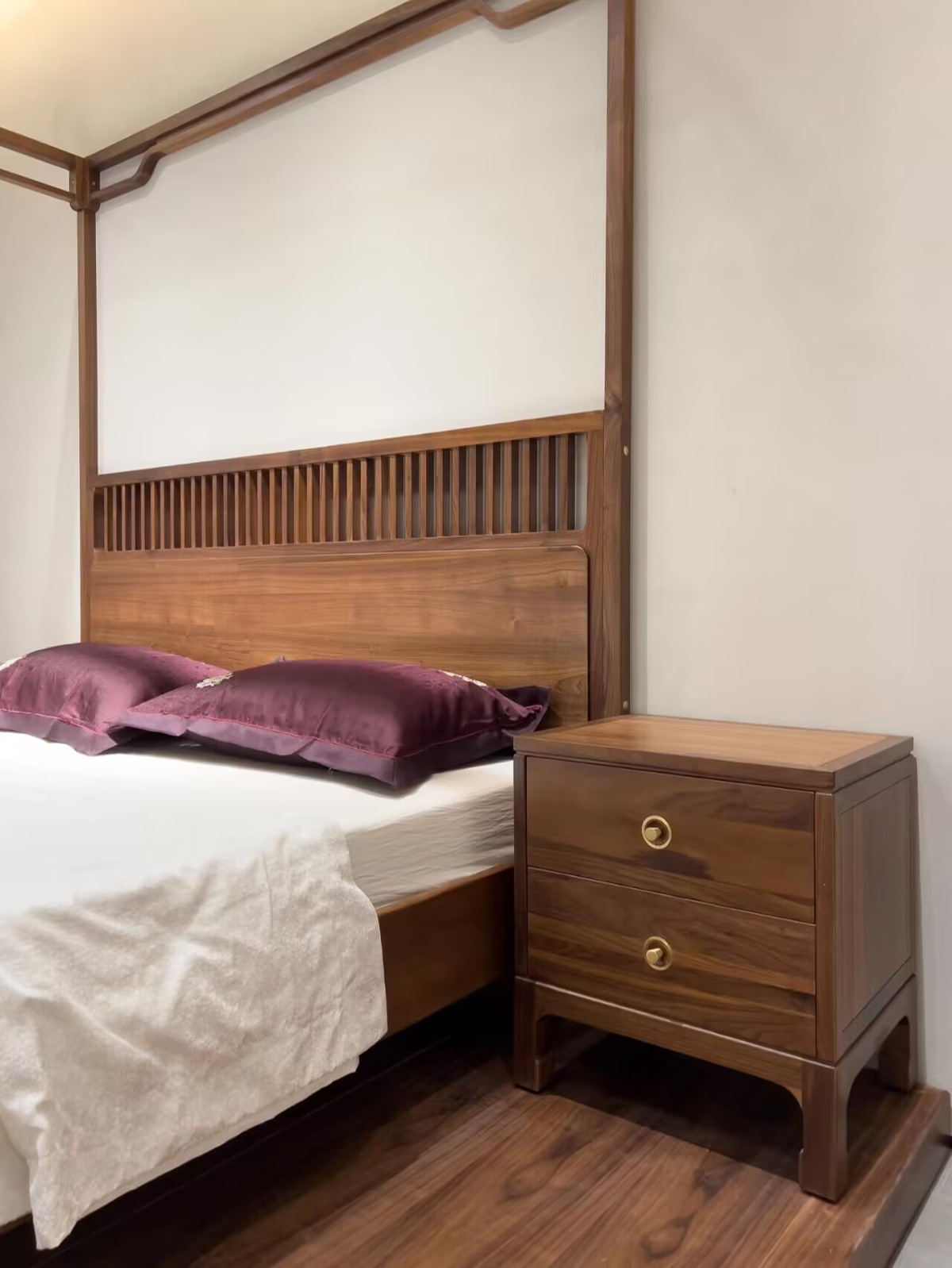 Полка-кровать (Североамериканский ясень); Прикроватная тумбочка (Североамериканский ясень); Кровать с балдахином (североамериканский черный орех); Прикроватная тумбочка (североамериканский черный орех); Цветной материал по индивидуальному размеру