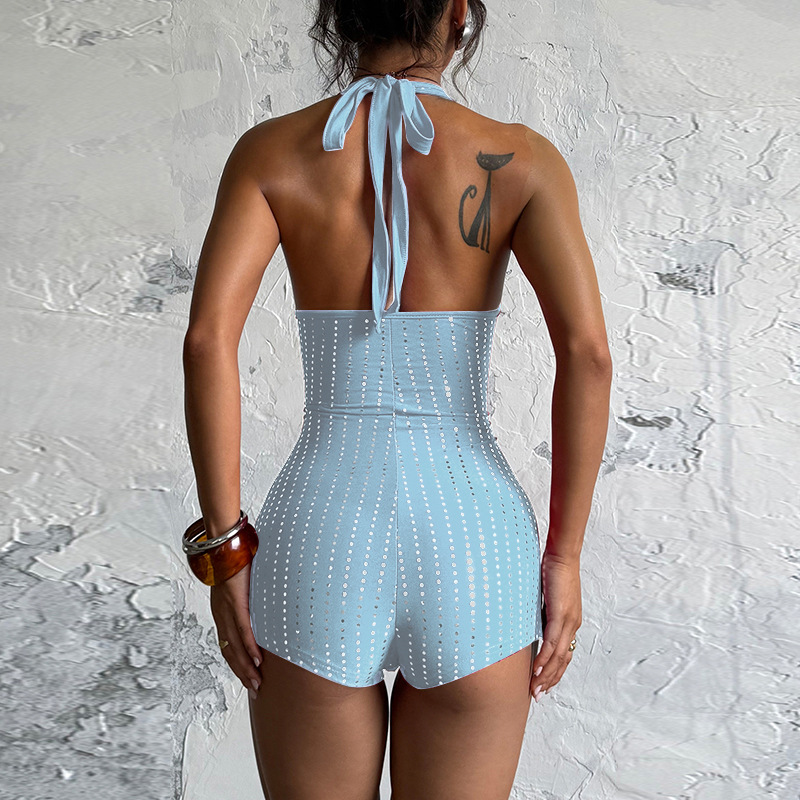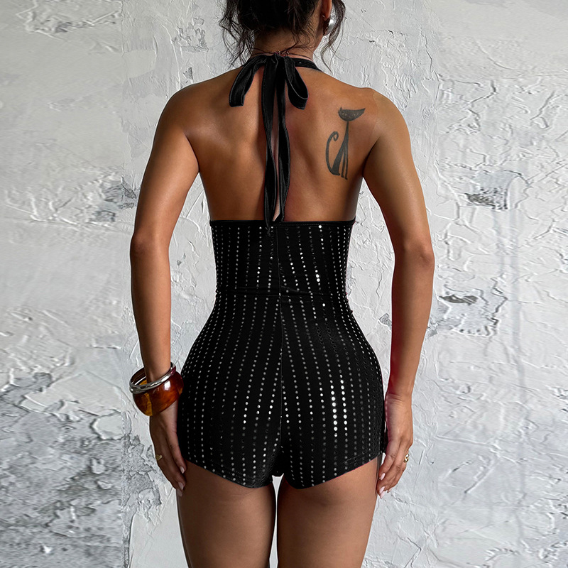 JY24589 Осень 2025 Новинка: Сексуальный облегающий комбинезон с глубоким V-образным вырезом и стразами в европейском и американском стиле, женская одежда