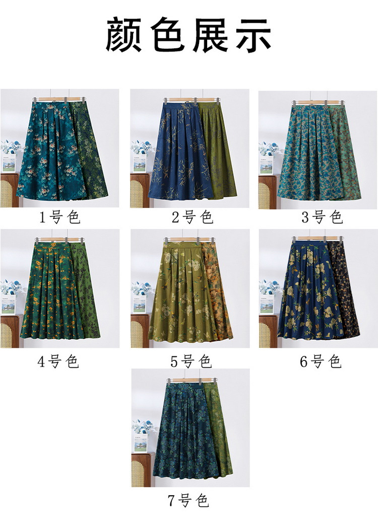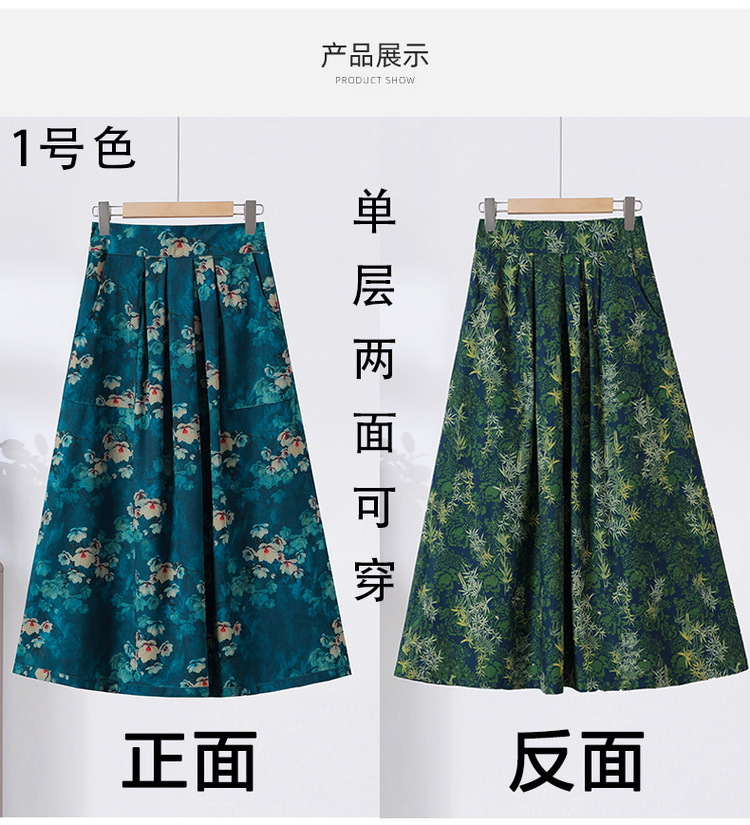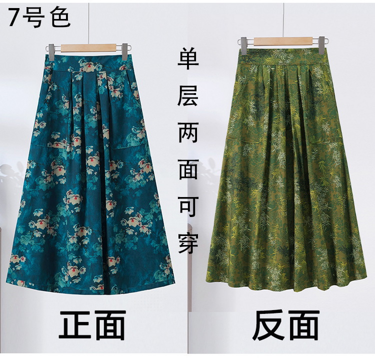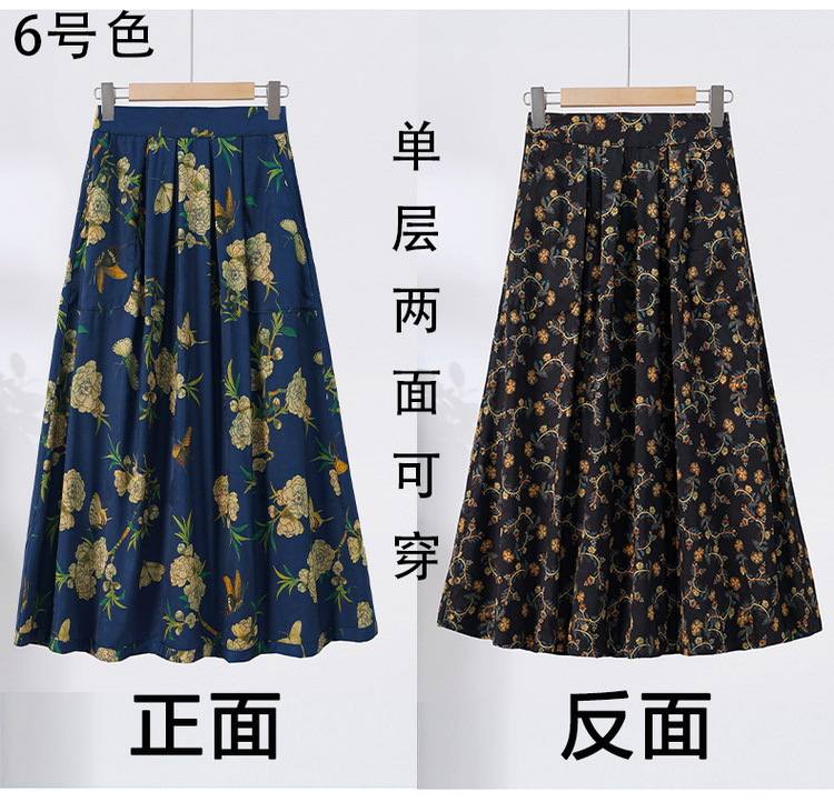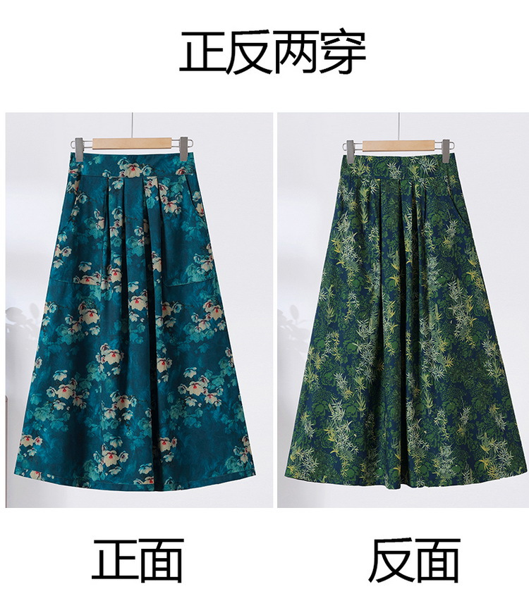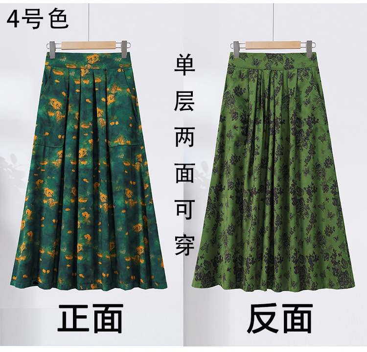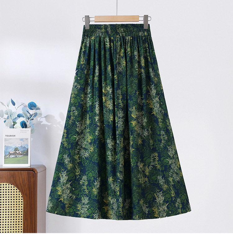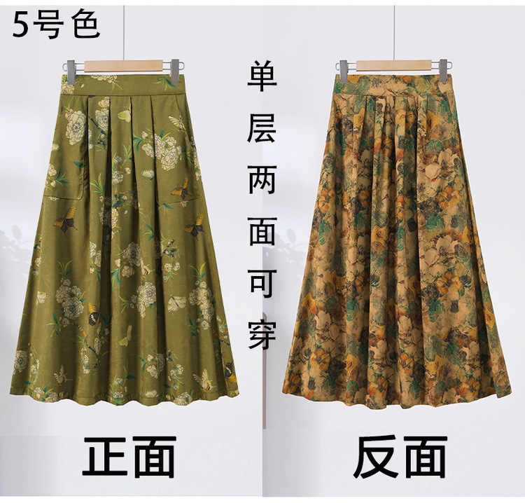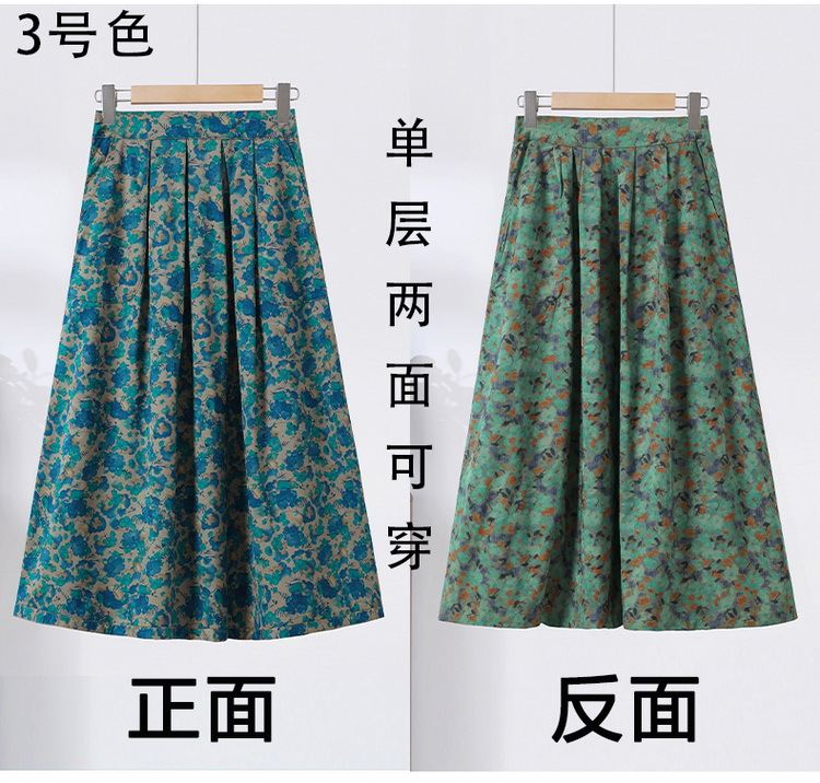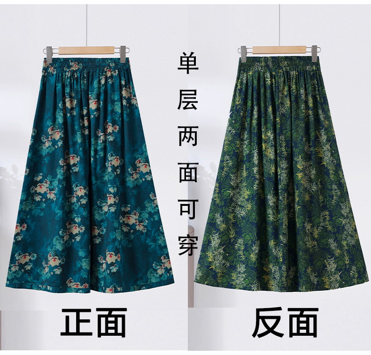 Двусторонняя юбка для мам, летняя высококачественная эластичная талия с принтом для людей среднего и пожилого возраста, стройнящая и элегантная юбка средней длины с широким подолом.