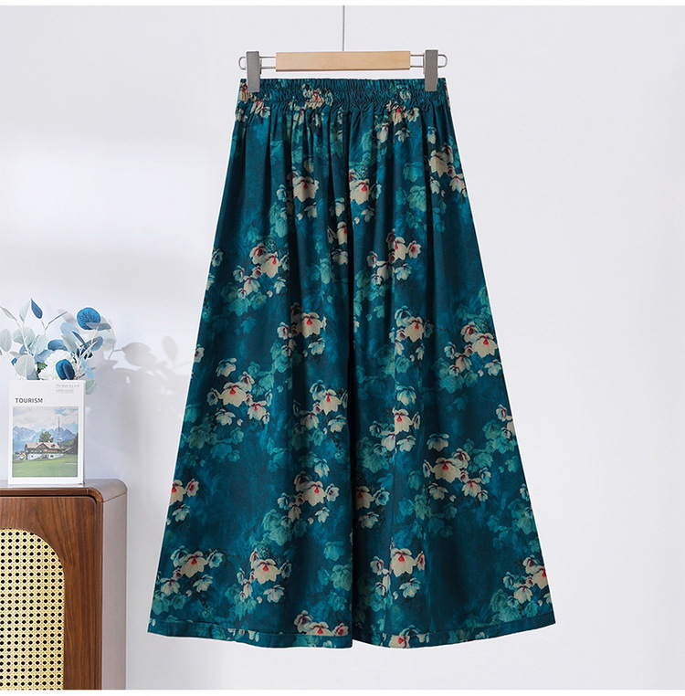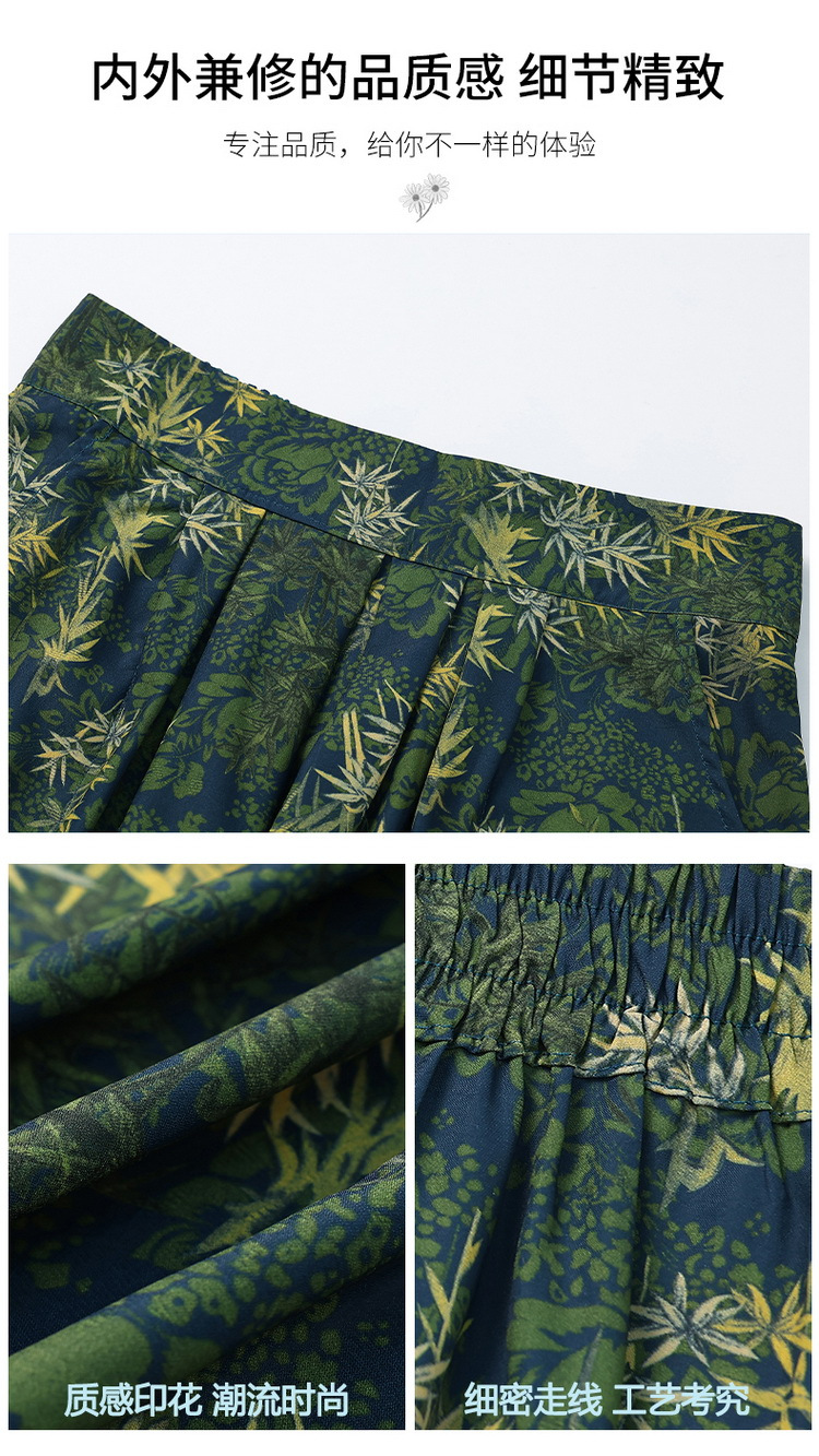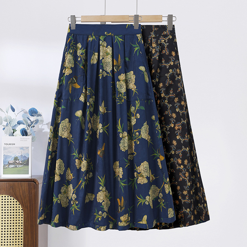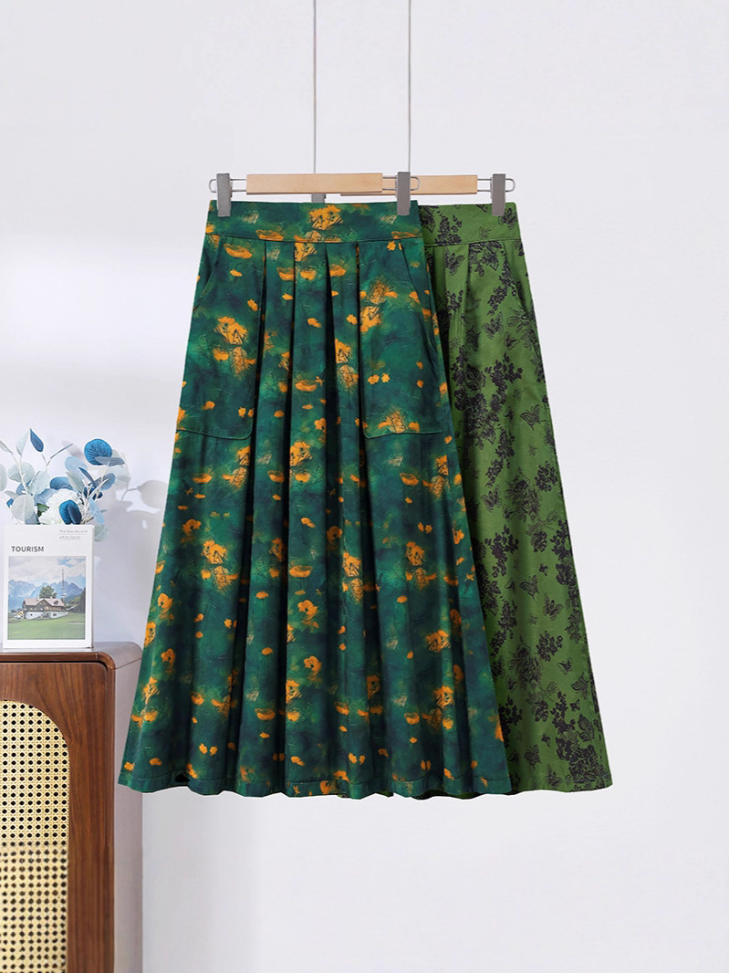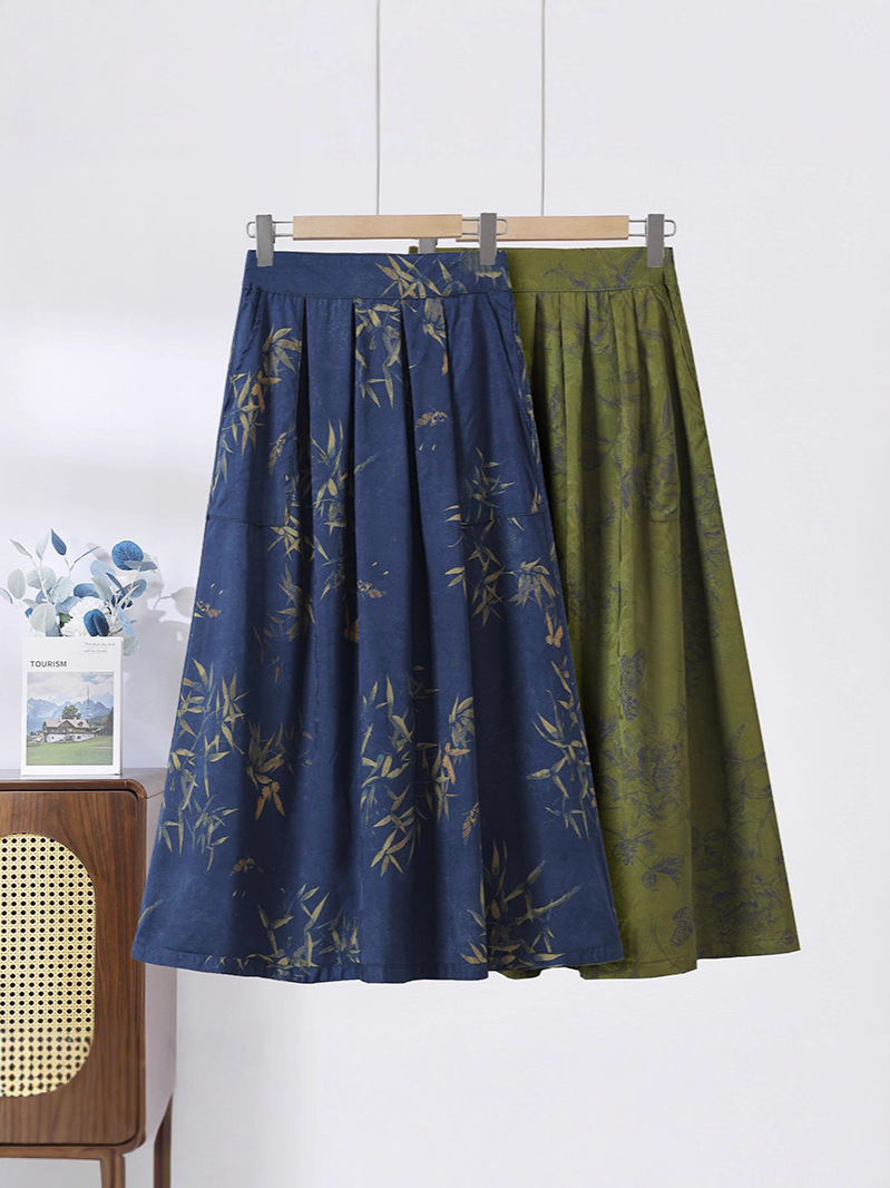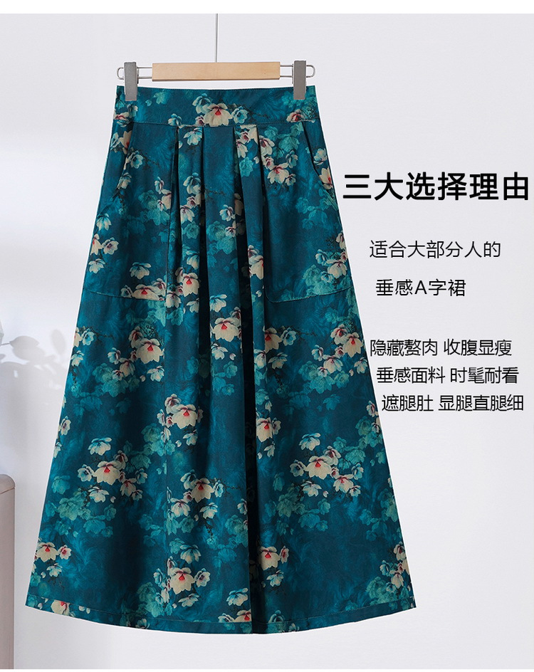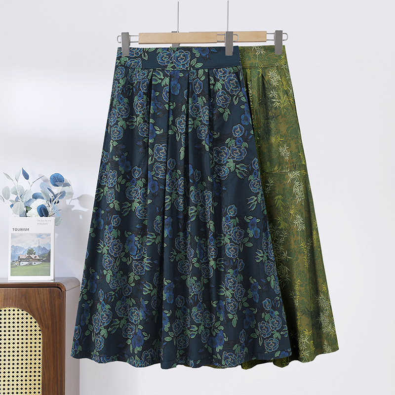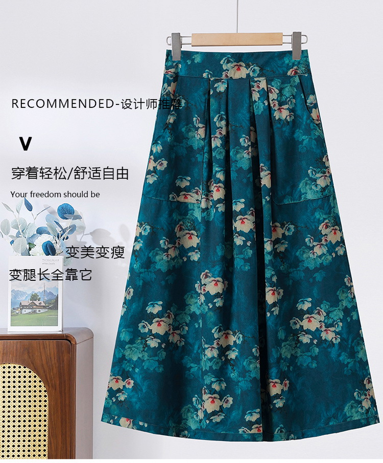 Двусторонняя юбка для мам, летняя высококачественная эластичная талия с принтом для людей среднего и пожилого возраста, стройнящая и элегантная юбка средней длины с широким подолом.