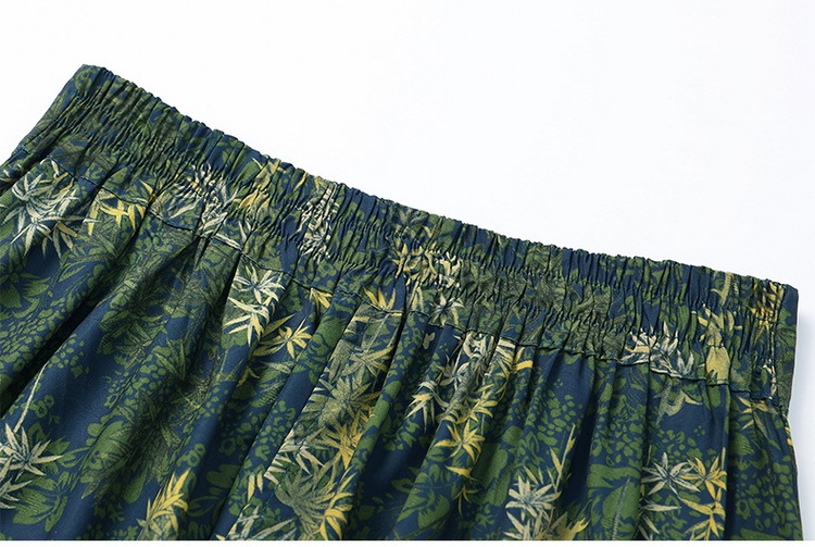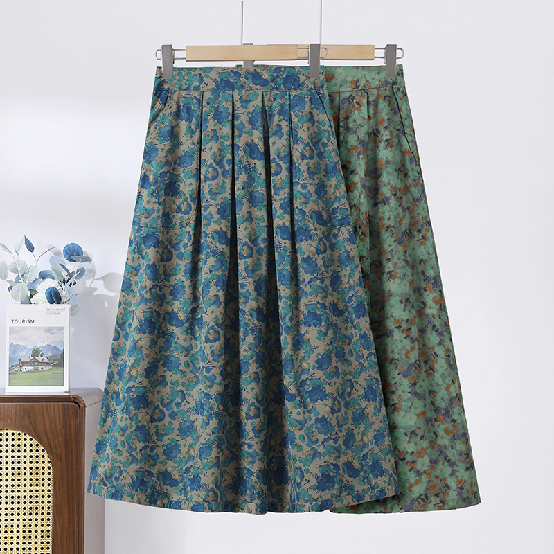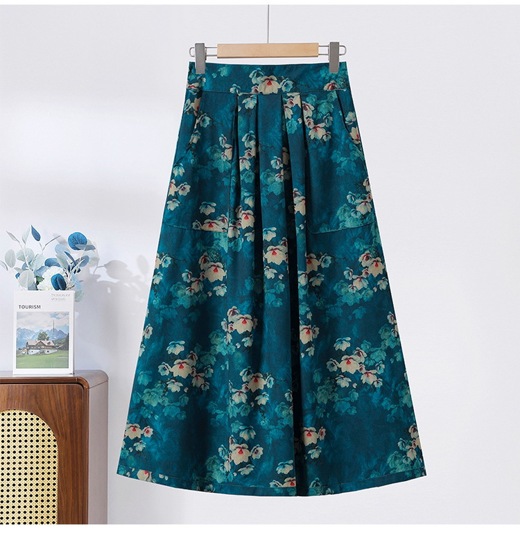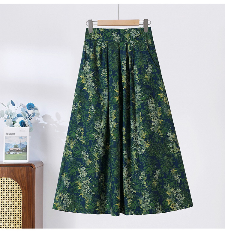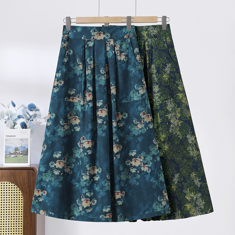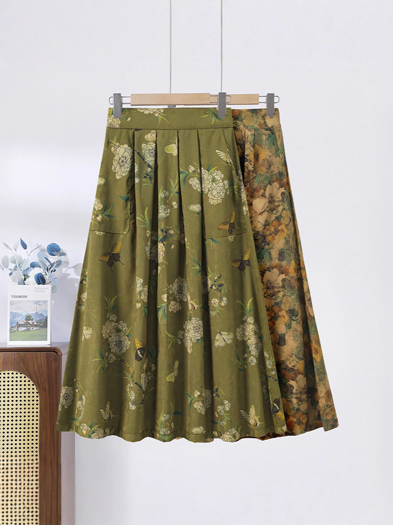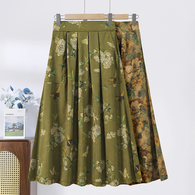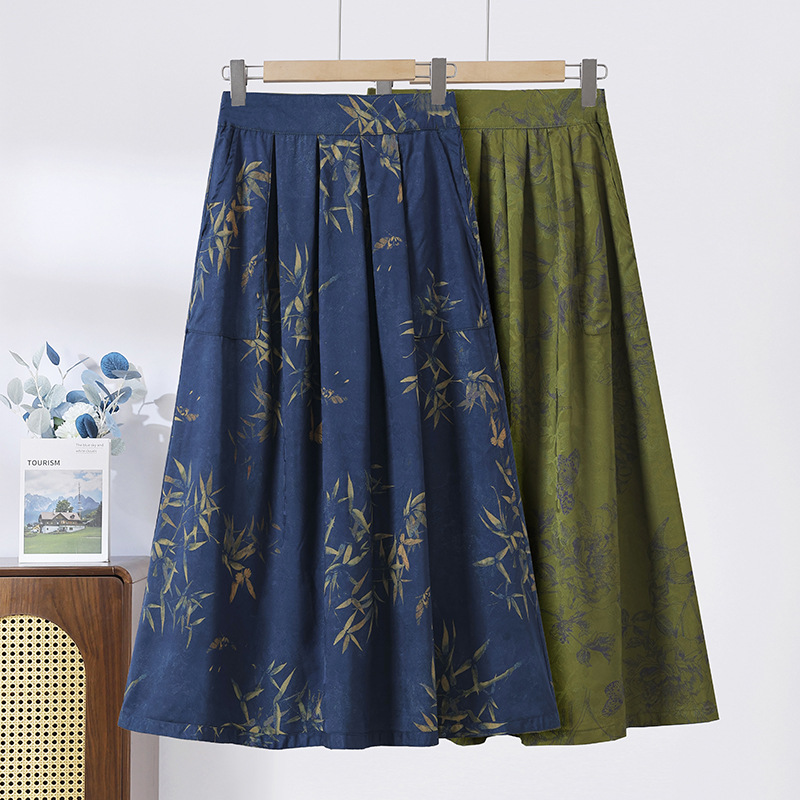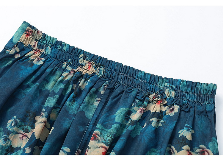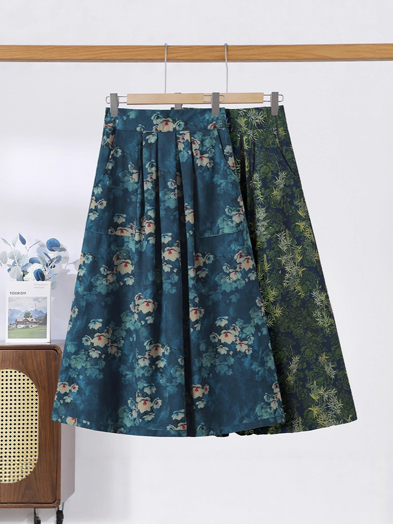 Двусторонняя юбка для мам, летняя высококачественная эластичная талия с принтом для людей среднего и пожилого возраста, стройнящая и элегантная юбка средней длины с широким подолом.